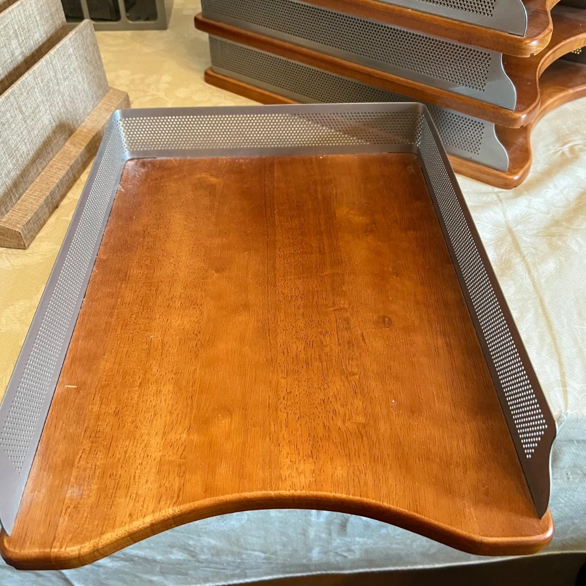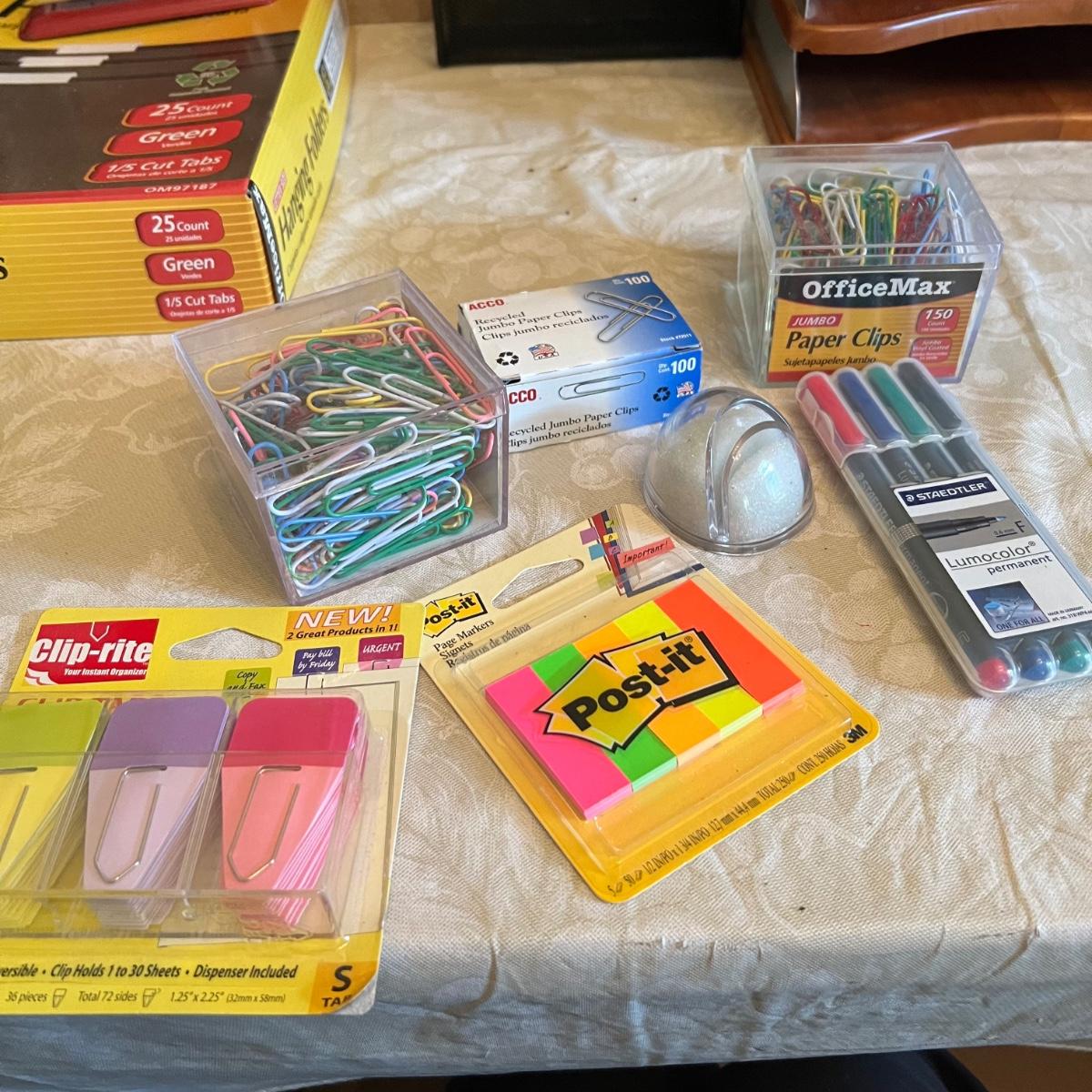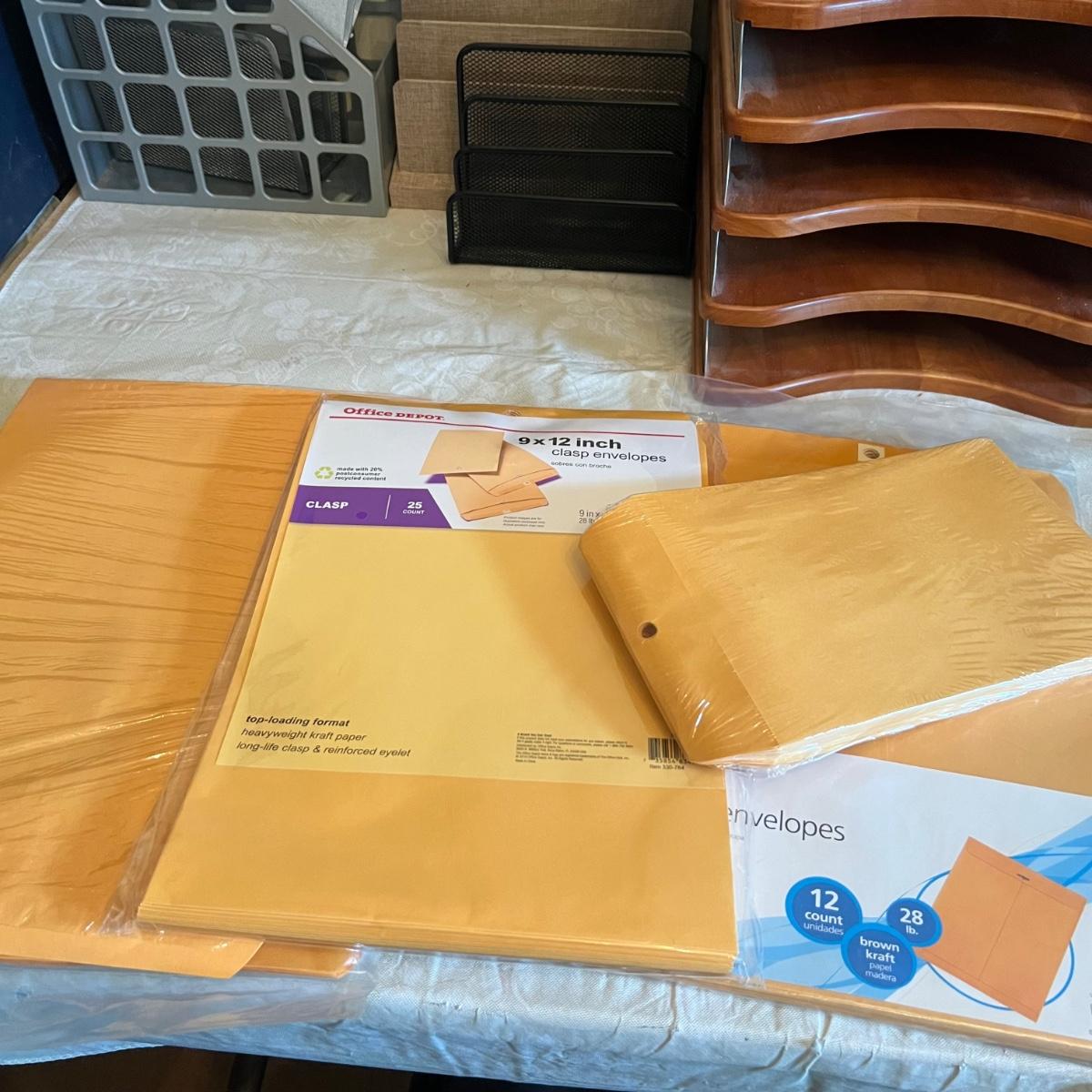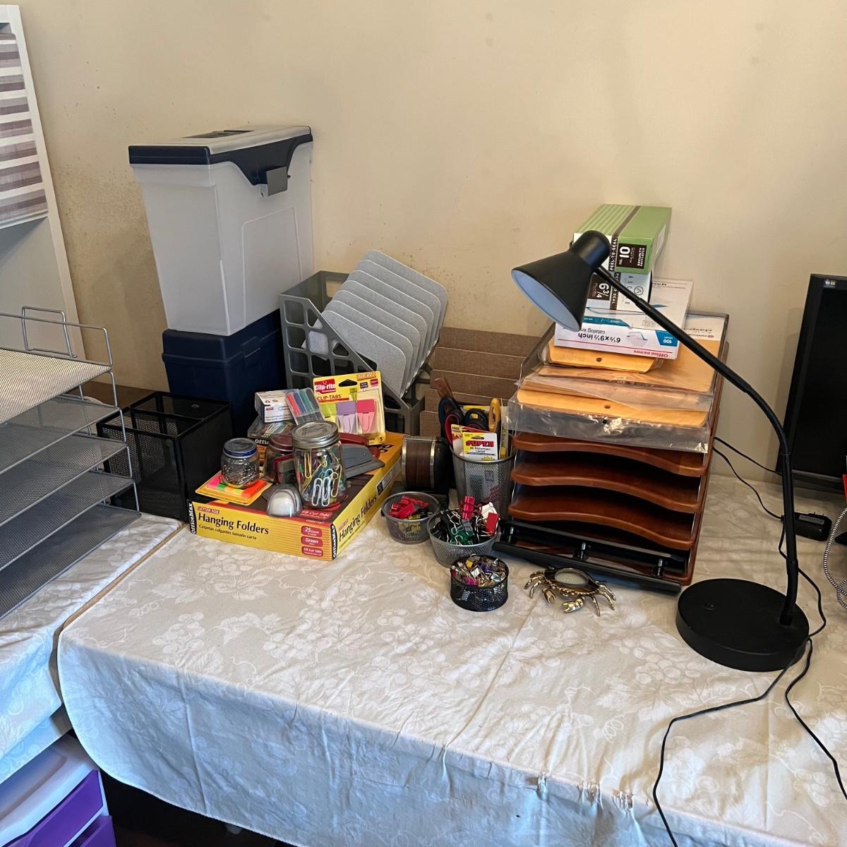 Large assortment of office supplies includes multiple inbox and file trays, desk lamp, envelopes, lots of paper clips, scissors, staplers and much more. The two multi tiered in-boxes come apart in one tray sections; wood/metal trays measure altogether 14” x 10” x 12”. The crab shaped desk ornament appears to be solid brass and measures 5” x 5” x 2”H.