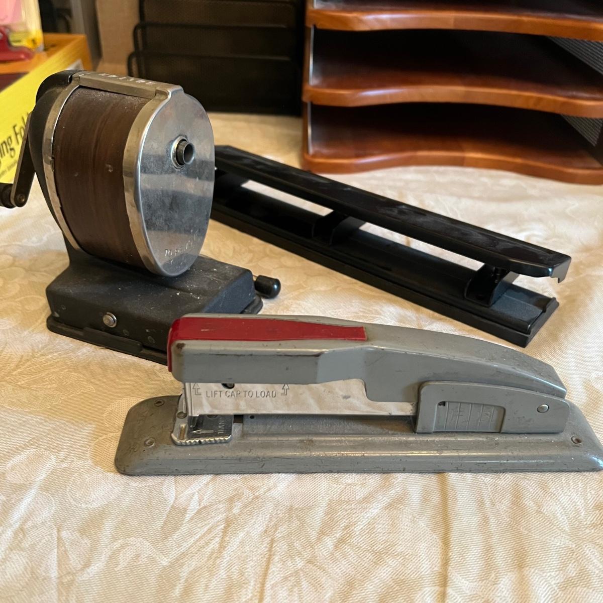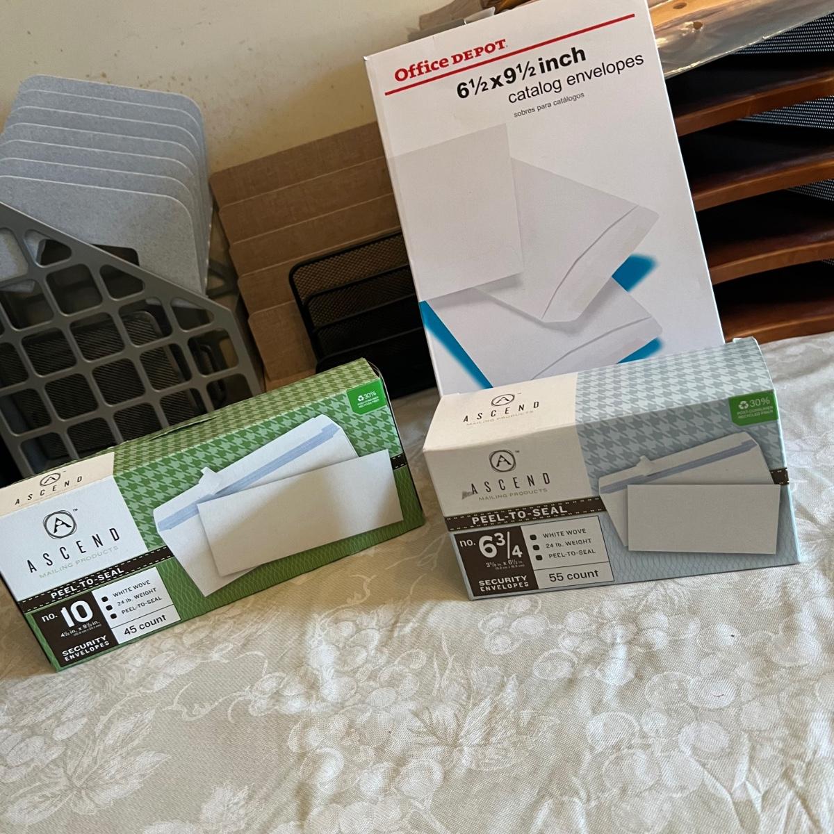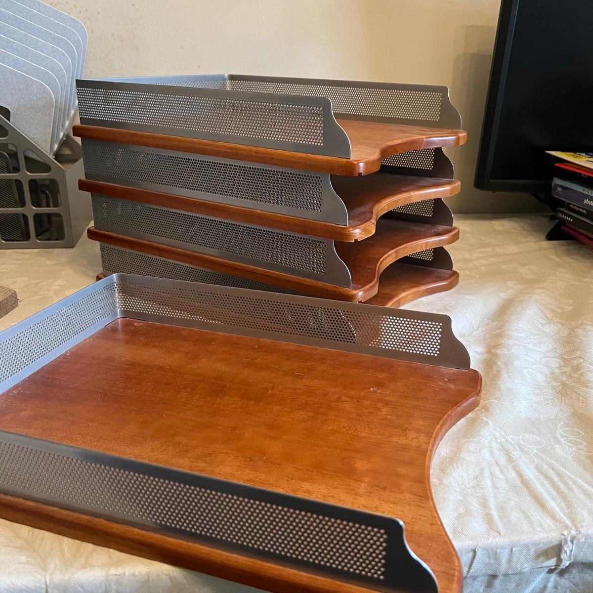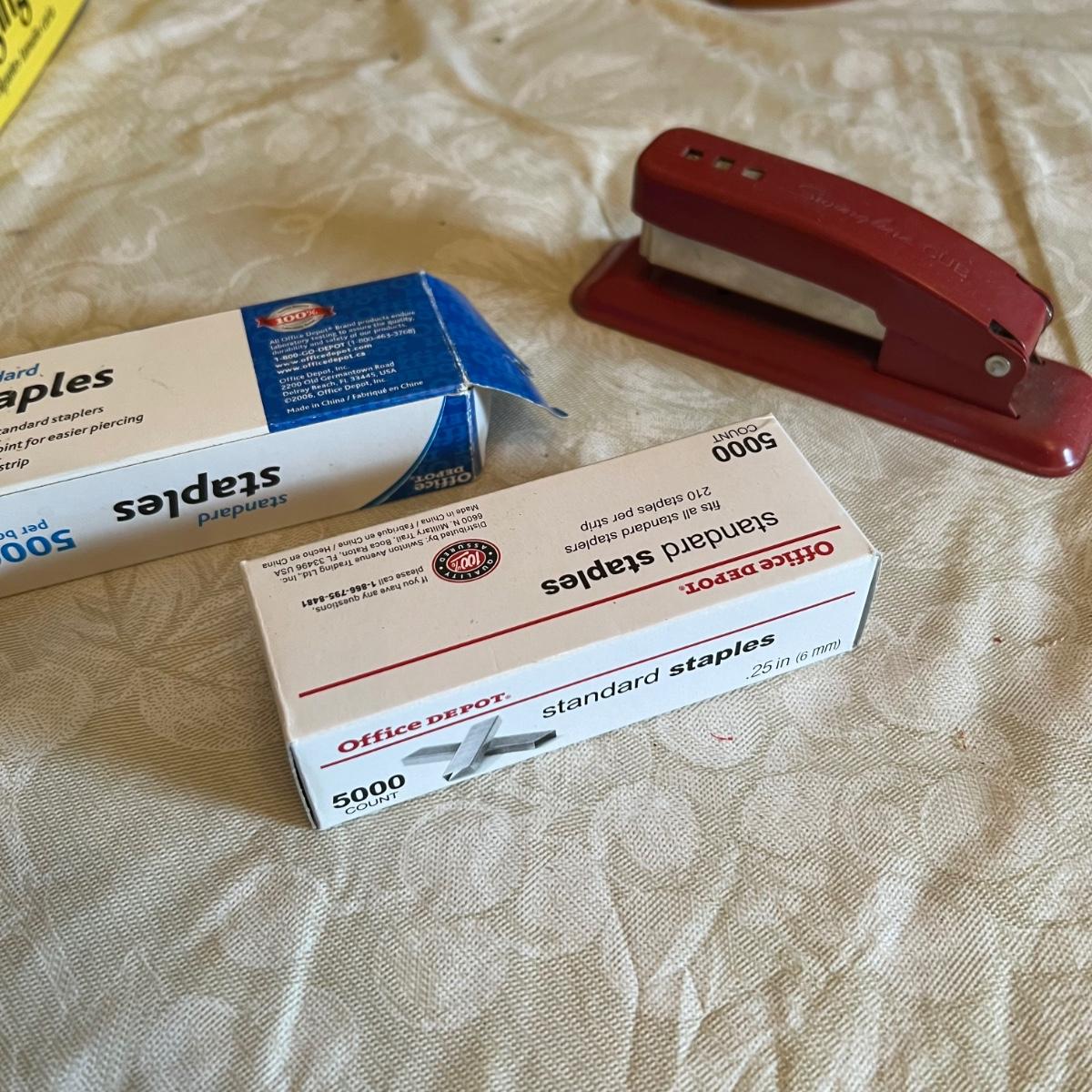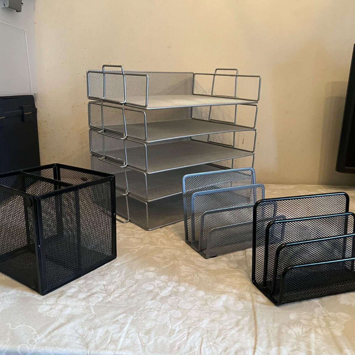 Large assortment of office supplies includes multiple inbox and file trays, desk lamp, envelopes, lots of paper clips, scissors, staplers and much more. The two multi tiered in-boxes come apart in one tray sections; wood/metal trays measure altogether 14” x 10” x 12”. The crab shaped desk ornament appears to be solid brass and measures 5” x 5” x 2”H.