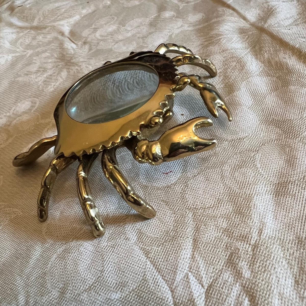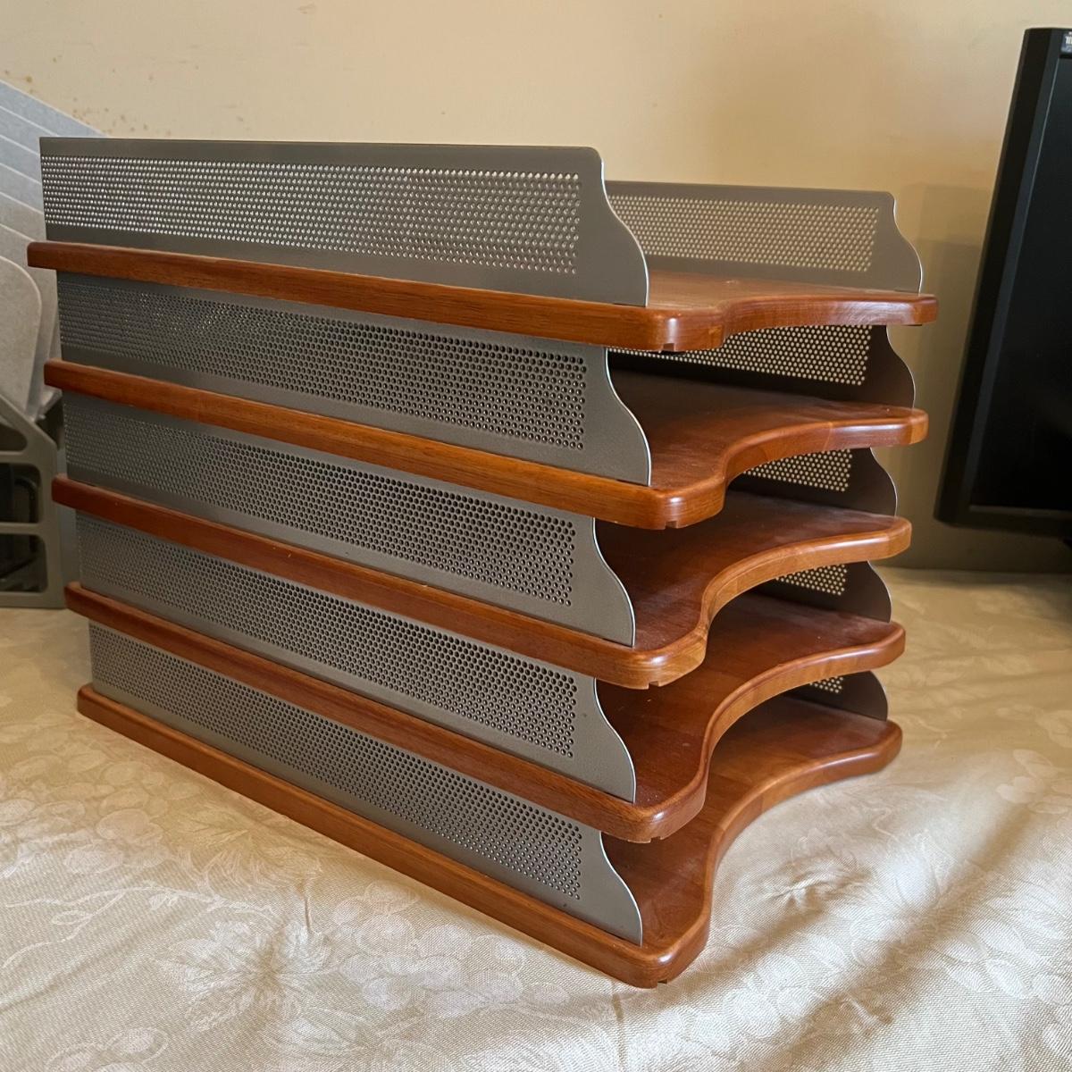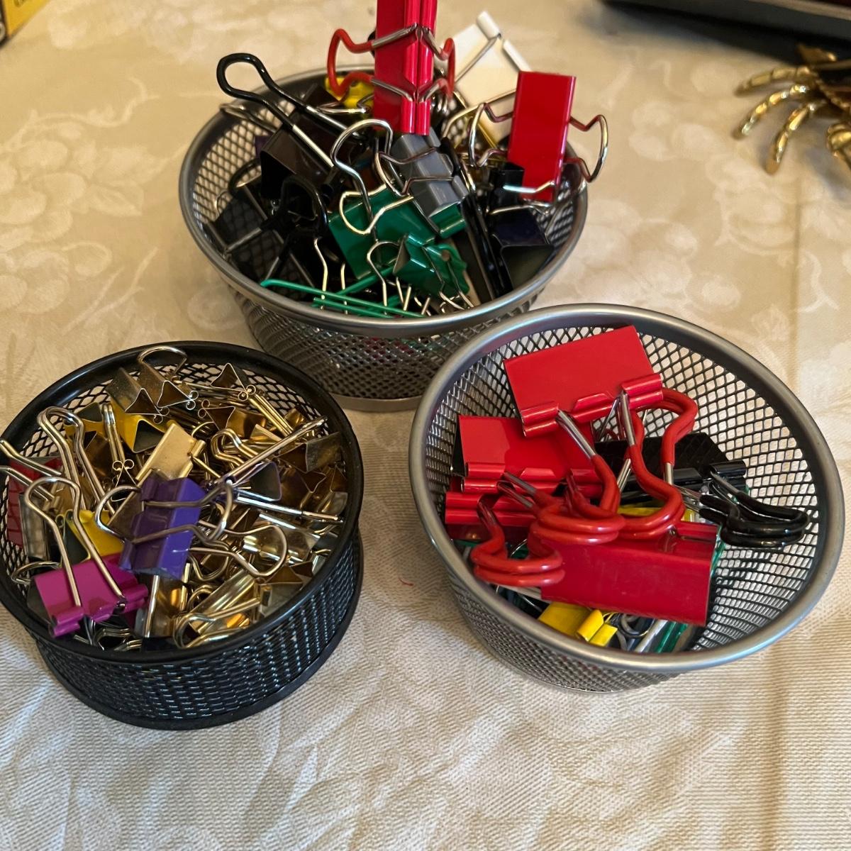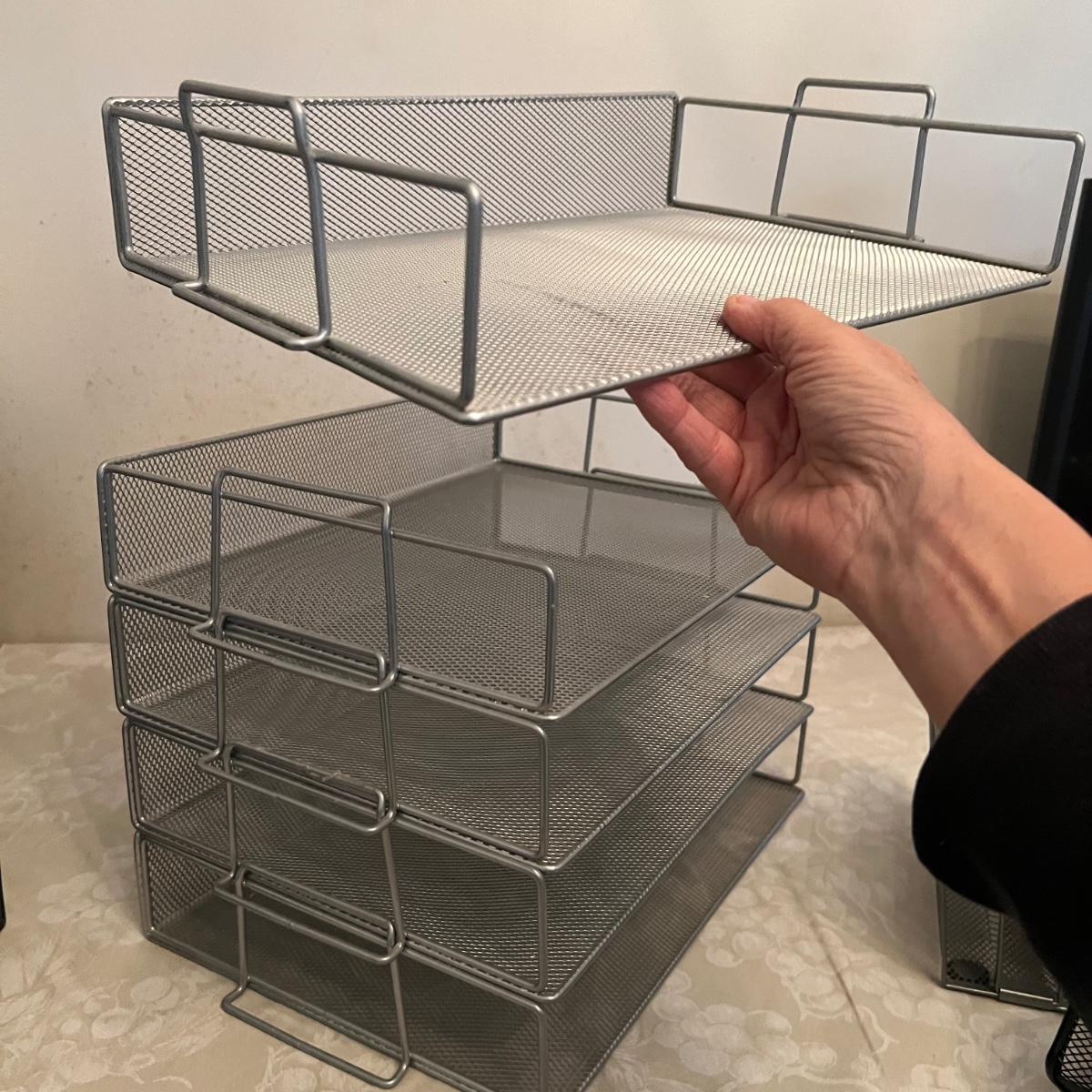 Large assortment of office supplies includes multiple inbox and file trays, desk lamp, envelopes, lots of paper clips, scissors, staplers and much more. The two multi tiered in-boxes come apart in one tray sections; wood/metal trays measure altogether 14” x 10” x 12”. The crab shaped desk ornament appears to be solid brass and measures 5” x 5” x 2”H.