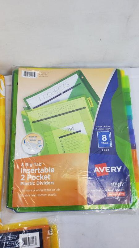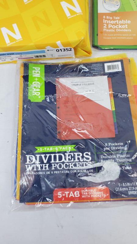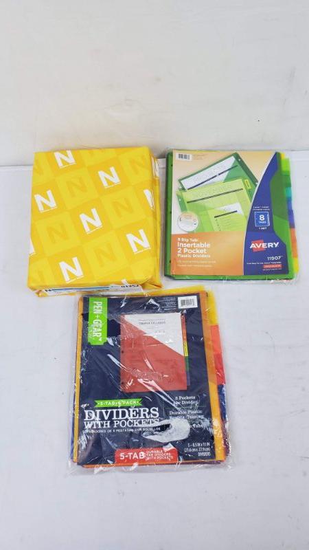 Office Supplies: 8 Big Tab Insertable 2 Pocket Plastic Dividers, 5-Tab Dividers w/Pockets, Ivory 8.5" x 11" Paper (500 Sheets) - New
