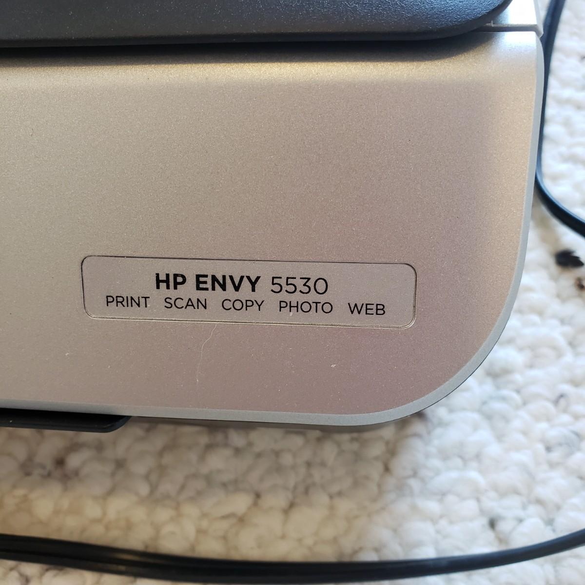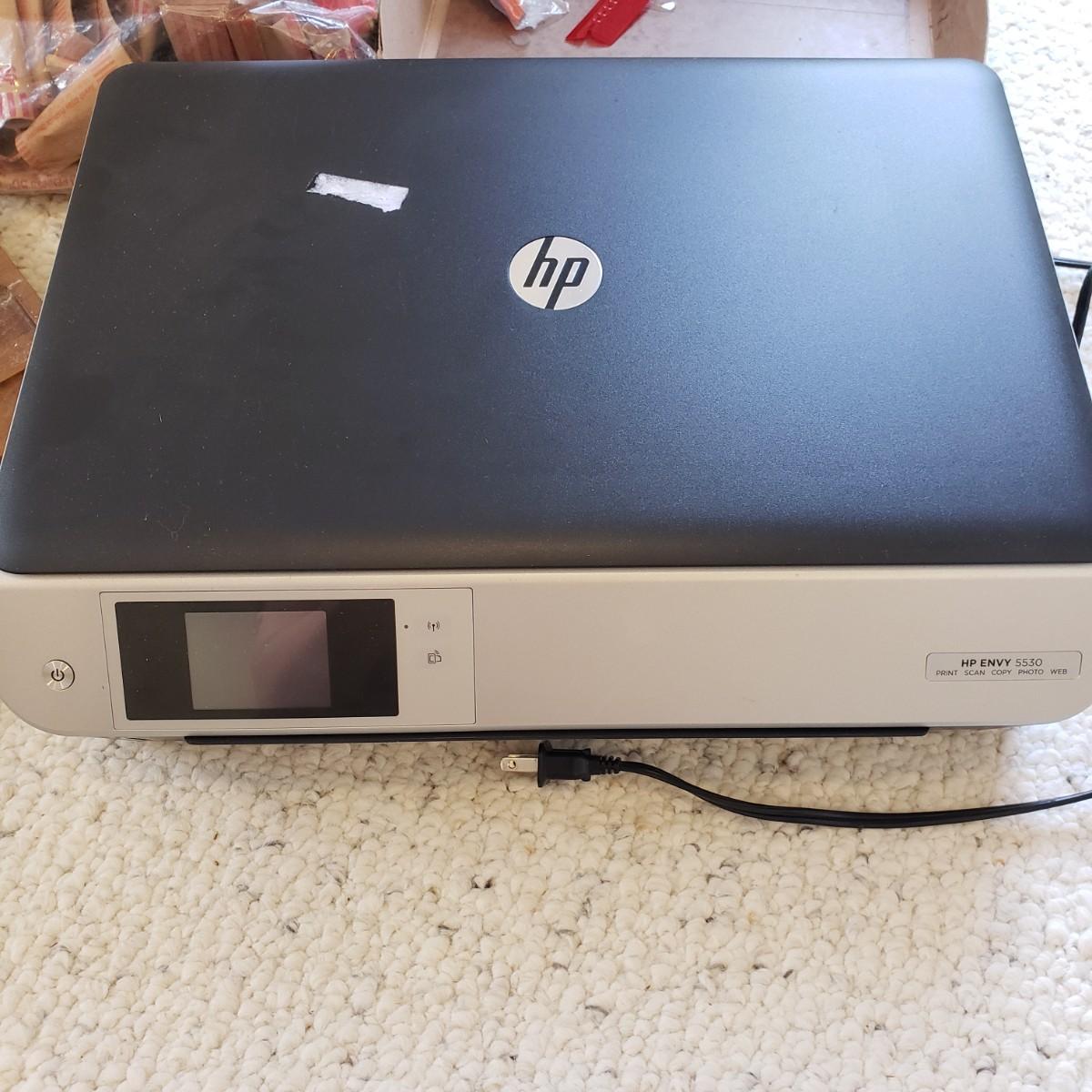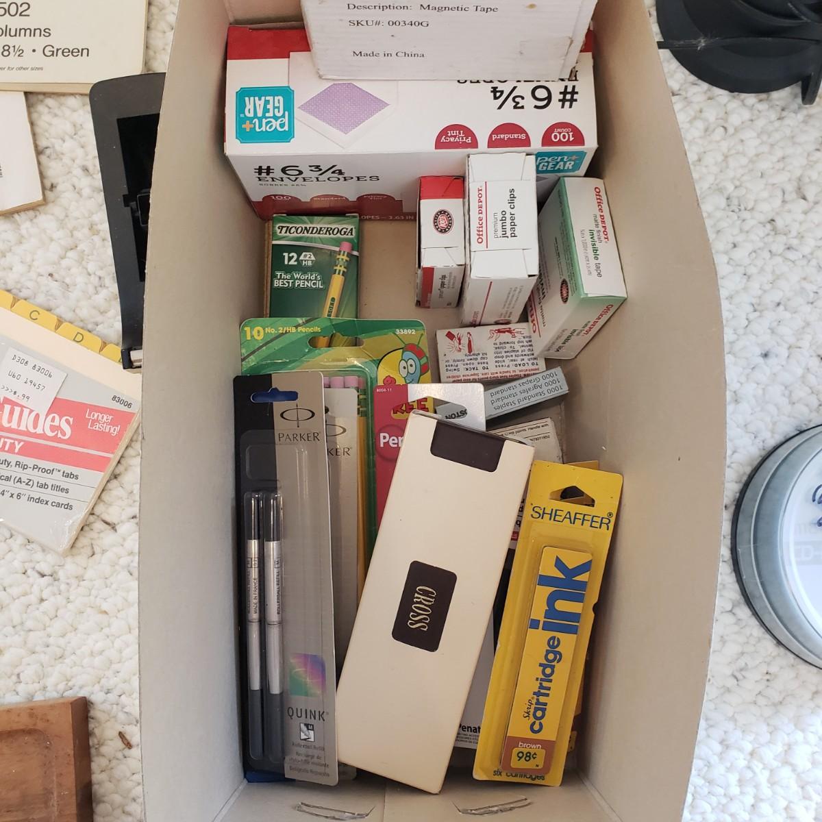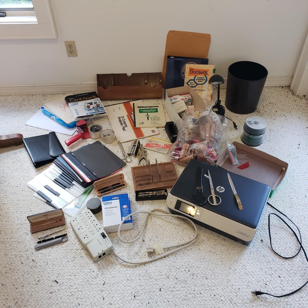 Everything you need to start an office or back to school supplies! The highlights in this lot are a HP Envy 5530 printer that powers on when plugged in, three Cross metal pens, a black metal desk lamp, a set of scissors and letter opener made in Italy. This set is heavy duty and comes in a black leather case. Also included is a wooden desk organizer with two metal racks for holding envelopes and a vintage wooden wall organizer. There is also a heavy plastic chair mat for carpeted floors. There are knobs on the back side that holds it to the carpet. The chair mat measures approximately 48" x 39".