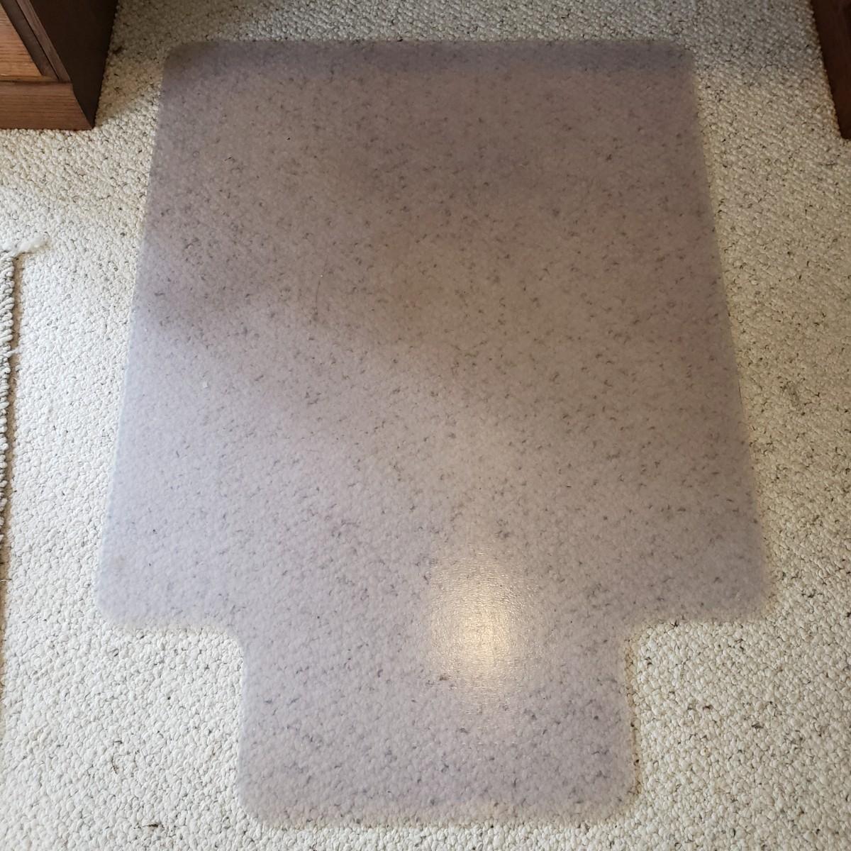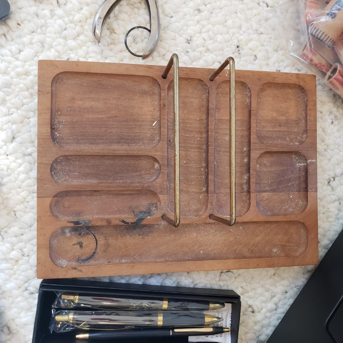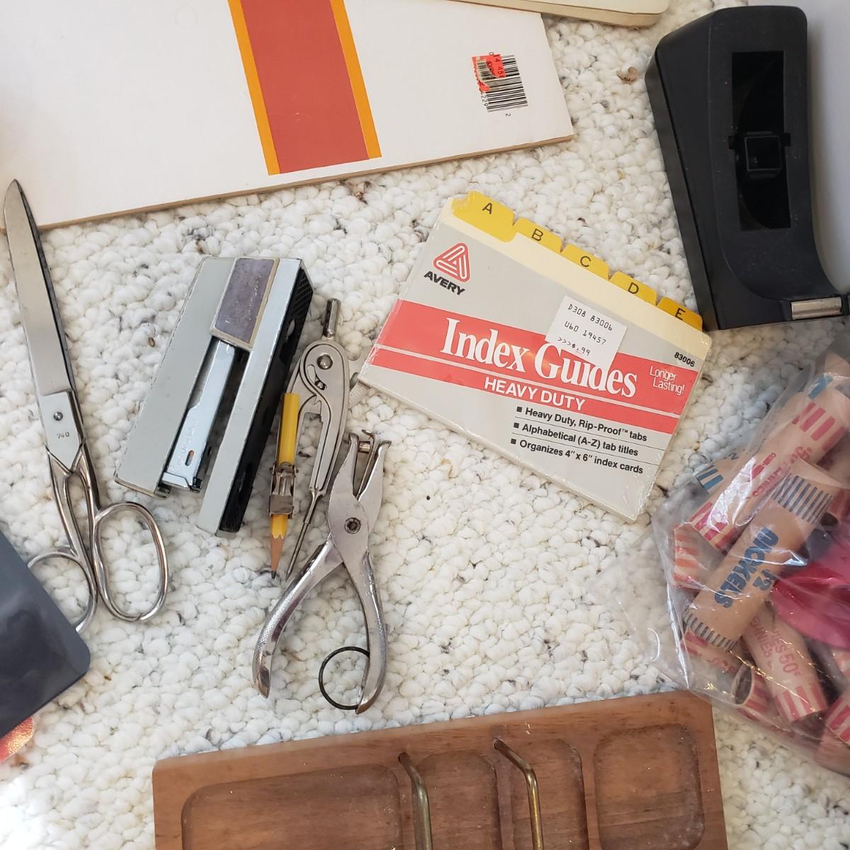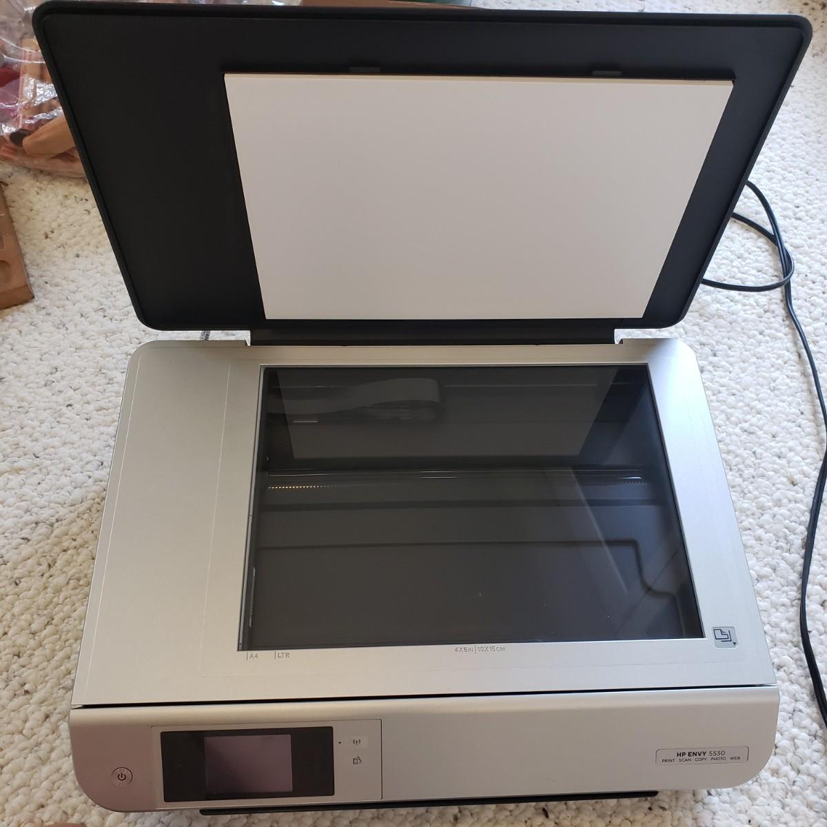 Everything you need to start an office or back to school supplies! The highlights in this lot are a HP Envy 5530 printer that powers on when plugged in, three Cross metal pens, a black metal desk lamp, a set of scissors and letter opener made in Italy. This set is heavy duty and comes in a black leather case. Also included is a wooden desk organizer with two metal racks for holding envelopes and a vintage wooden wall organizer. There is also a heavy plastic chair mat for carpeted floors. There are knobs on the back side that holds it to the carpet. The chair mat measures approximately 48" x 39".