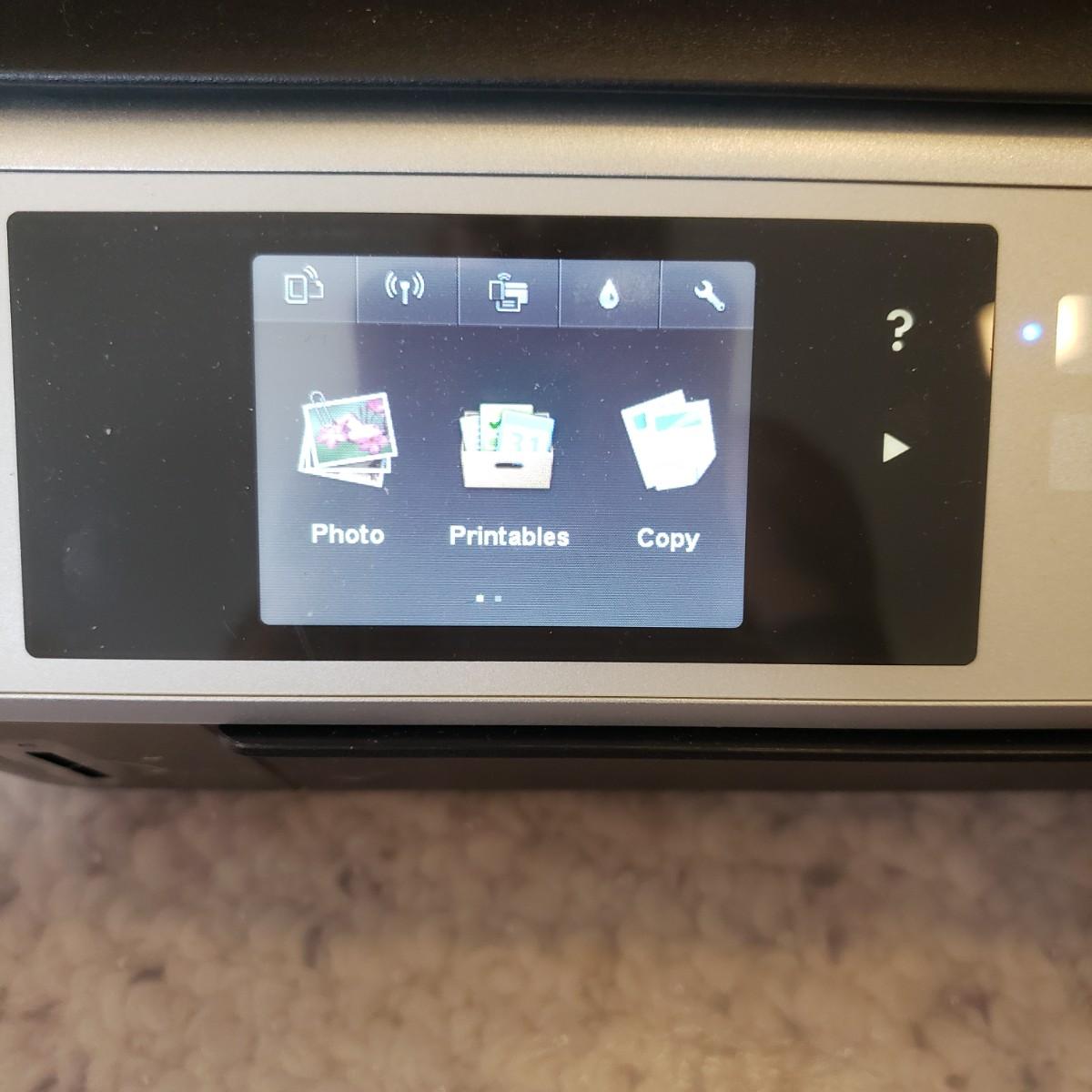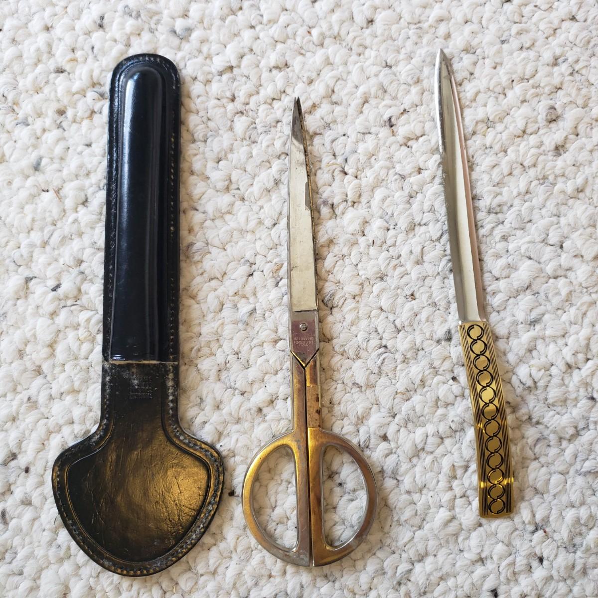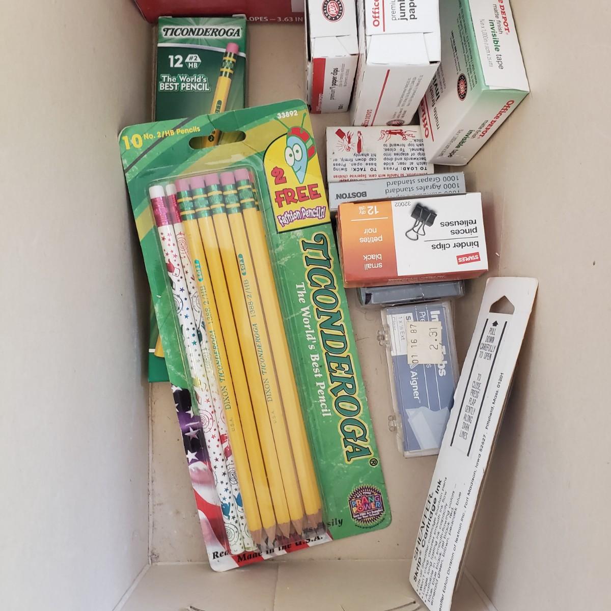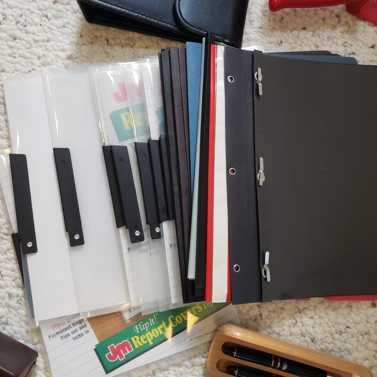 Everything you need to start an office or back to school supplies! The highlights in this lot are a HP Envy 5530 printer that powers on when plugged in, three Cross metal pens, a black metal desk lamp, a set of scissors and letter opener made in Italy. This set is heavy duty and comes in a black leather case. Also included is a wooden desk organizer with two metal racks for holding envelopes and a vintage wooden wall organizer. There is also a heavy plastic chair mat for carpeted floors. There are knobs on the back side that holds it to the carpet. The chair mat measures approximately 48" x 39".