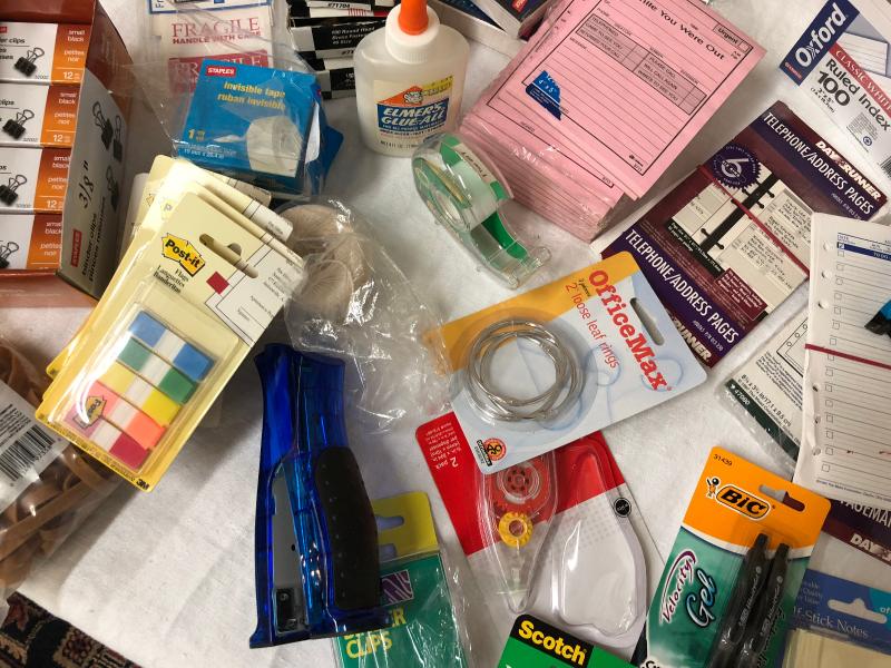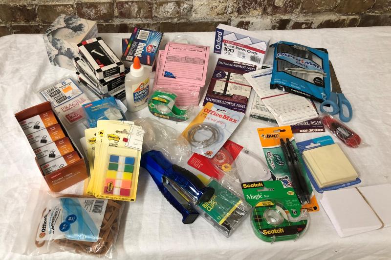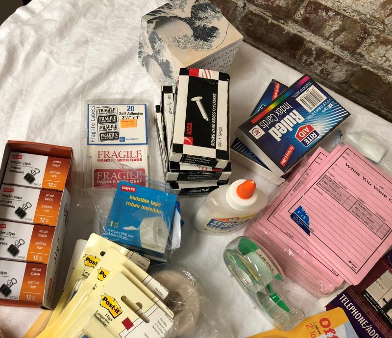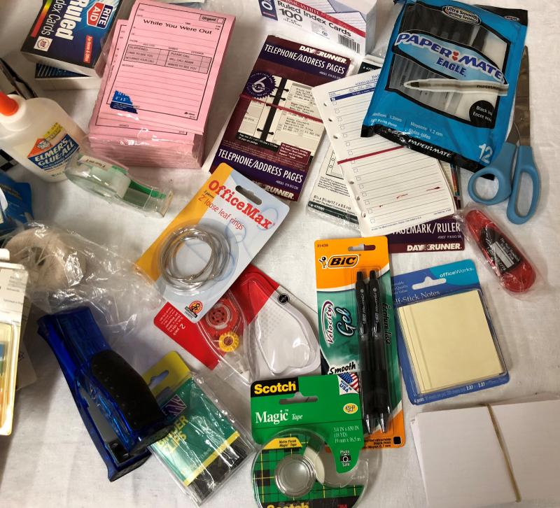 Here is a pile of new office supplies...staples, glue, tape, message pads..etc...