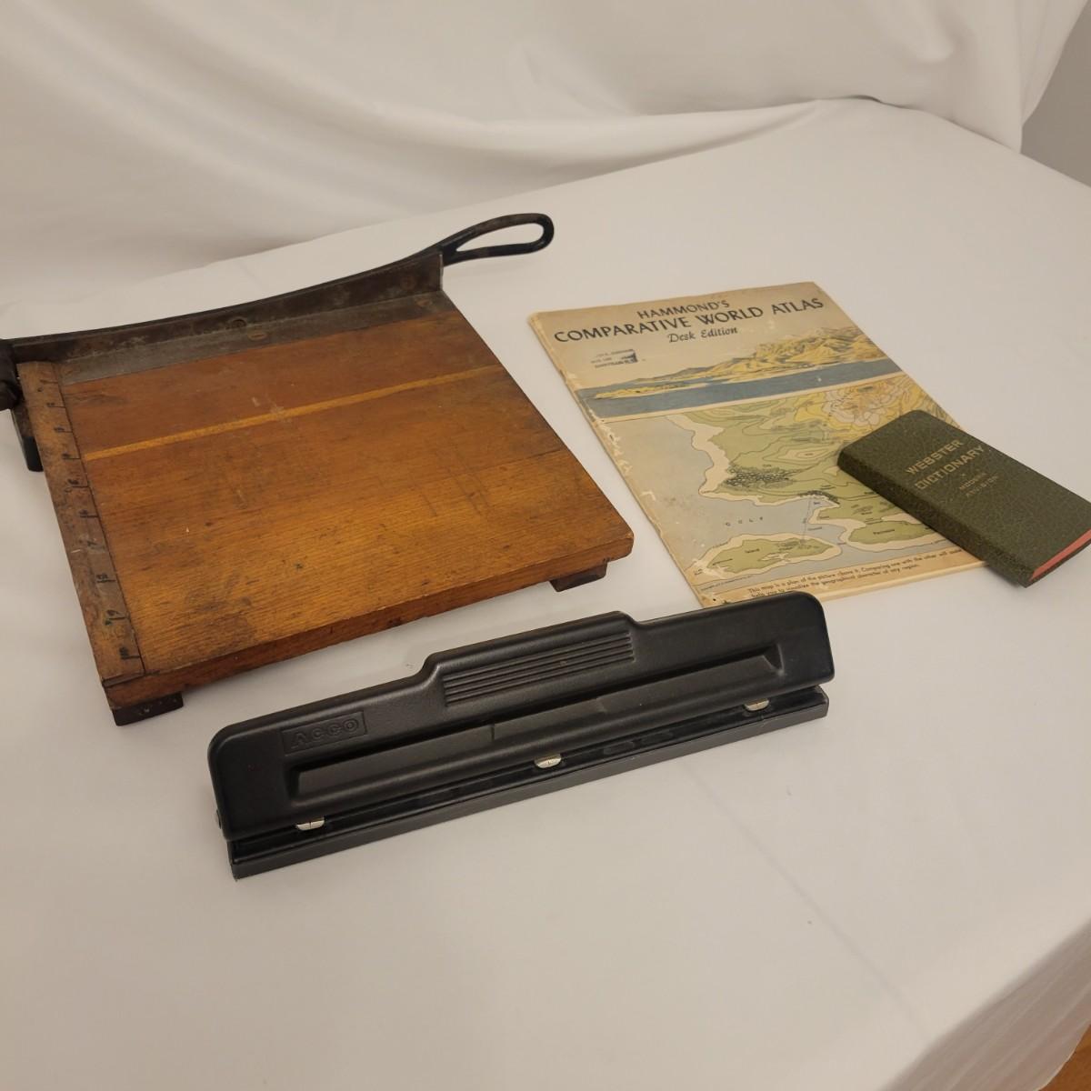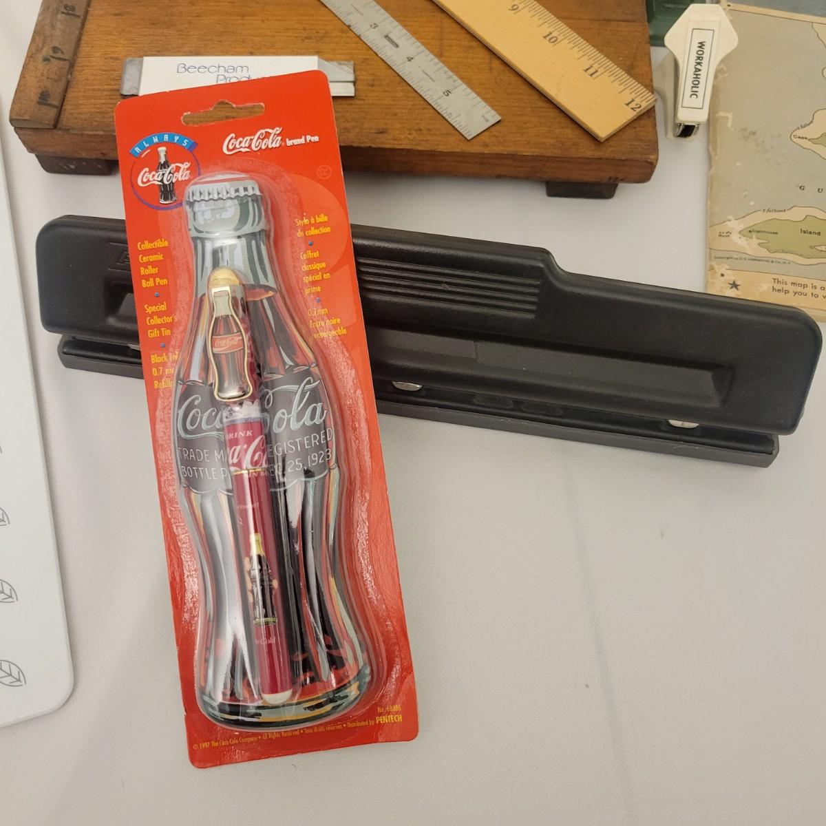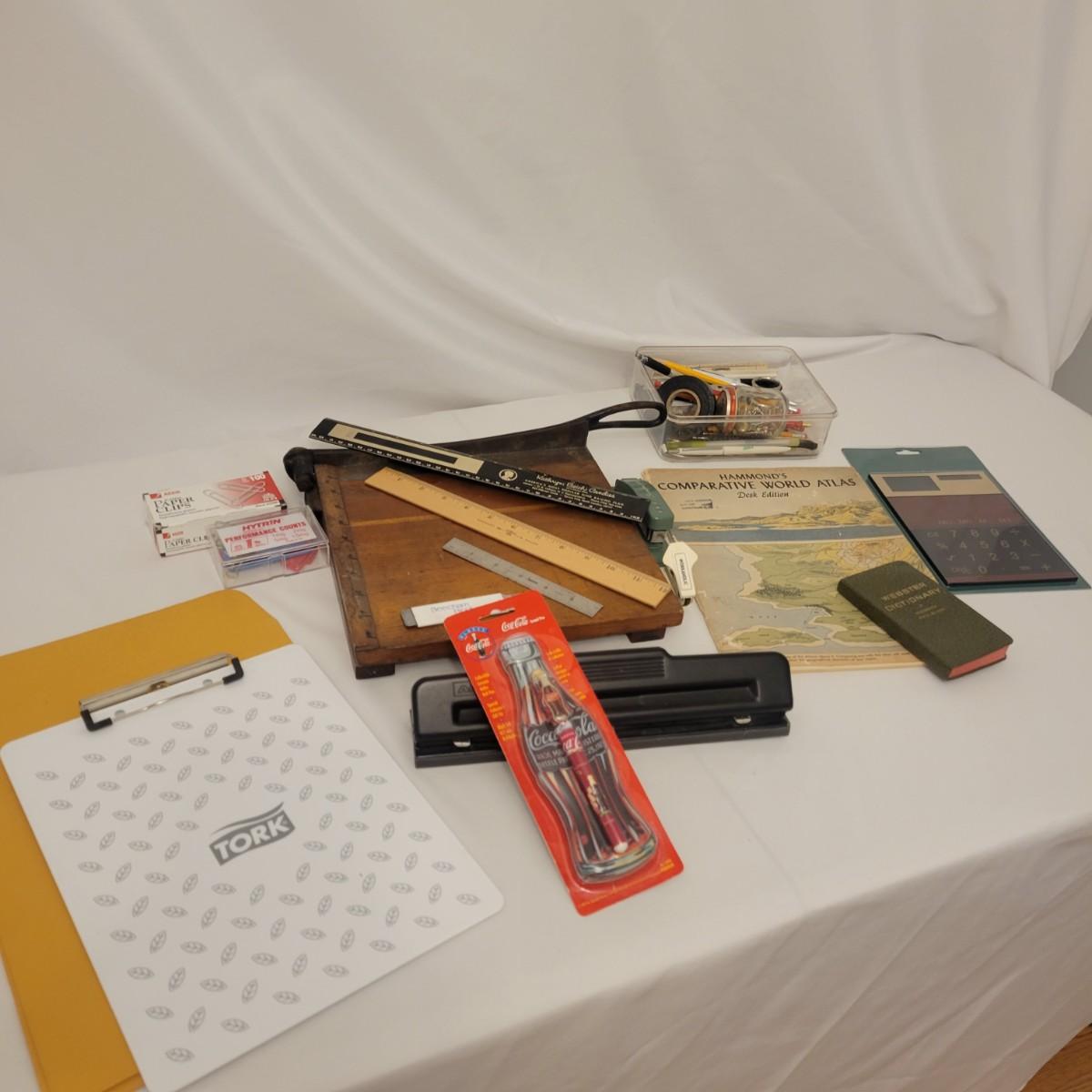 An assortment of office supplies in good condition. Lot includes a vintage paper cutters that measures approximately 11" x 15.5" x 2". Also includes assorted pens, a calculator, hole punch and a Coca-Cola tin and pin. See attached pictures for full inventory. Shipping available