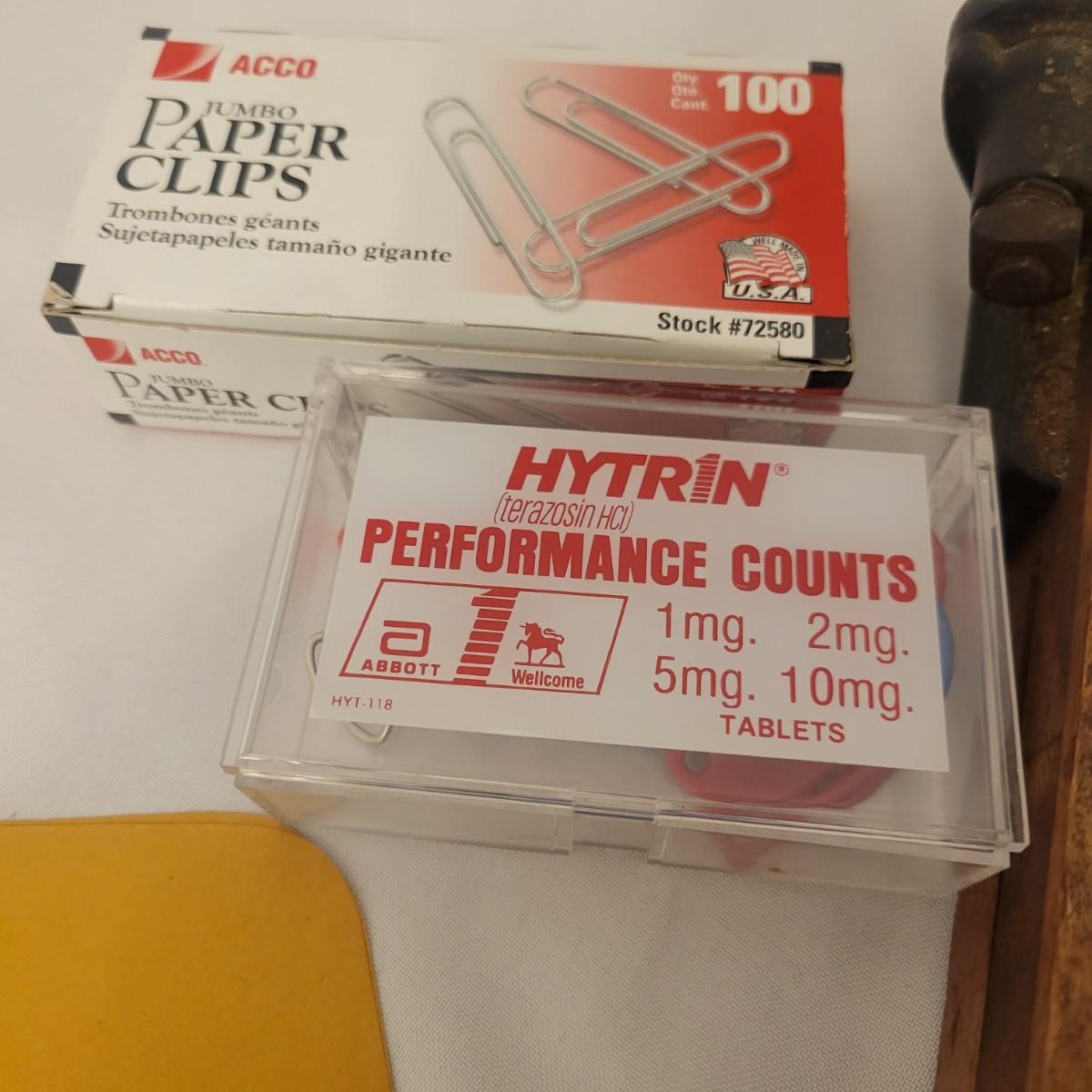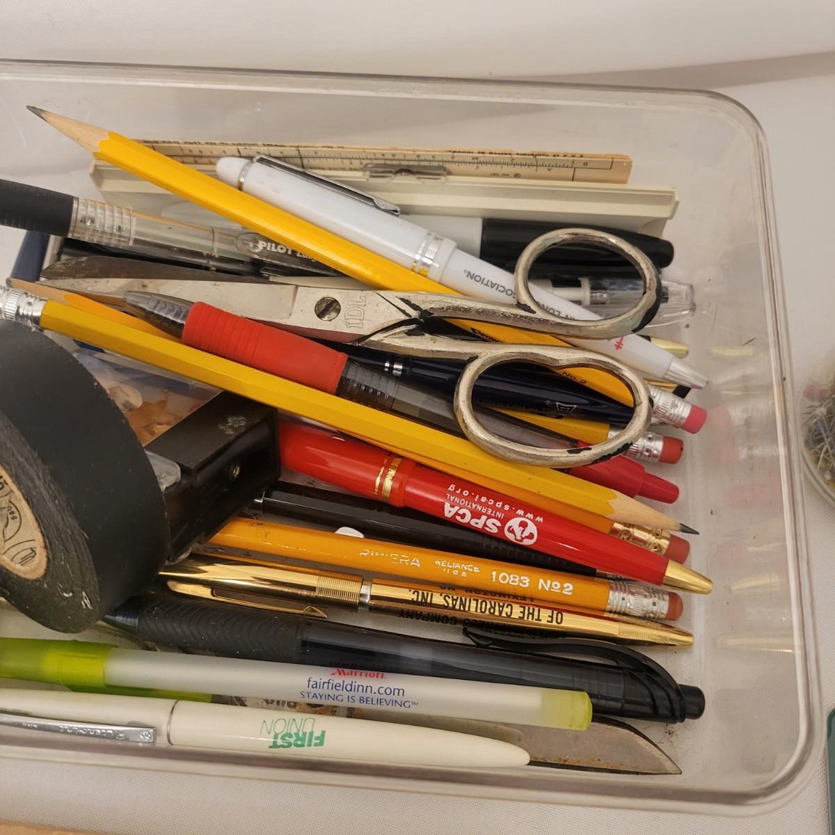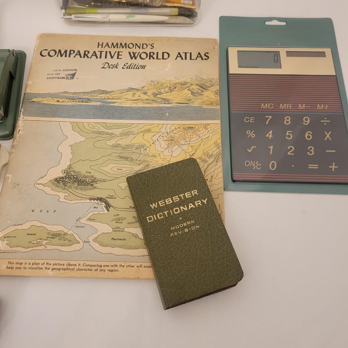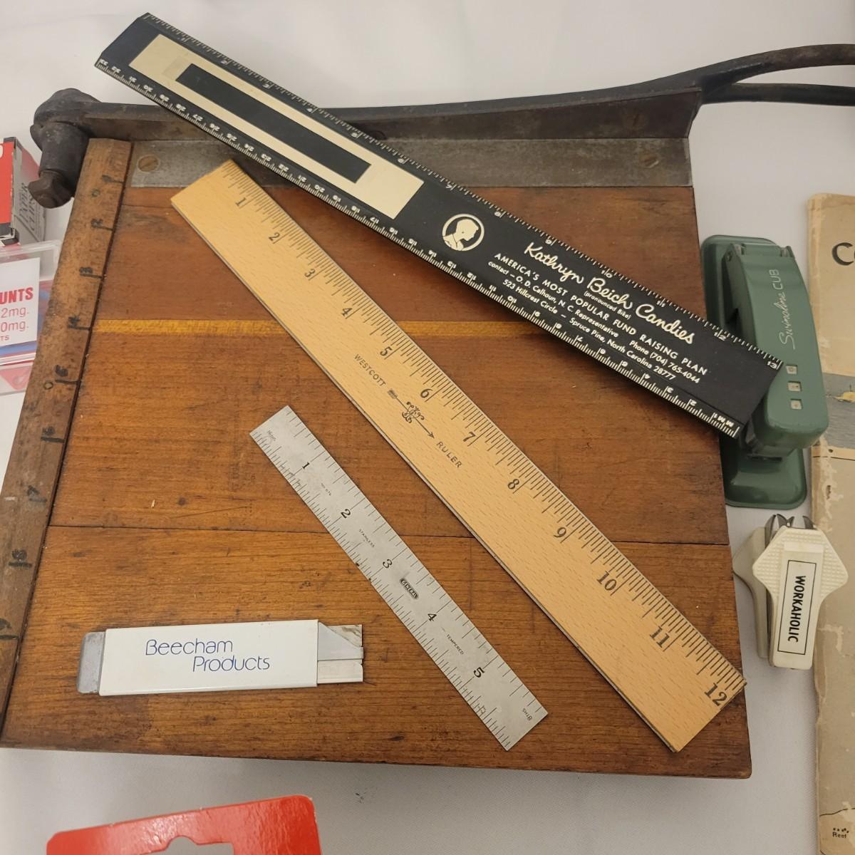 An assortment of office supplies in good condition. Lot includes a vintage paper cutters that measures approximately 11" x 15.5" x 2". Also includes assorted pens, a calculator, hole punch and a Coca-Cola tin and pin. See attached pictures for full inventory. Shipping available