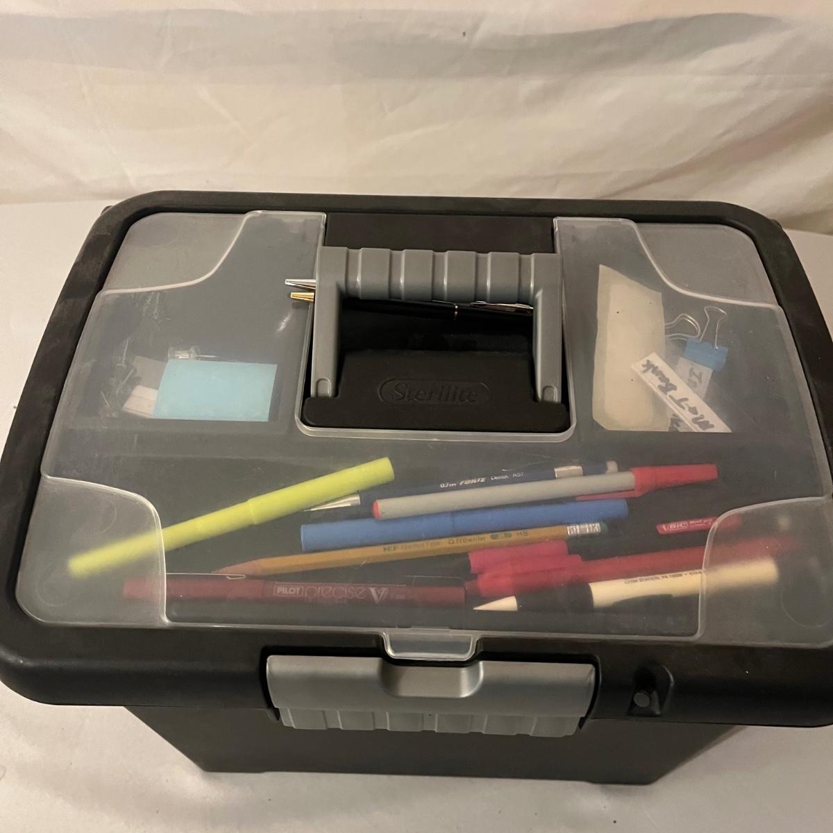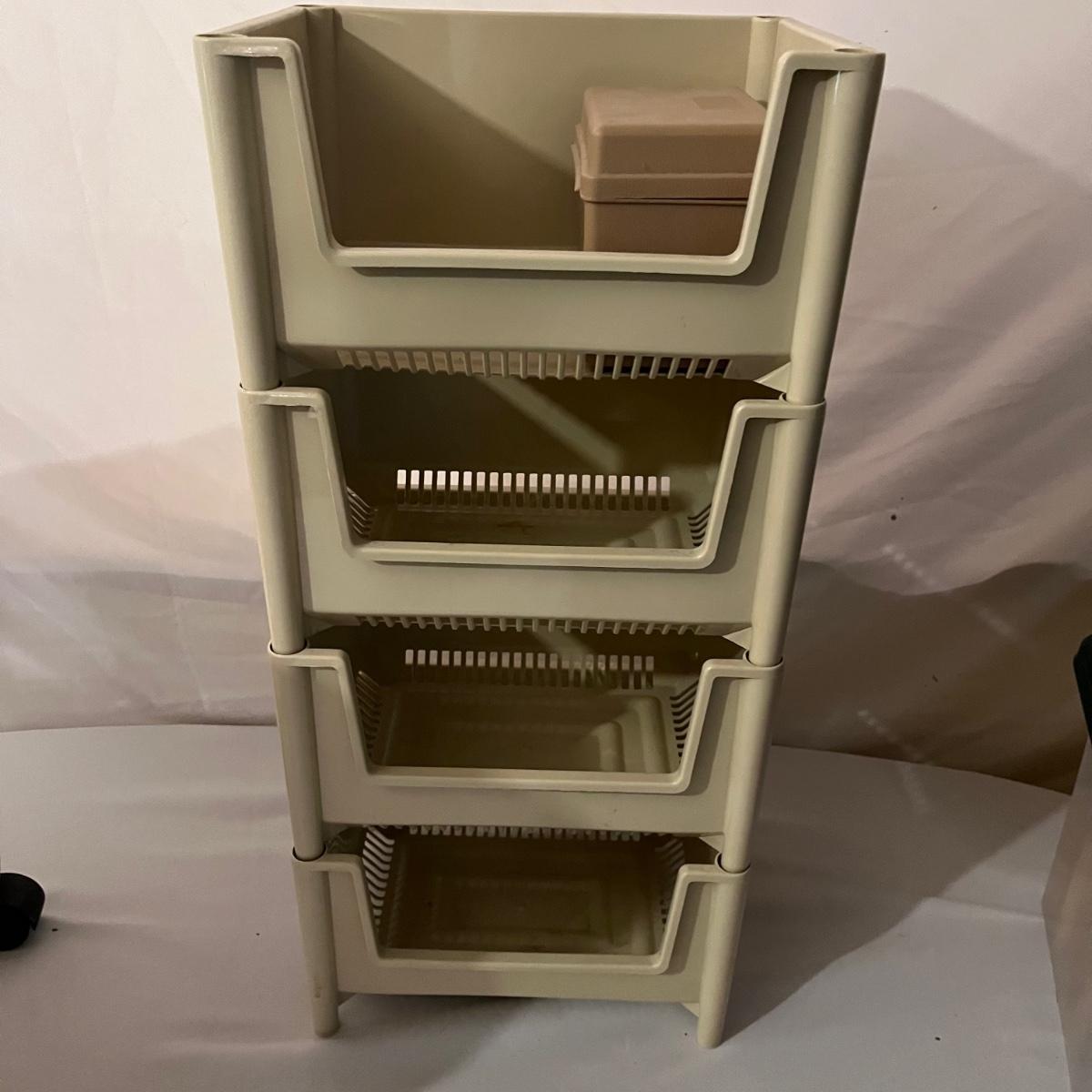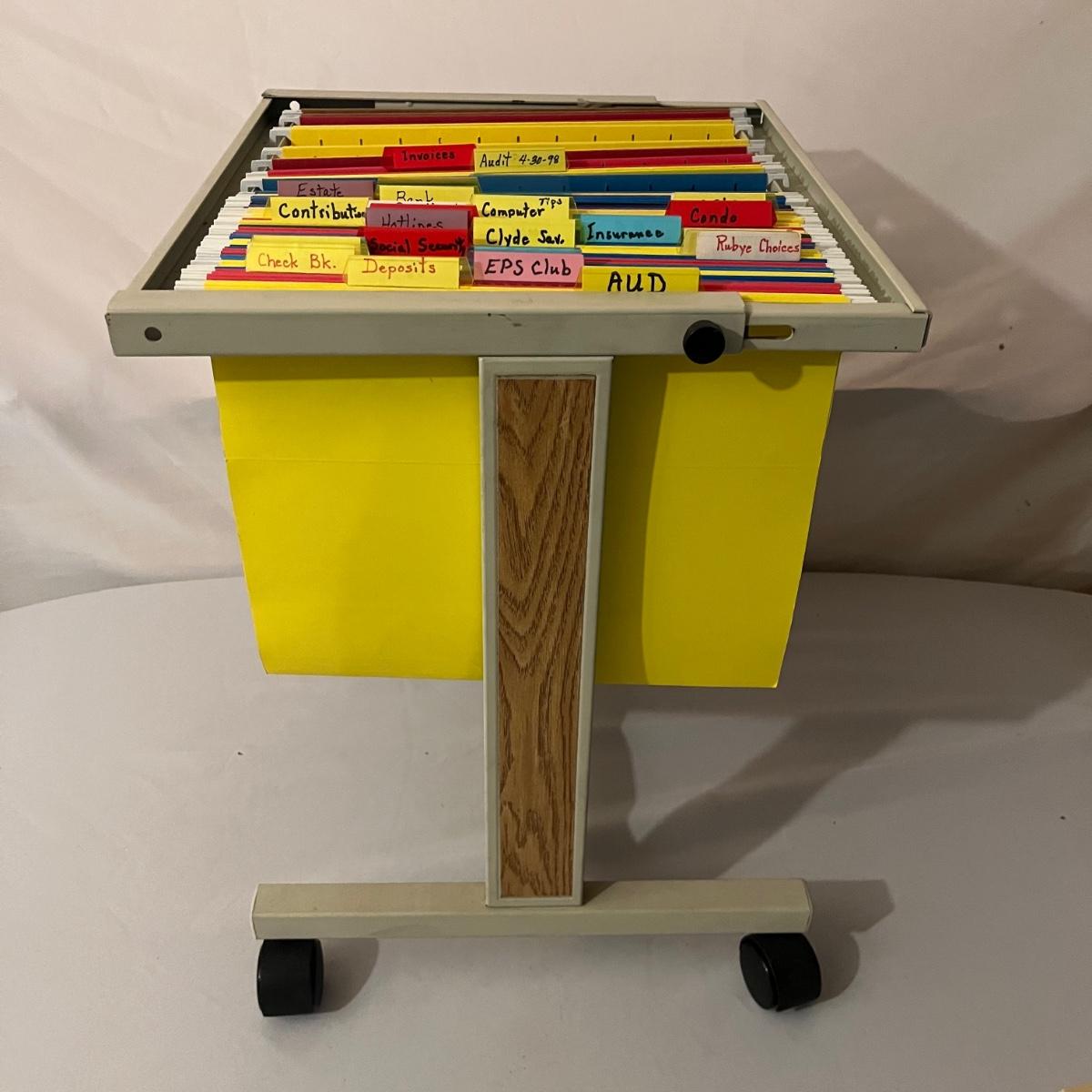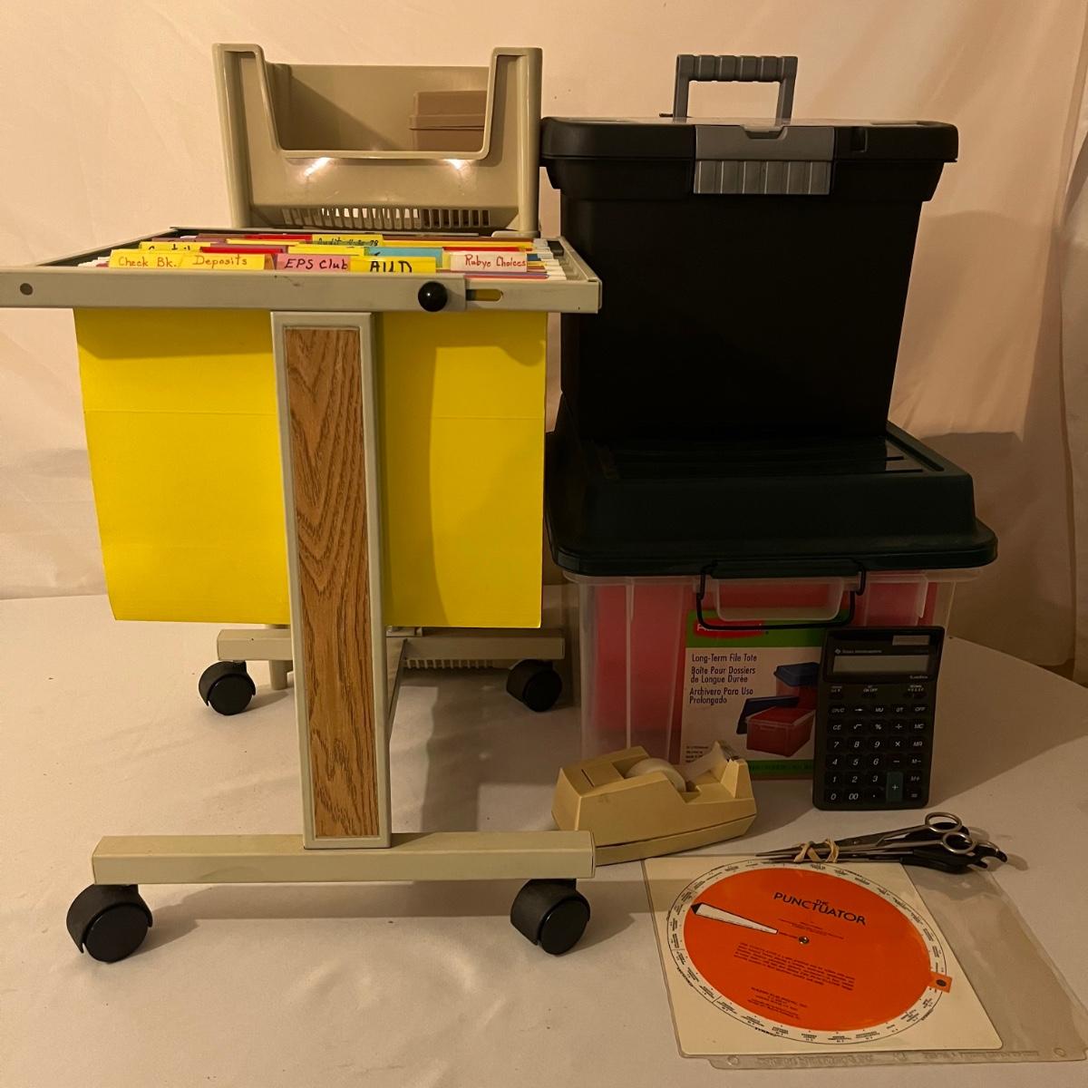 Lot includes calculator, desk tape dispenser, two hanging file cases, four stackable plastic bins and a rolling hanging file holder that measures 14” x 15.5” x 19”.