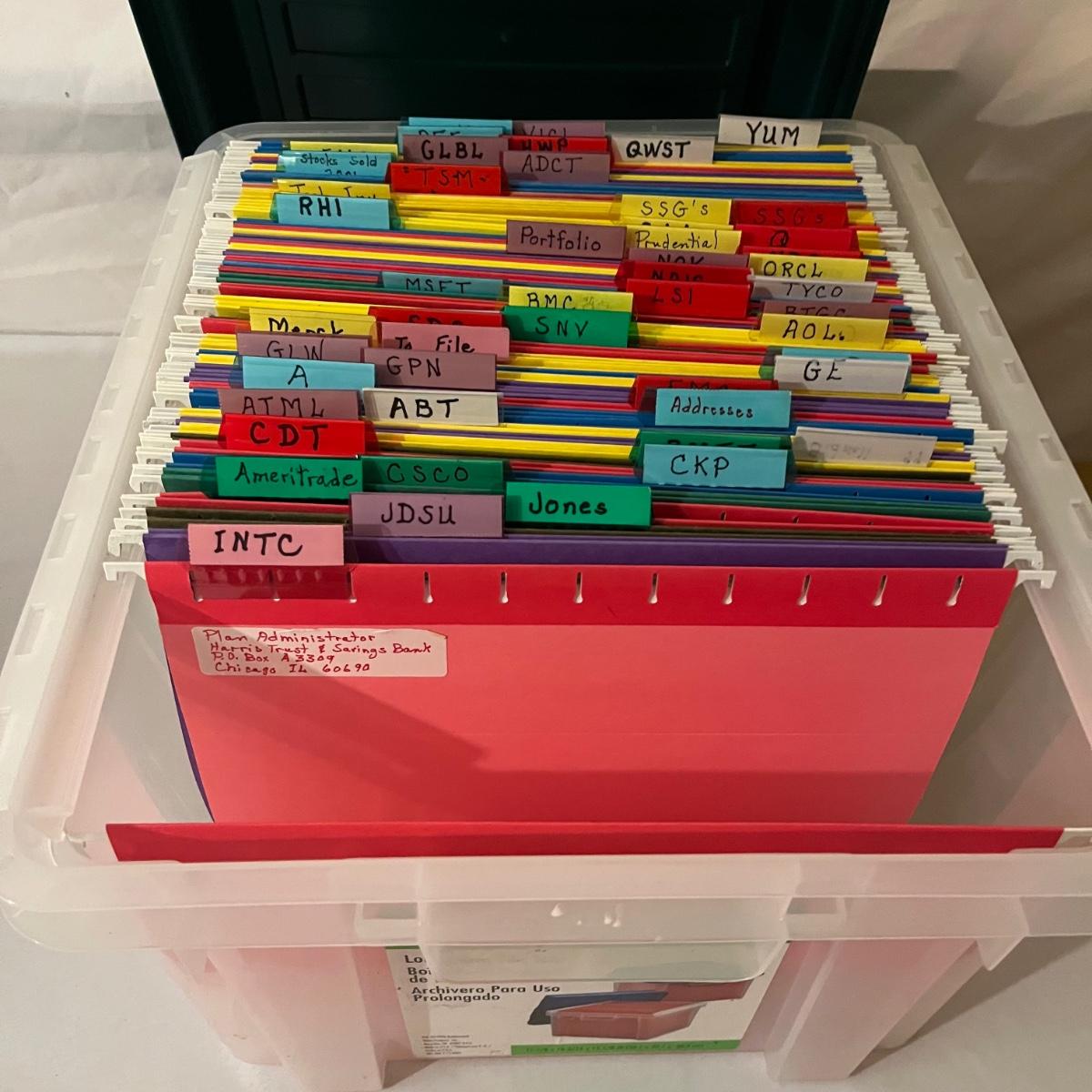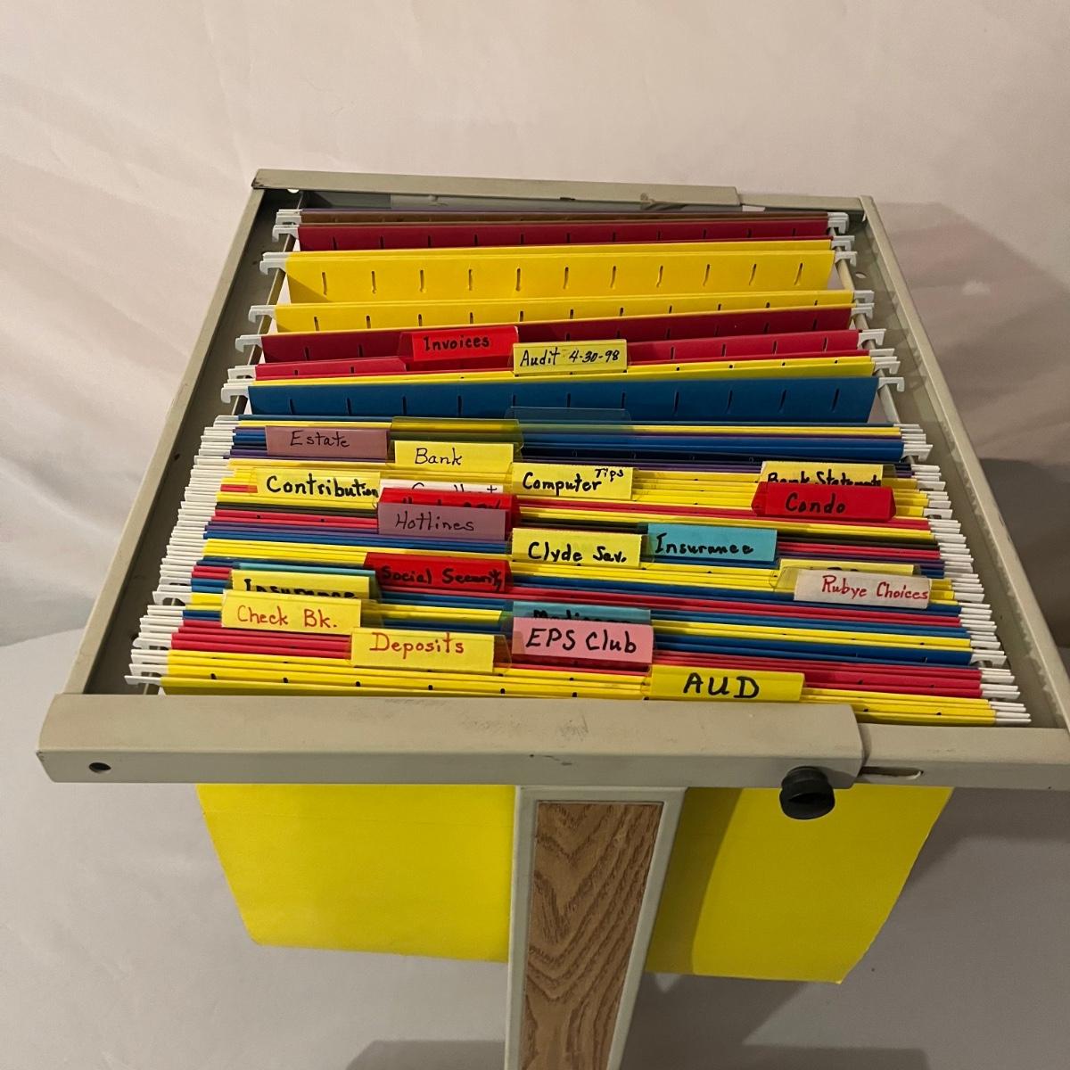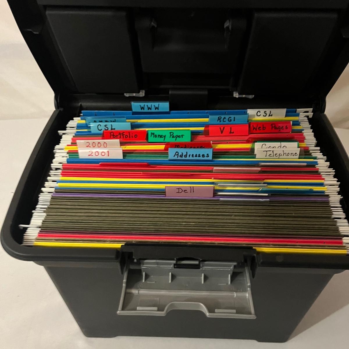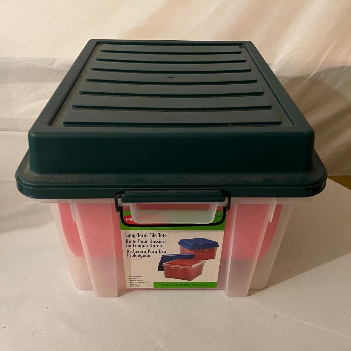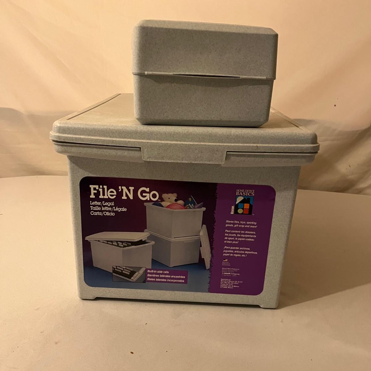 Lot includes calculator, desk tape dispenser, two hanging file cases, four stackable plastic bins and a rolling hanging file holder that measures 14” x 15.5” x 19”.