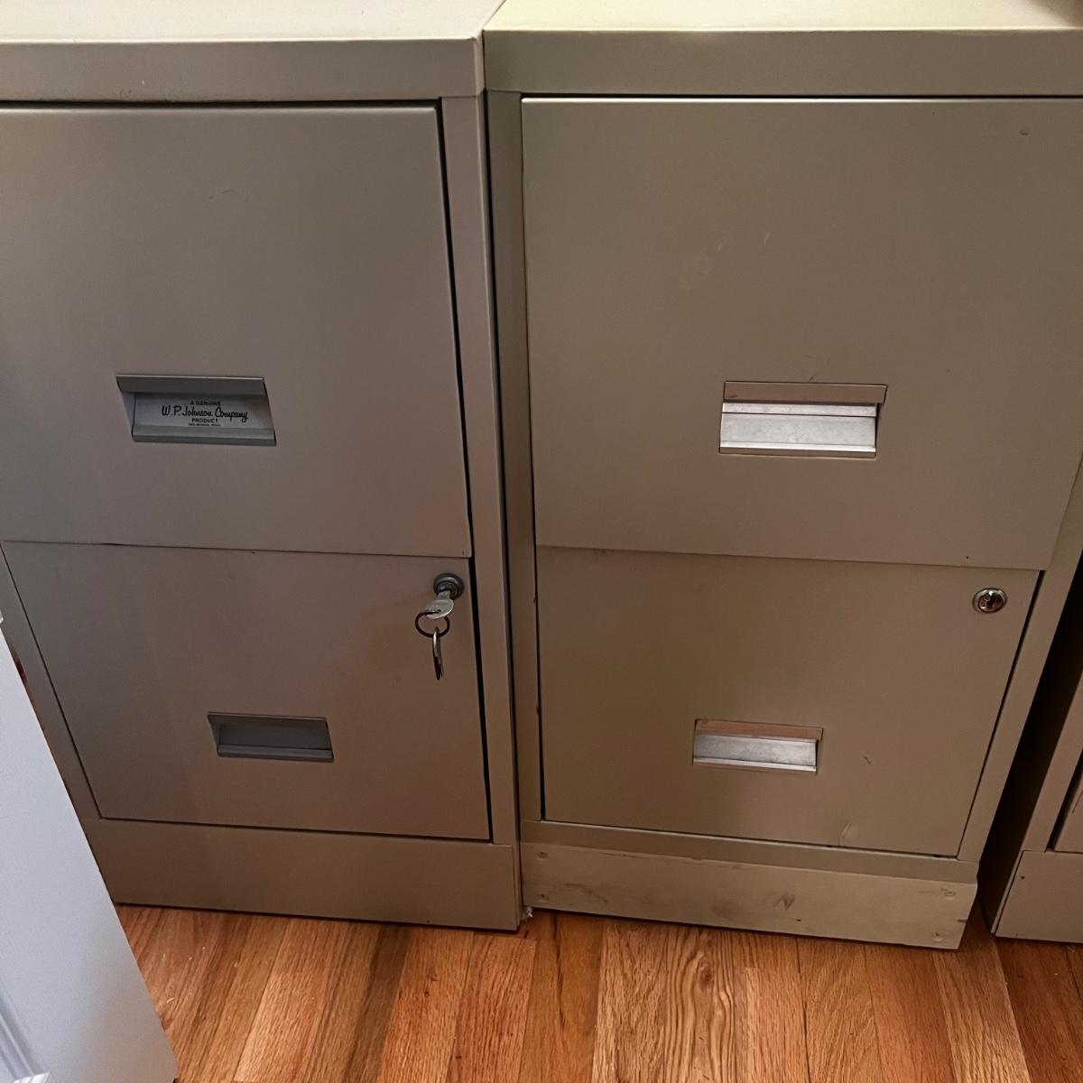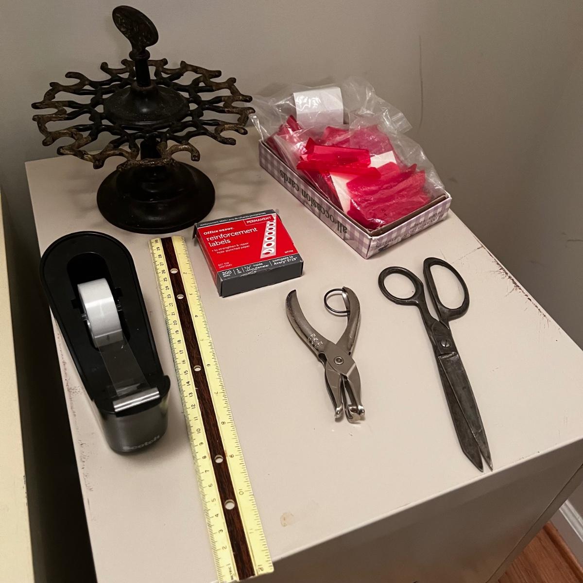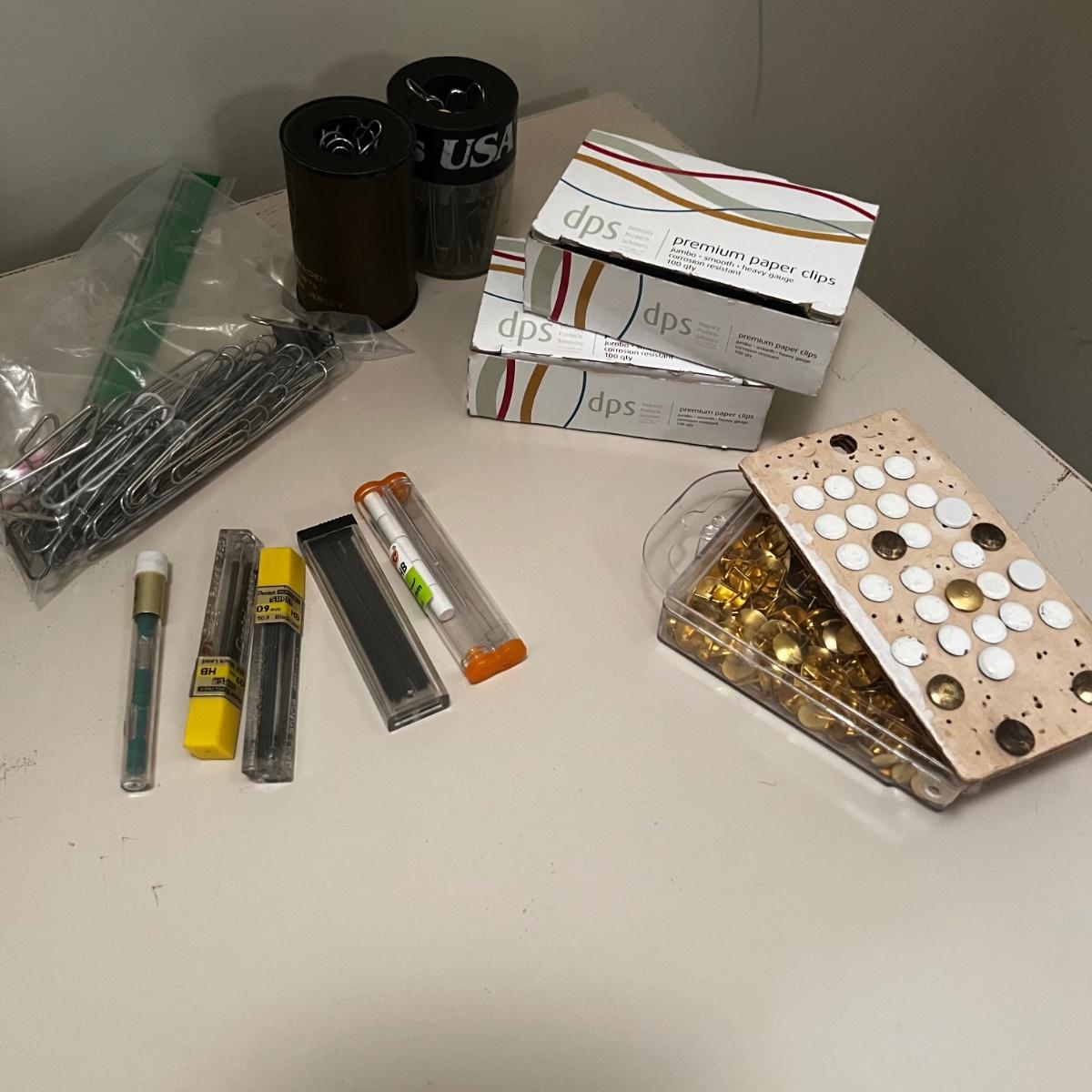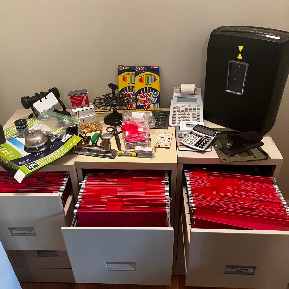 A large selection of office supplies includes a shredder that operates when plugged in. It measures 11.5” x 7” x 15”H. Also three metal 2-drawer file cabinets with two having keys annd one not having key. Each comes with reusable hanging folders inside and measures 15” x 18” x 29”H. Two boxes of colored pencils, three calculators that power on when plugged in or turned on. Three staplers and staples as well as a staple remover, paper clips and holders, thumb tacks, pencil lead and mechanical pencil eraser refills. Lot includes a stamp holder, file labels, scissors and more.