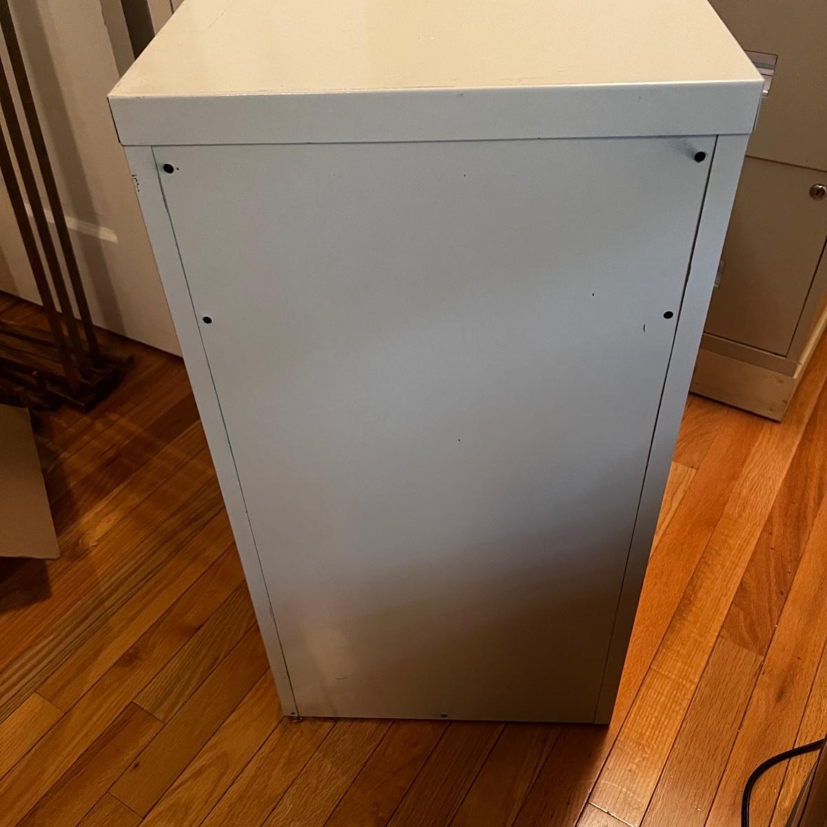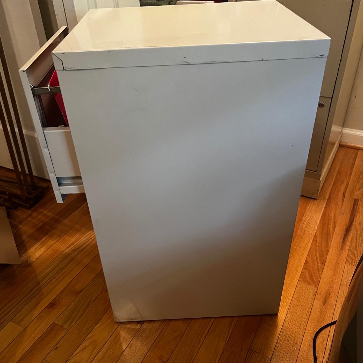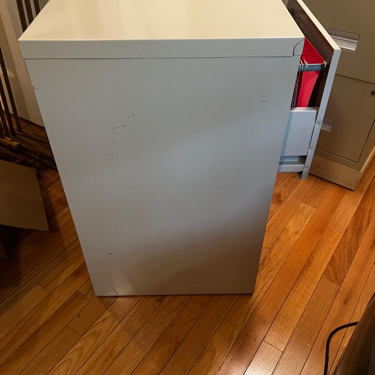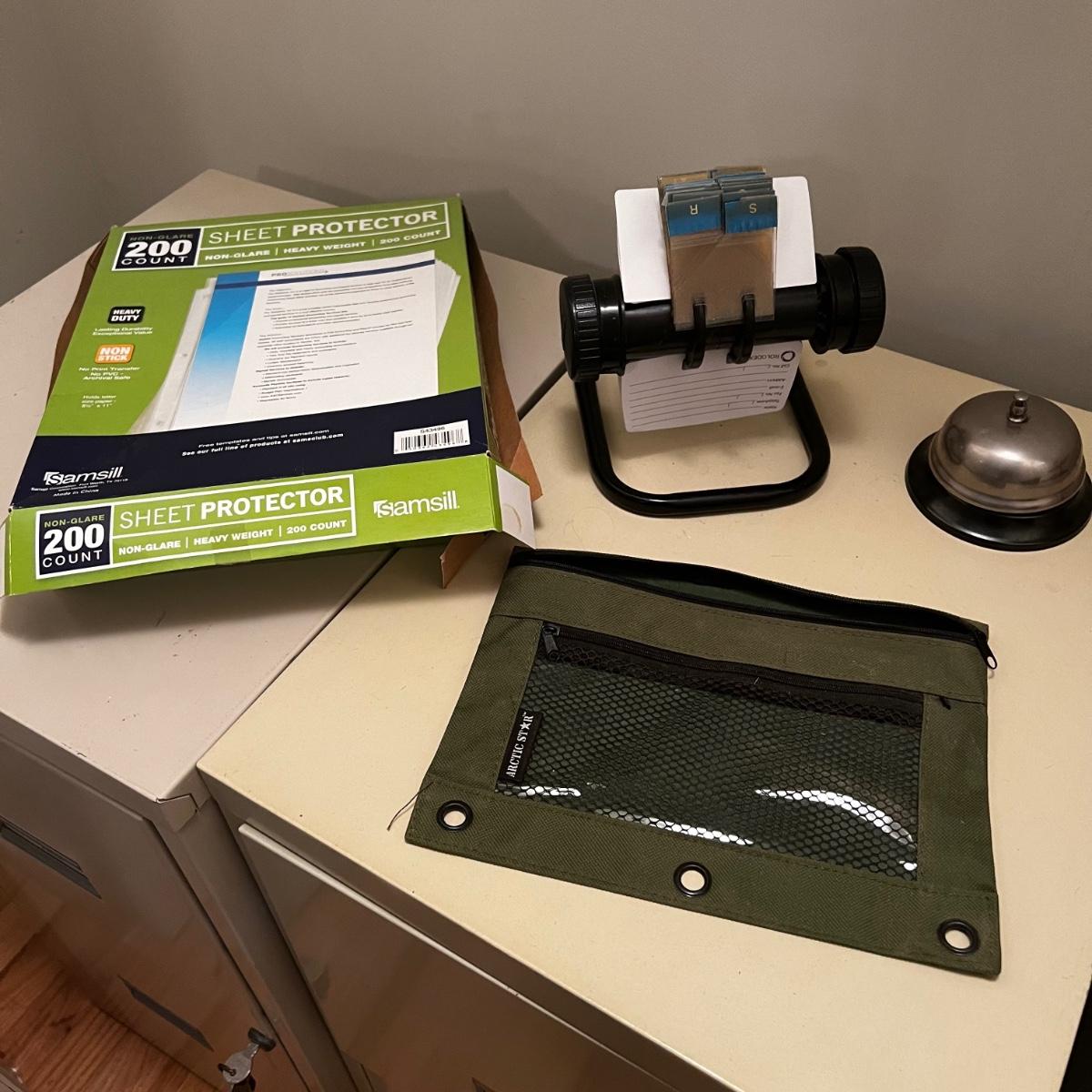 A large selection of office supplies includes a shredder that operates when plugged in. It measures 11.5” x 7” x 15”H. Also three metal 2-drawer file cabinets with two having keys annd one not having key. Each comes with reusable hanging folders inside and measures 15” x 18” x 29”H. Two boxes of colored pencils, three calculators that power on when plugged in or turned on. Three staplers and staples as well as a staple remover, paper clips and holders, thumb tacks, pencil lead and mechanical pencil eraser refills. Lot includes a stamp holder, file labels, scissors and more.