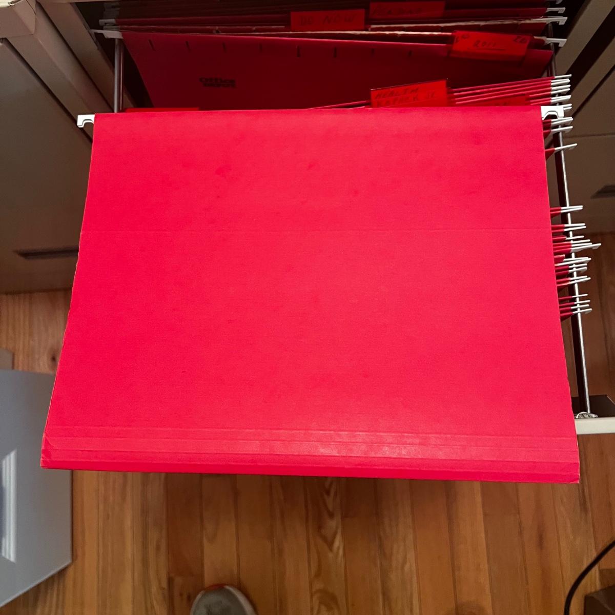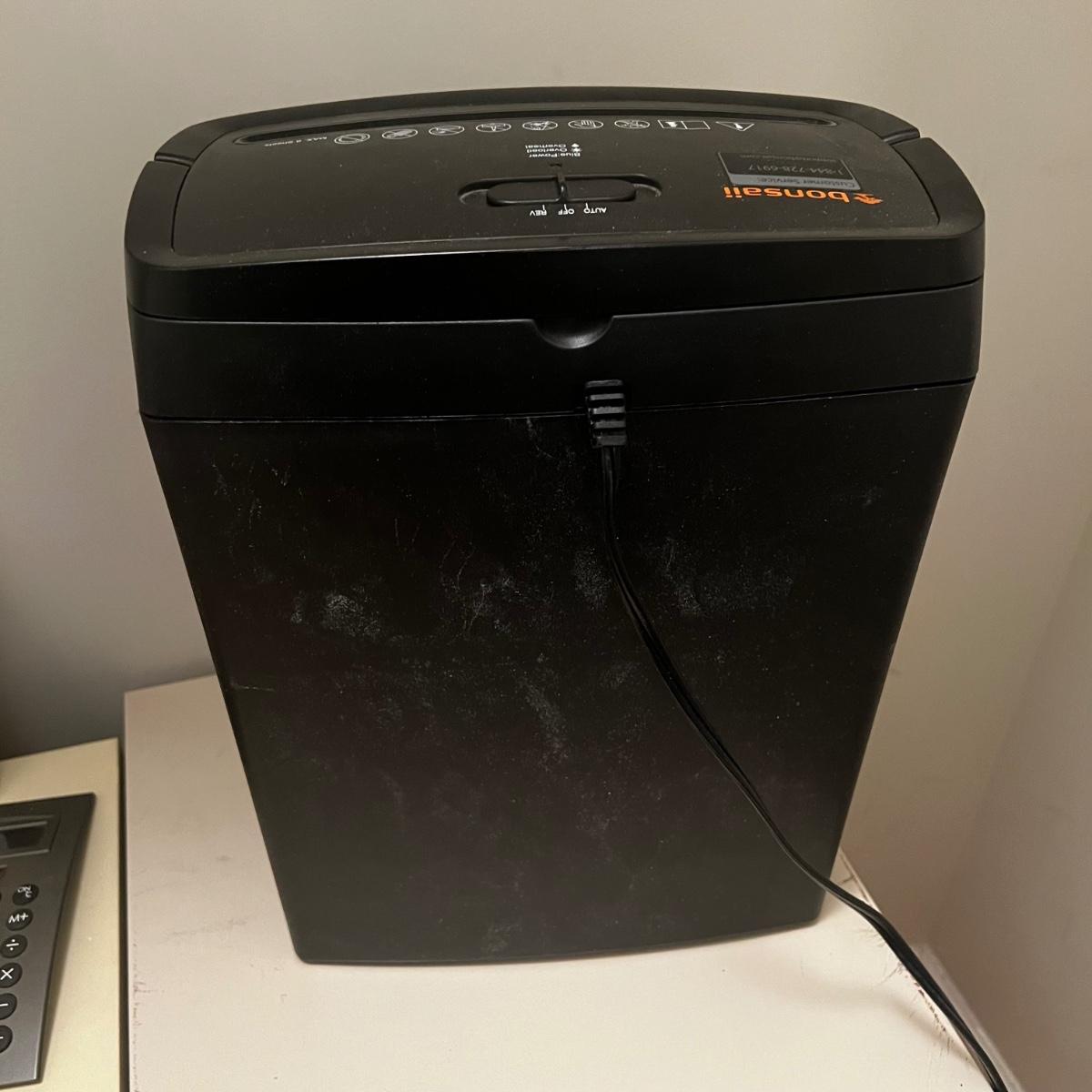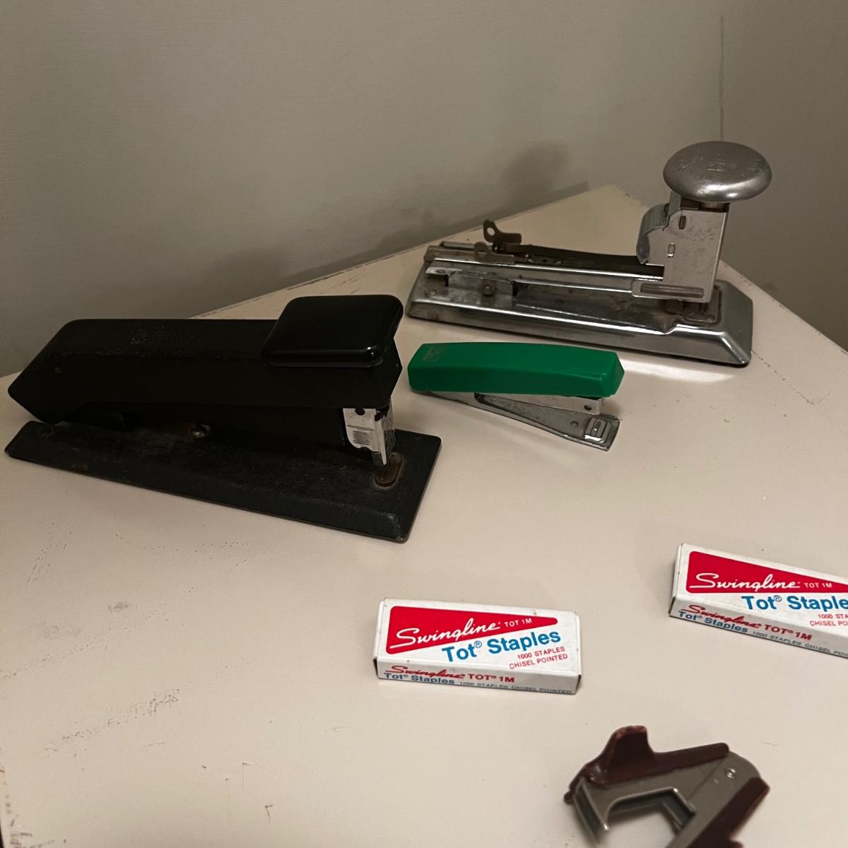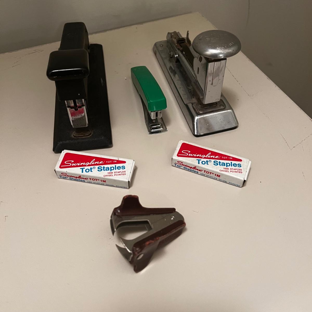 A large selection of office supplies includes a shredder that operates when plugged in. It measures 11.5” x 7” x 15”H. Also three metal 2-drawer file cabinets with two having keys annd one not having key. Each comes with reusable hanging folders inside and measures 15” x 18” x 29”H. Two boxes of colored pencils, three calculators that power on when plugged in or turned on. Three staplers and staples as well as a staple remover, paper clips and holders, thumb tacks, pencil lead and mechanical pencil eraser refills. Lot includes a stamp holder, file labels, scissors and more.