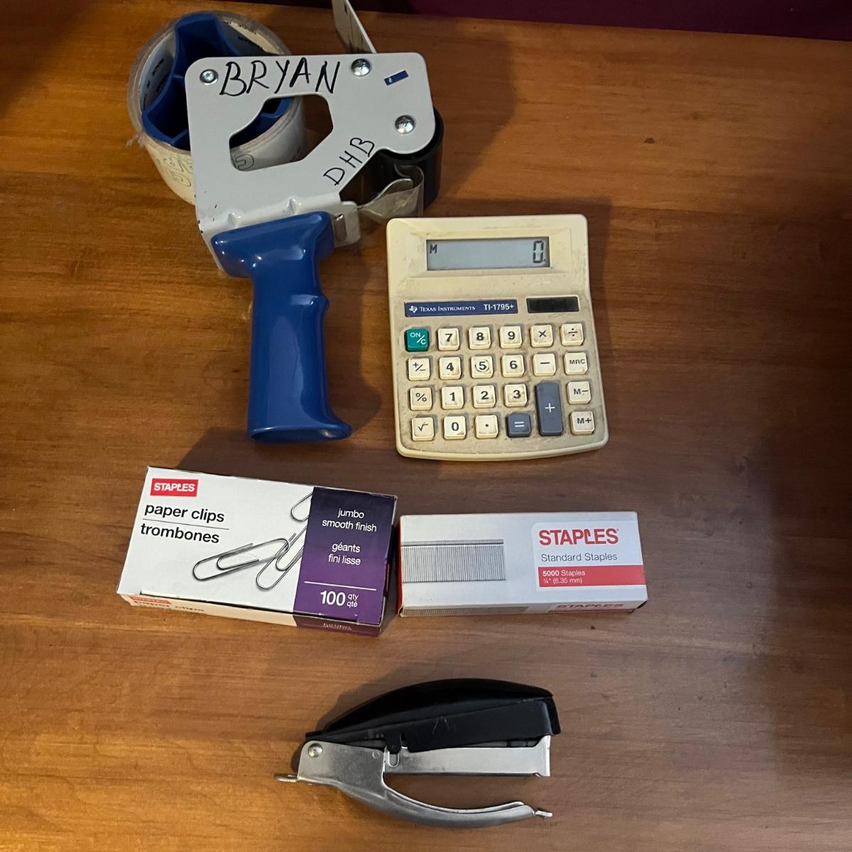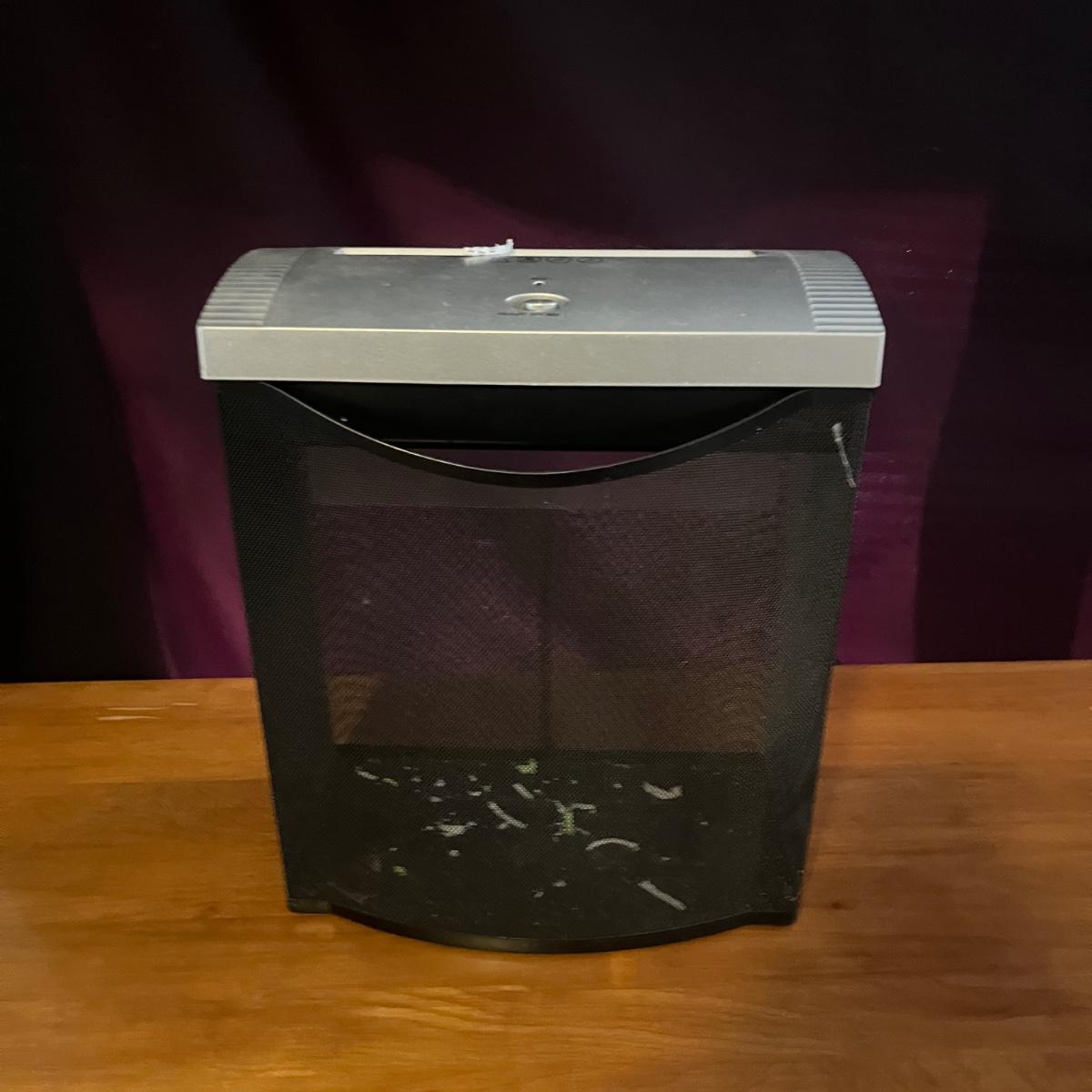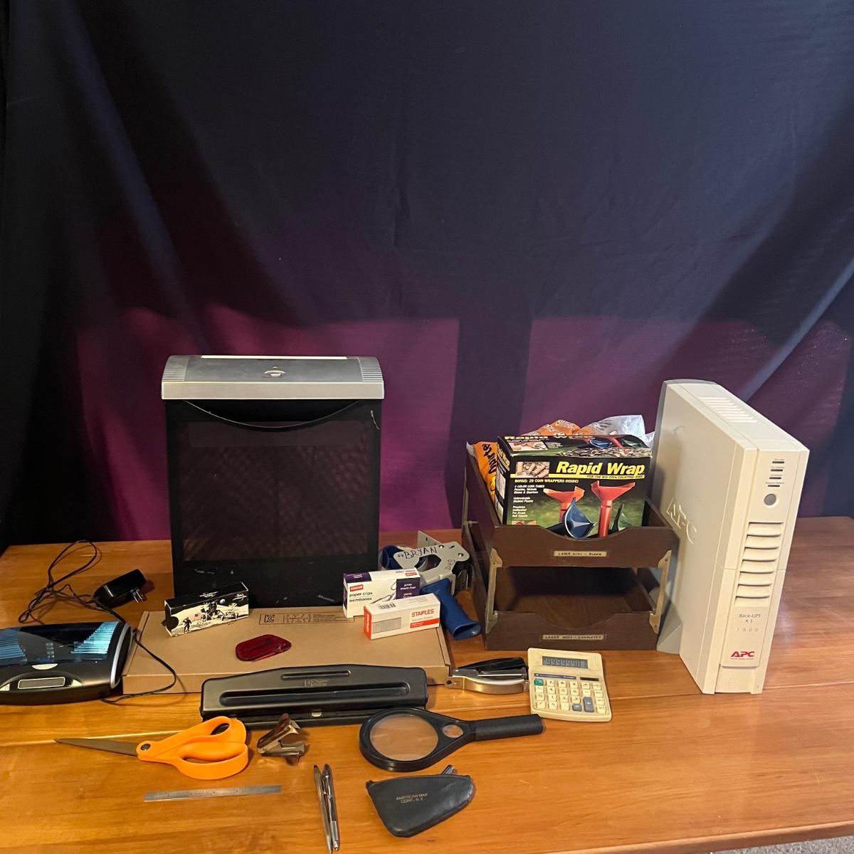 Lot includes a paper shredder, Rapid Wrap coin counter with coin sleeves, battery charger, Cross pen, two Fischer space pens, APC brand UPS that its missing battery, a corded keyboard, a wooden in/out tray, a stapler, a magnifying glass, a topographical map measuring tool and more. Shredder measures 12” x 7” x 15”H. Shredder and battery charger both powered on when plugged in.