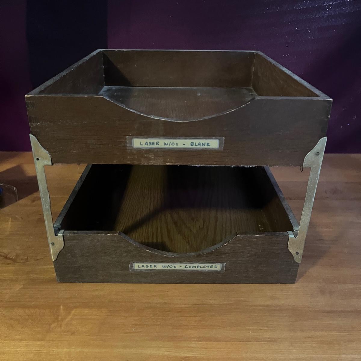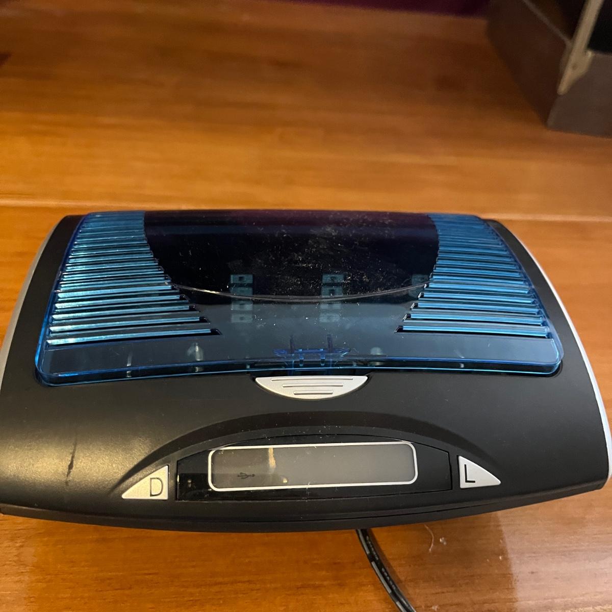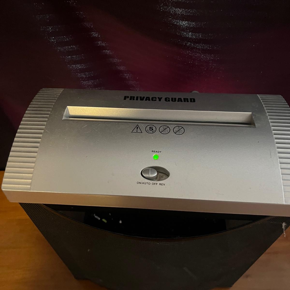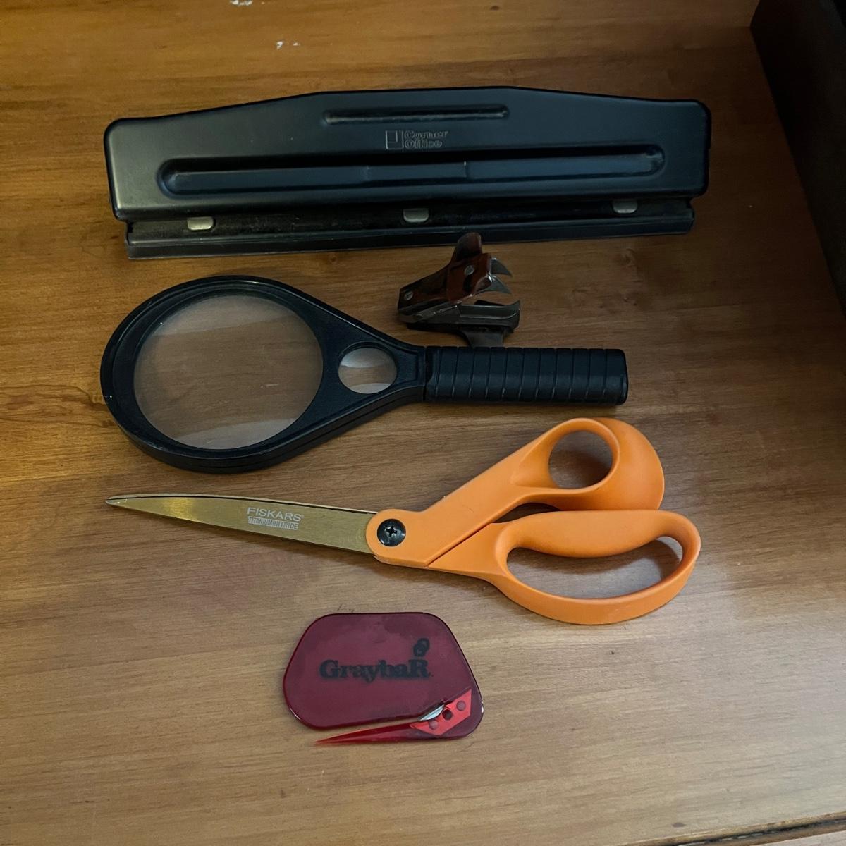 Lot includes a paper shredder, Rapid Wrap coin counter with coin sleeves, battery charger, Cross pen, two Fischer space pens, APC brand UPS that its missing battery, a corded keyboard, a wooden in/out tray, a stapler, a magnifying glass, a topographical map measuring tool and more. Shredder measures 12” x 7” x 15”H. Shredder and battery charger both powered on when plugged in.