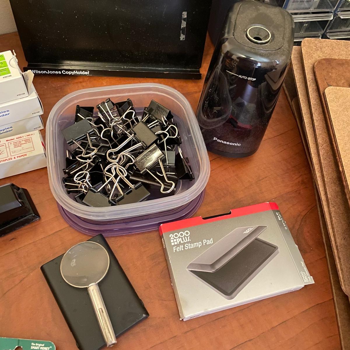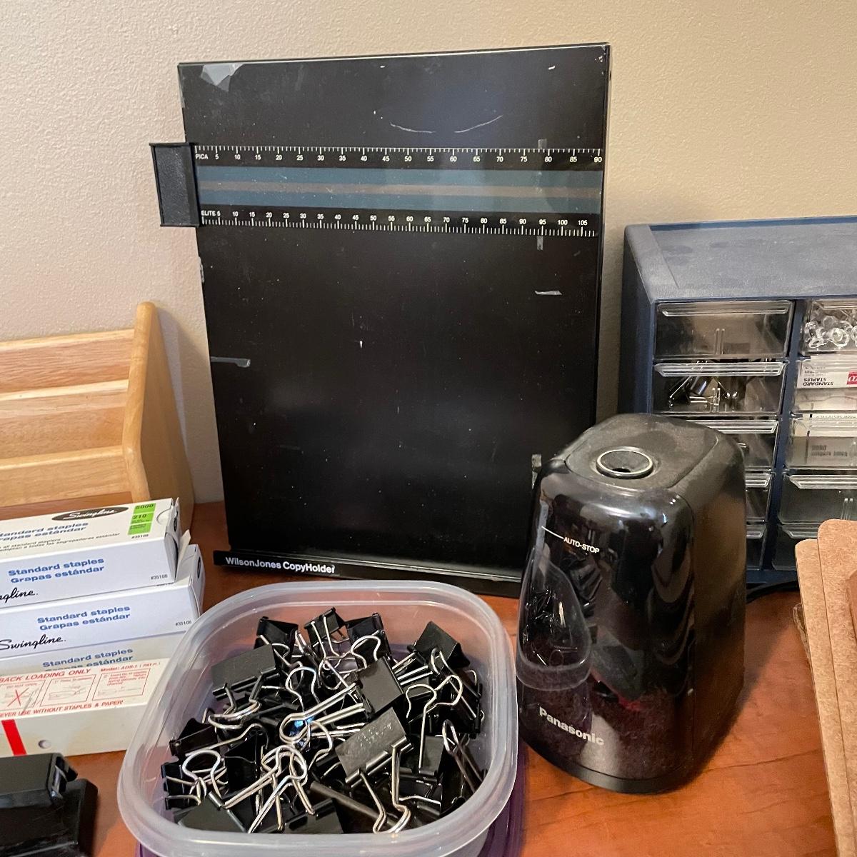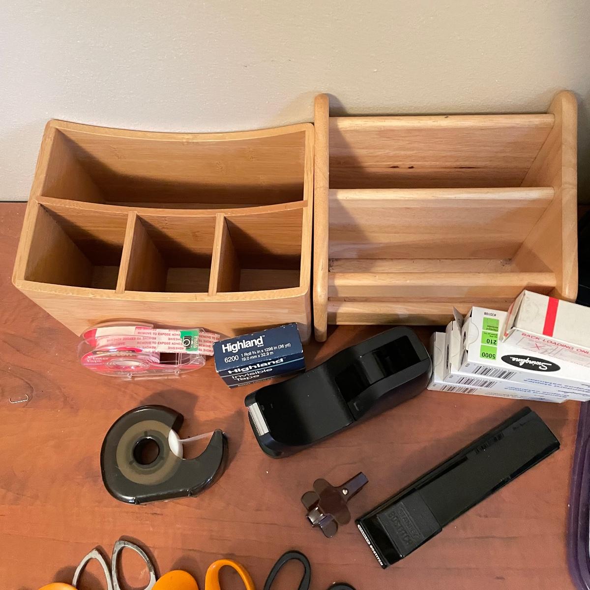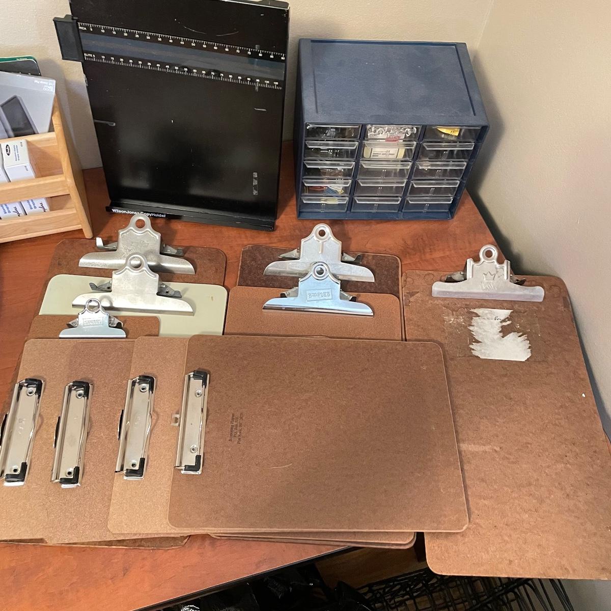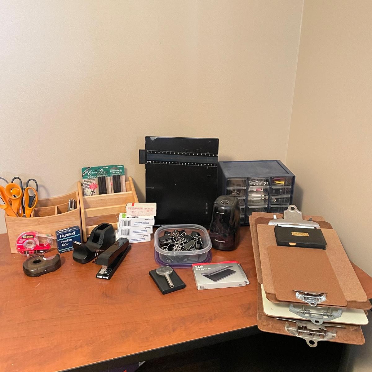 Great selection of office supplies for a home or office. Ten various sized clip boards, three are legal sized and six are letter sized. A Wilson-Jones Copy Holder, Panasonic electric pencil sharpener, plenty of staples, scissors, an ink pad, staplers and wooden organizers. The larger of the two measures approximately 8” x 5.5” x 5” and has four compartments. Lot offers a fifteen drawer organizer measuring 9” x 6.5” x 7.25”. Local pick up only.
