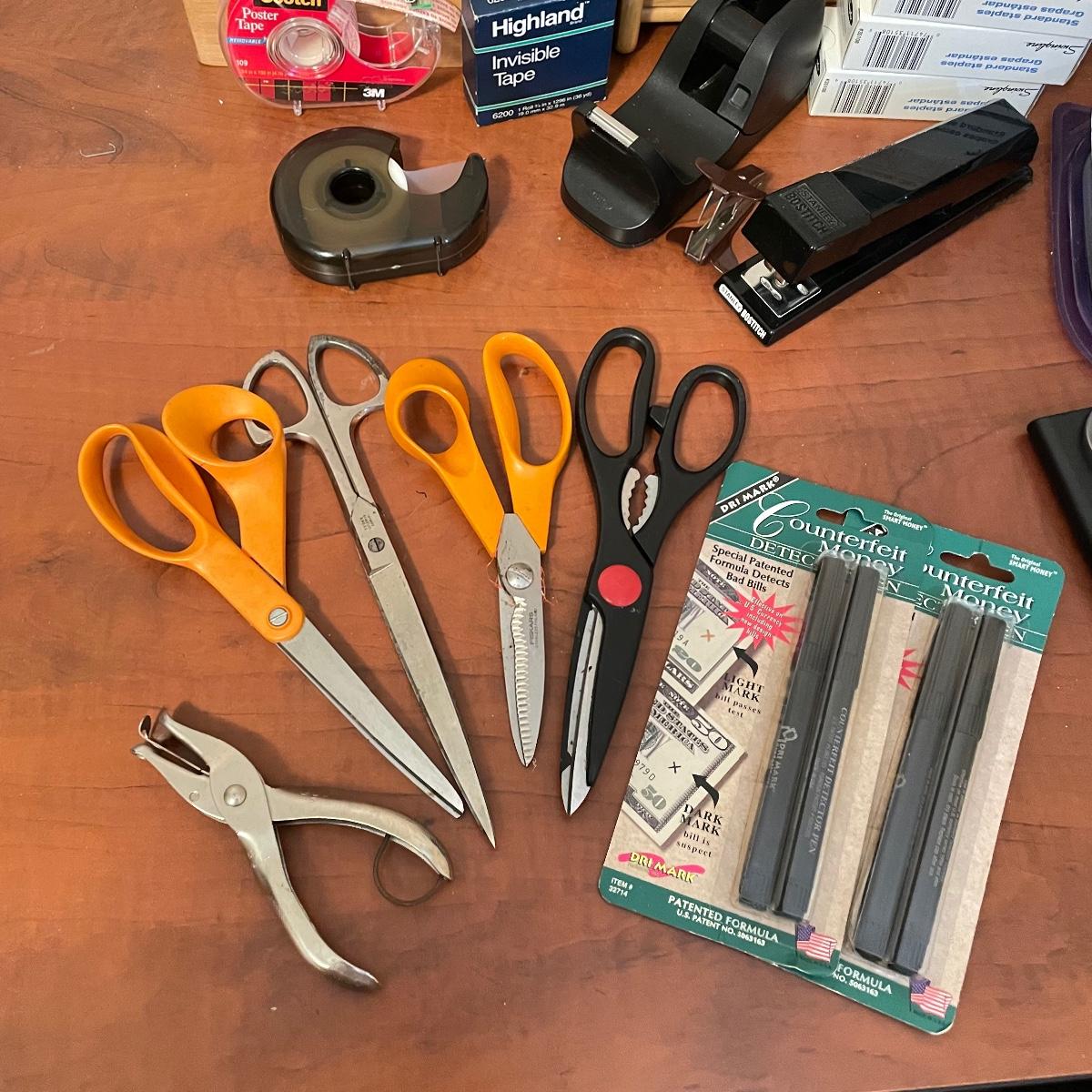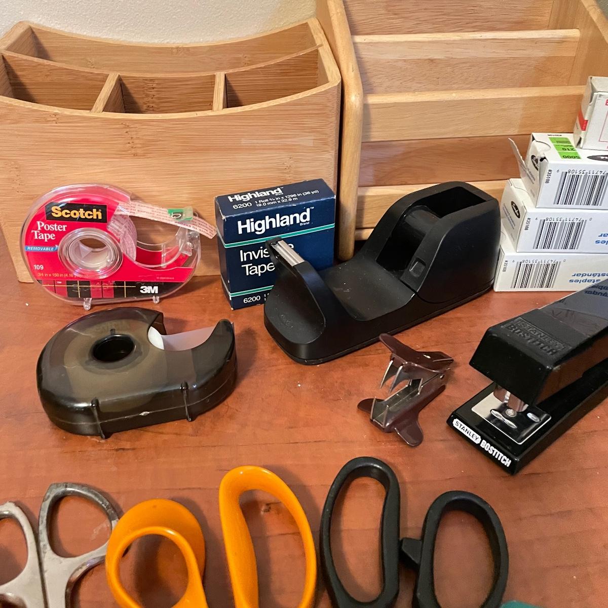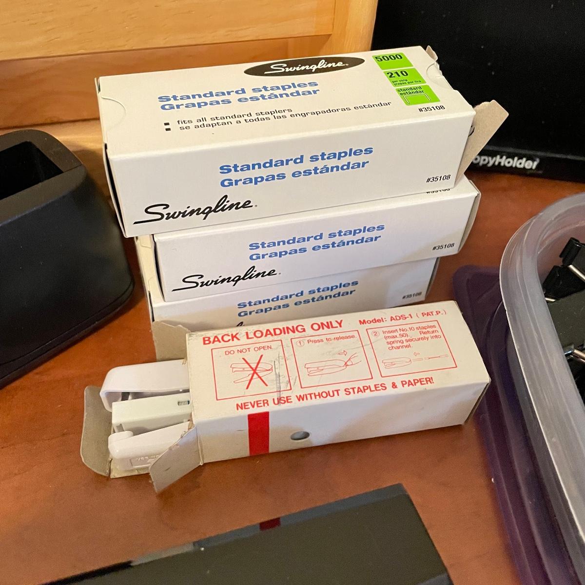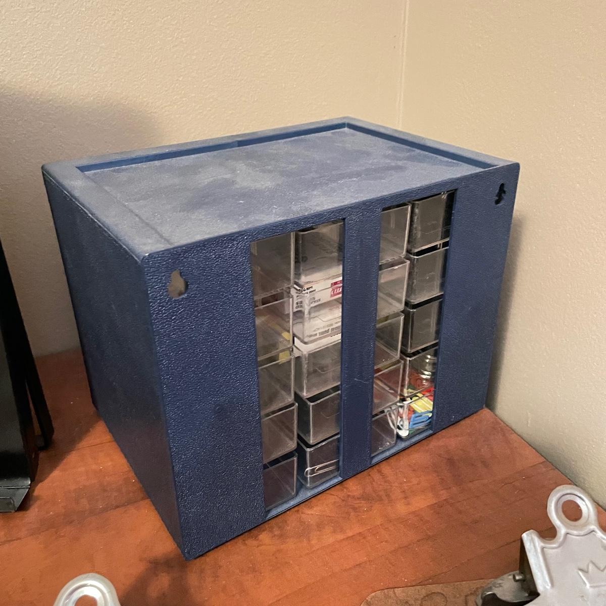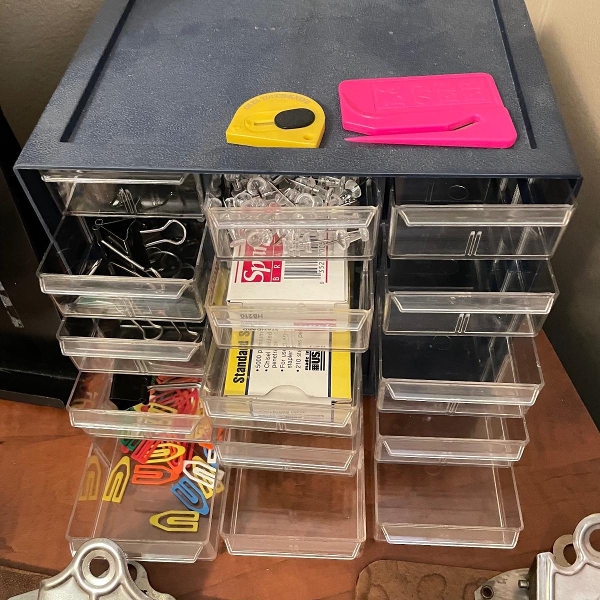 Great selection of office supplies for a home or office. Ten various sized clip boards, three are legal sized and six are letter sized. A Wilson-Jones Copy Holder, Panasonic electric pencil sharpener, plenty of staples, scissors, an ink pad, staplers and wooden organizers. The larger of the two measures approximately 8” x 5.5” x 5” and has four compartments. Lot offers a fifteen drawer organizer measuring 9” x 6.5” x 7.25”. Local pick up only.
