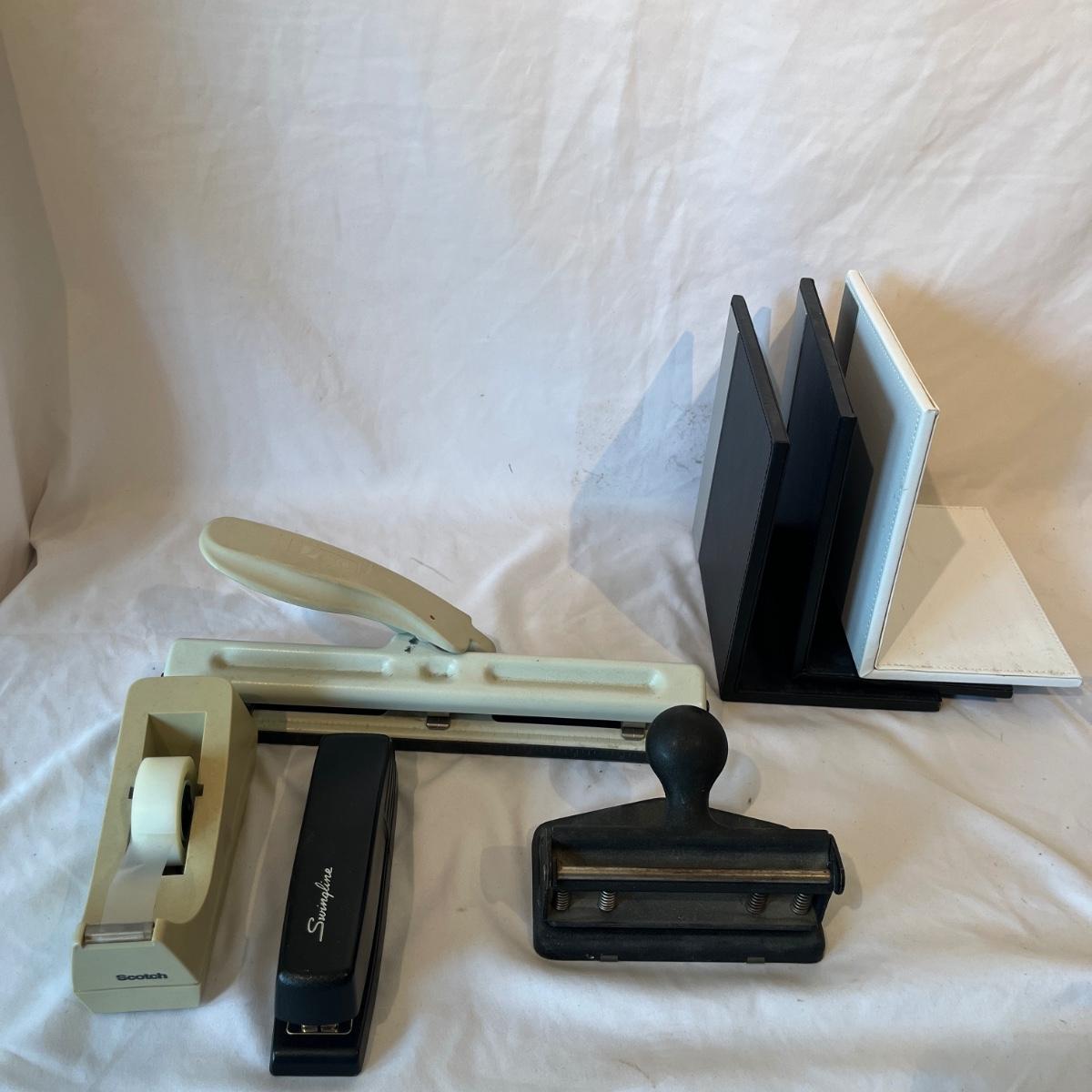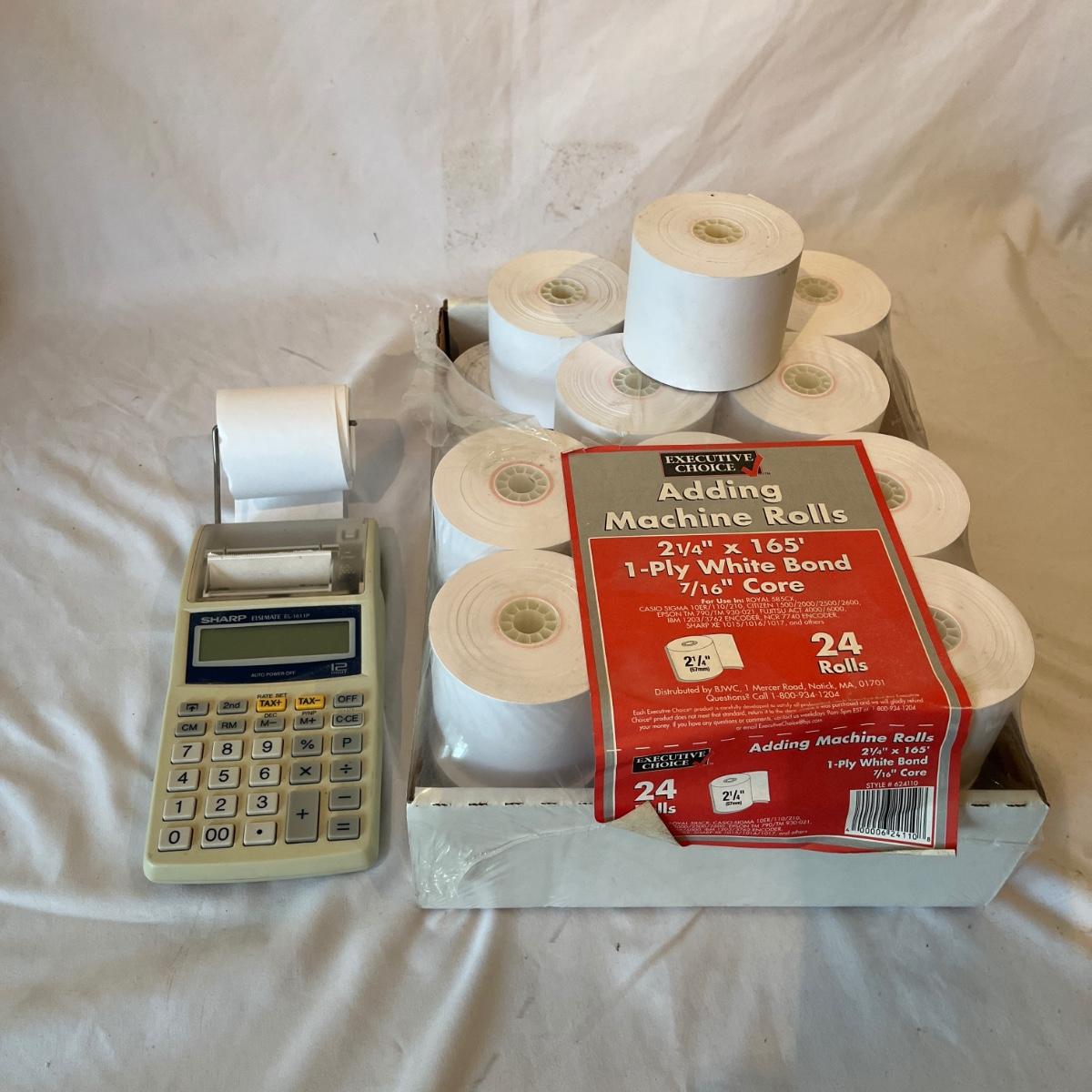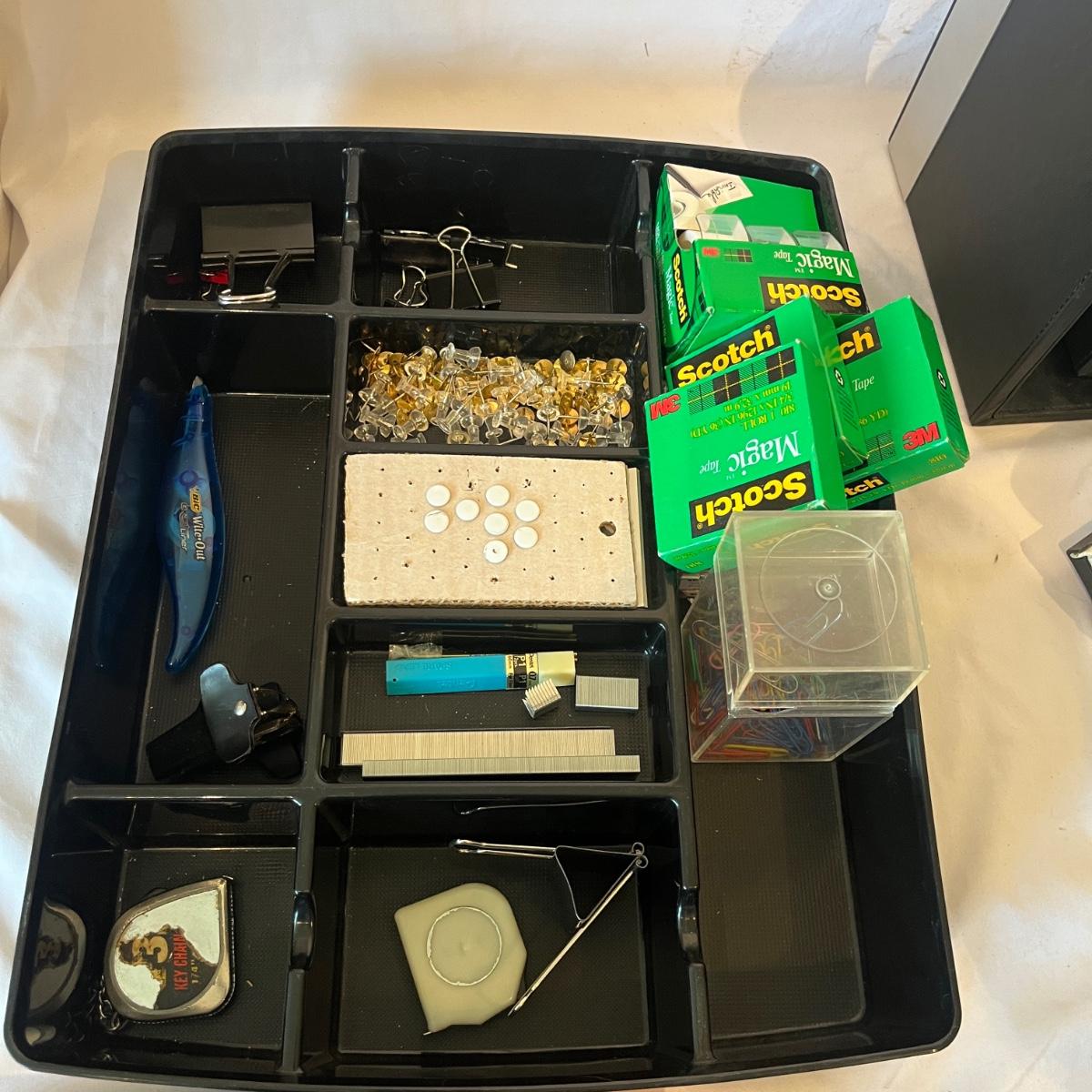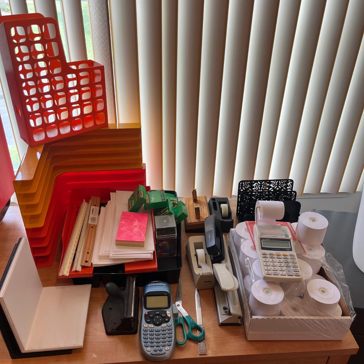 Lot includes Dymo labeler, Sharp adding machine with extra paper, hole punches, scissors, rulers, tape dispenser and tape, file holders and more. Dymo and adding machine both powered on when turned on.