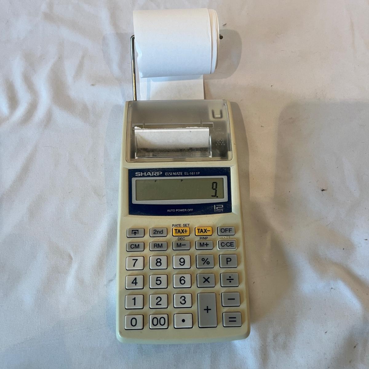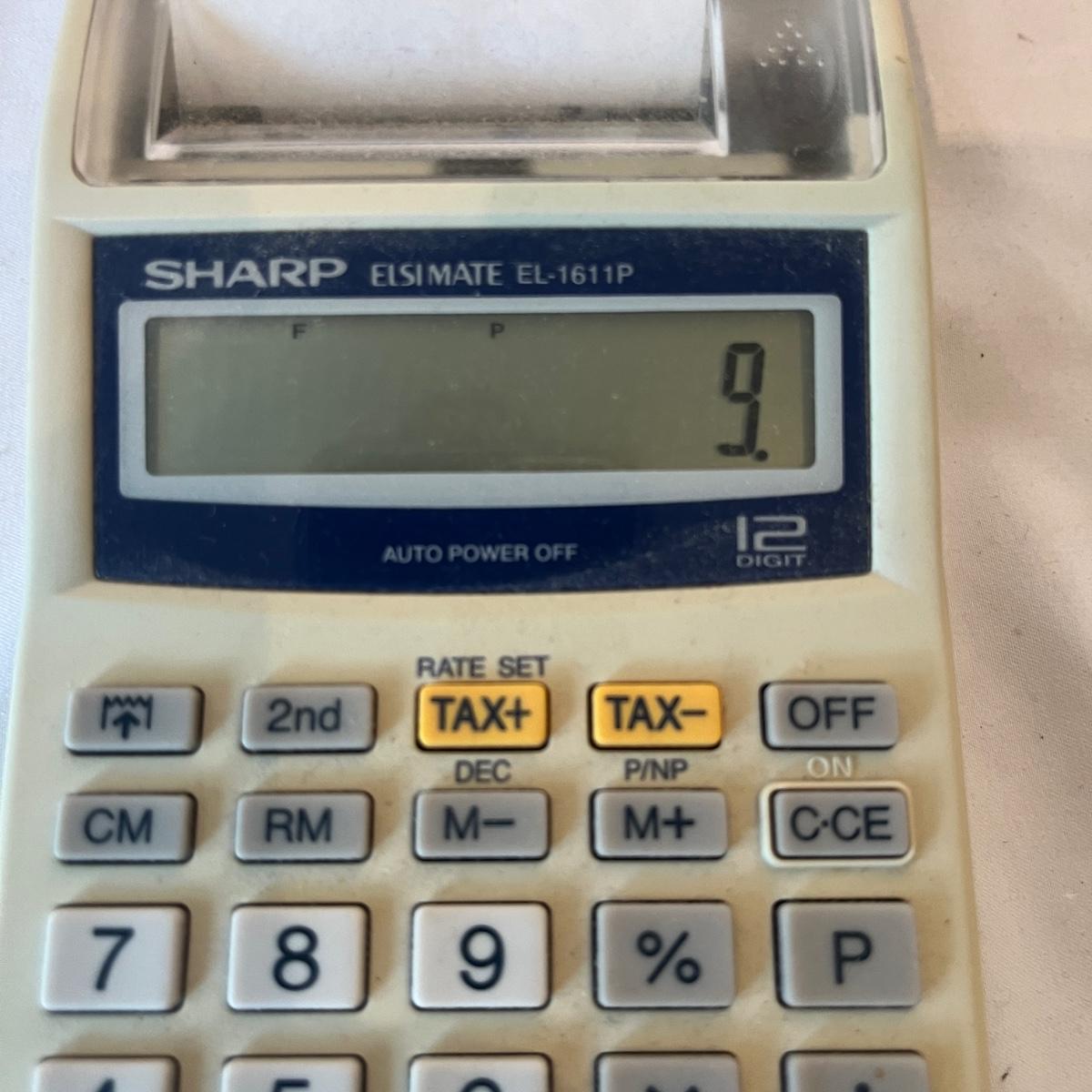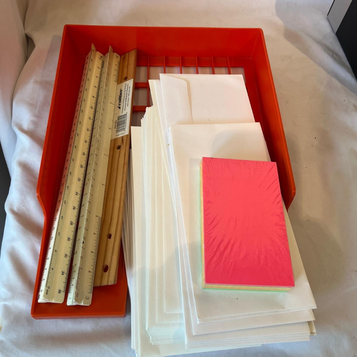 Lot includes Dymo labeler, Sharp adding machine with extra paper, hole punches, scissors, rulers, tape dispenser and tape, file holders and more. Dymo and adding machine both powered on when turned on.