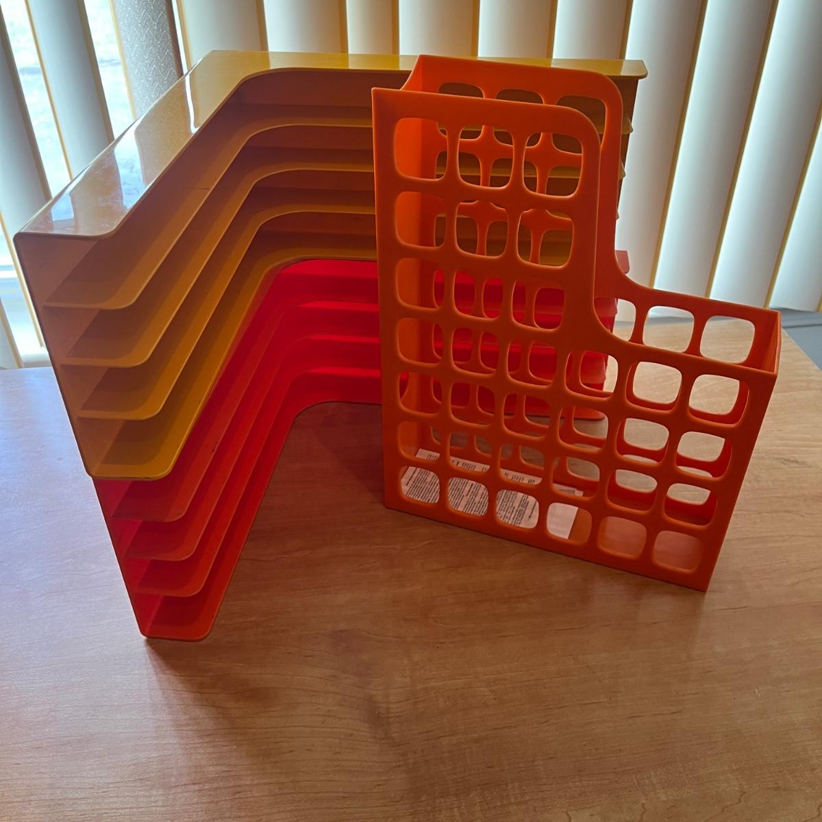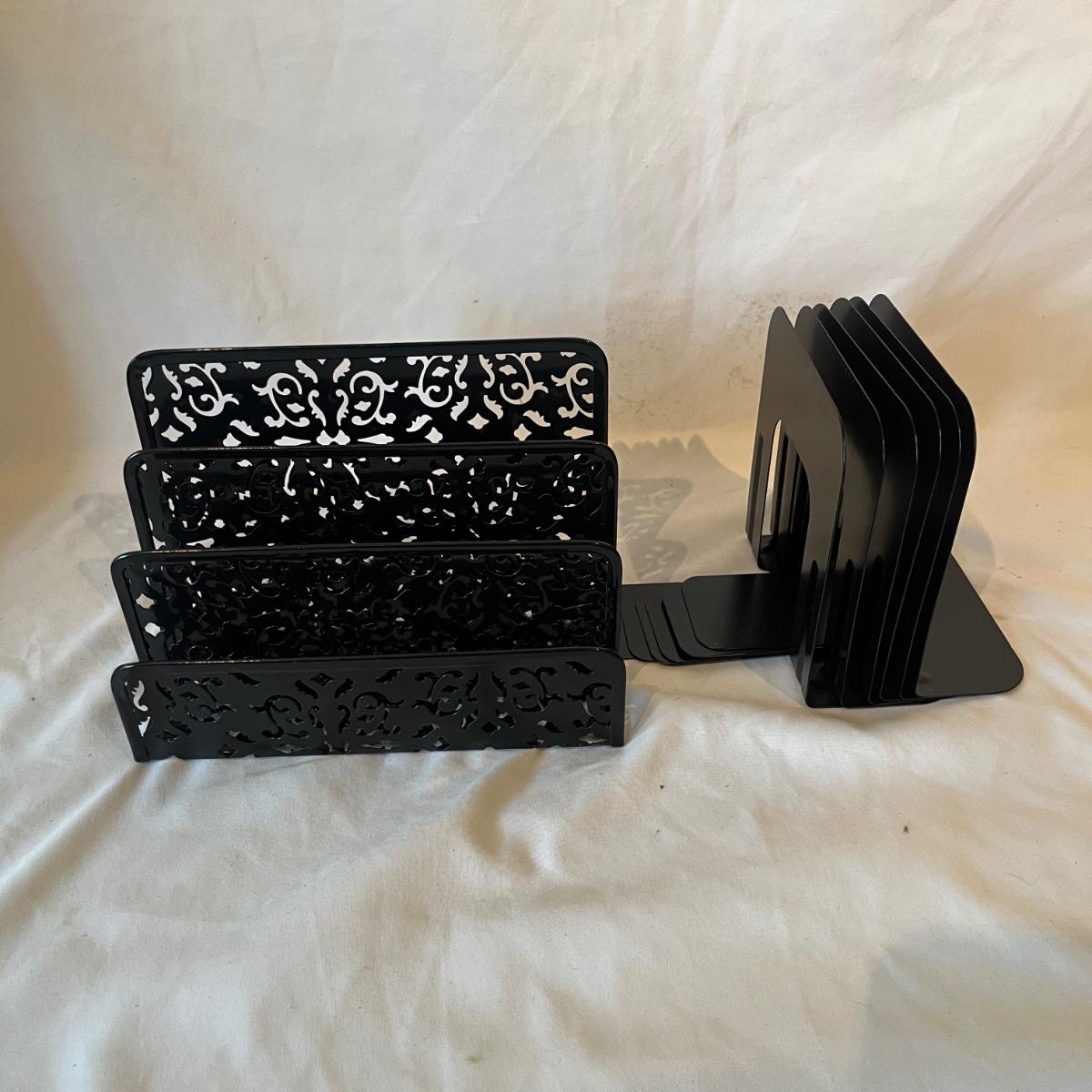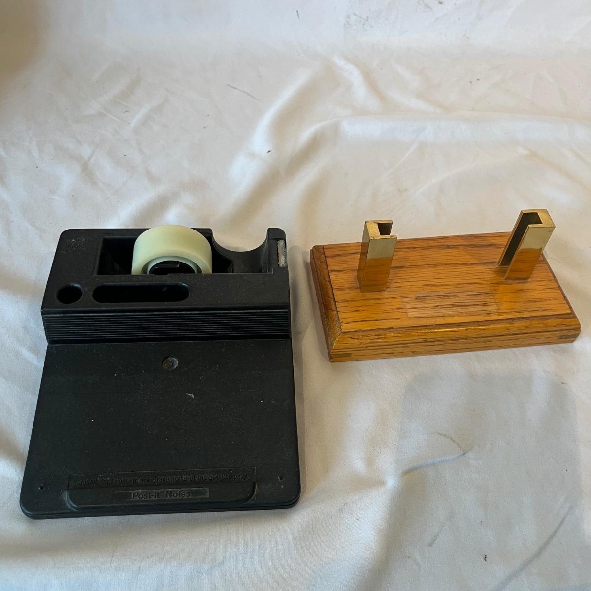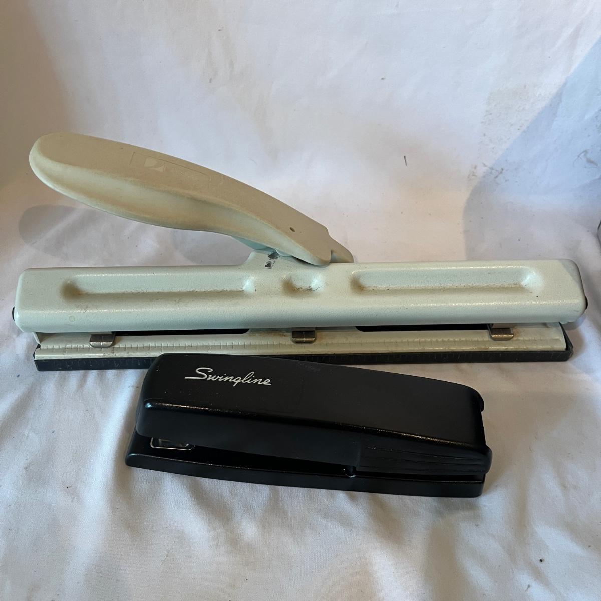 Lot includes Dymo labeler, Sharp adding machine with extra paper, hole punches, scissors, rulers, tape dispenser and tape, file holders and more. Dymo and adding machine both powered on when turned on.