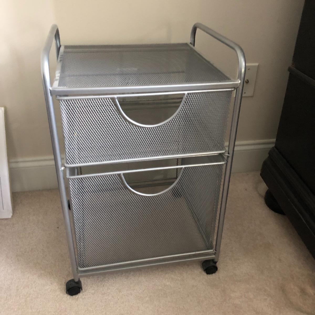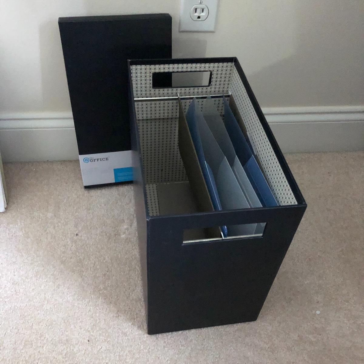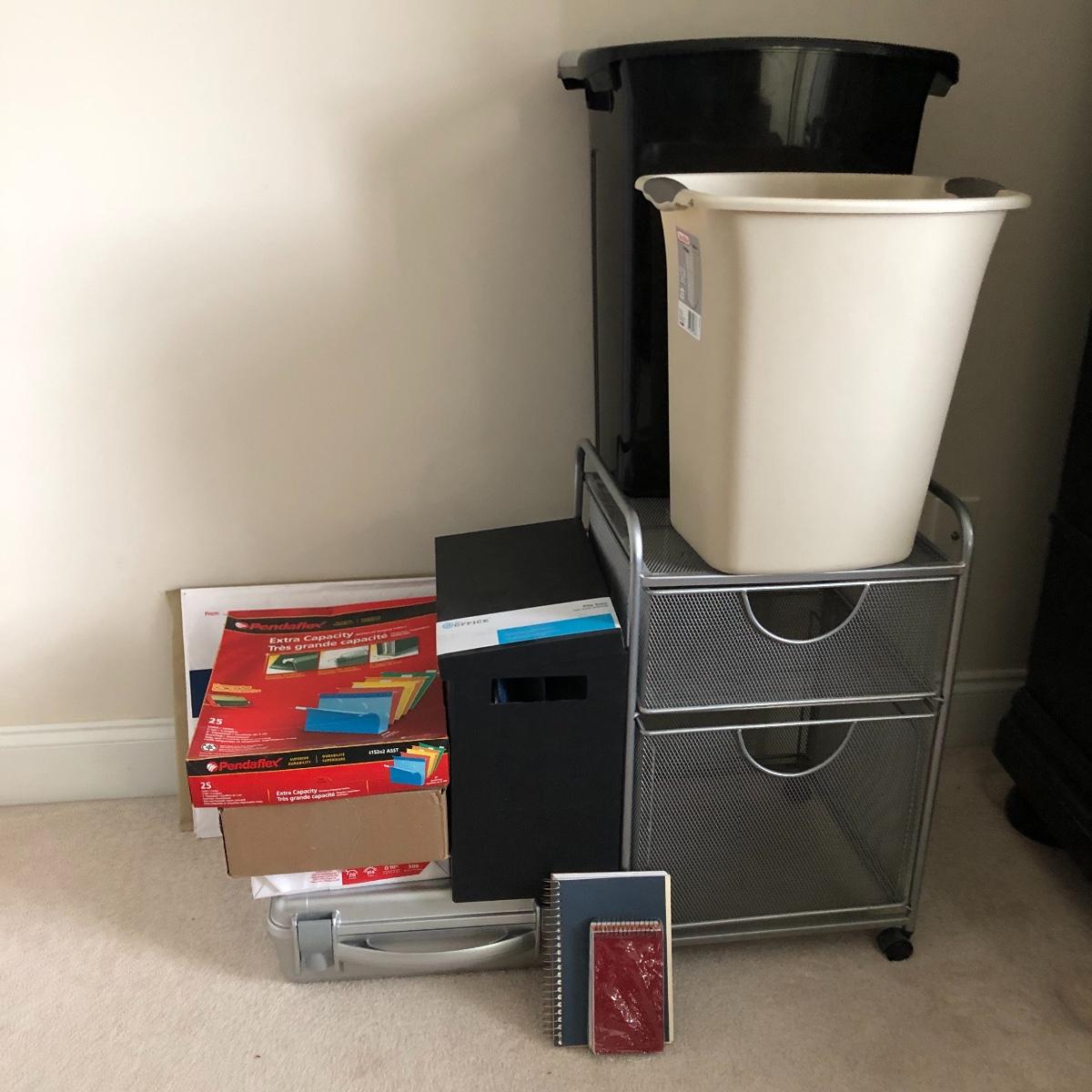 Lot includes two wastebaskets, metal cabinet, plastic carrying case and file holder, paper, file holders and more. Metal cabinet measures 15” x 15” x 23”.