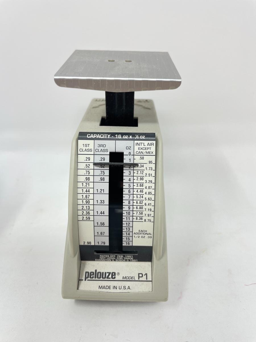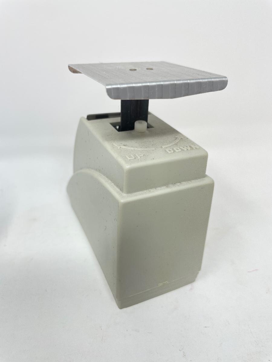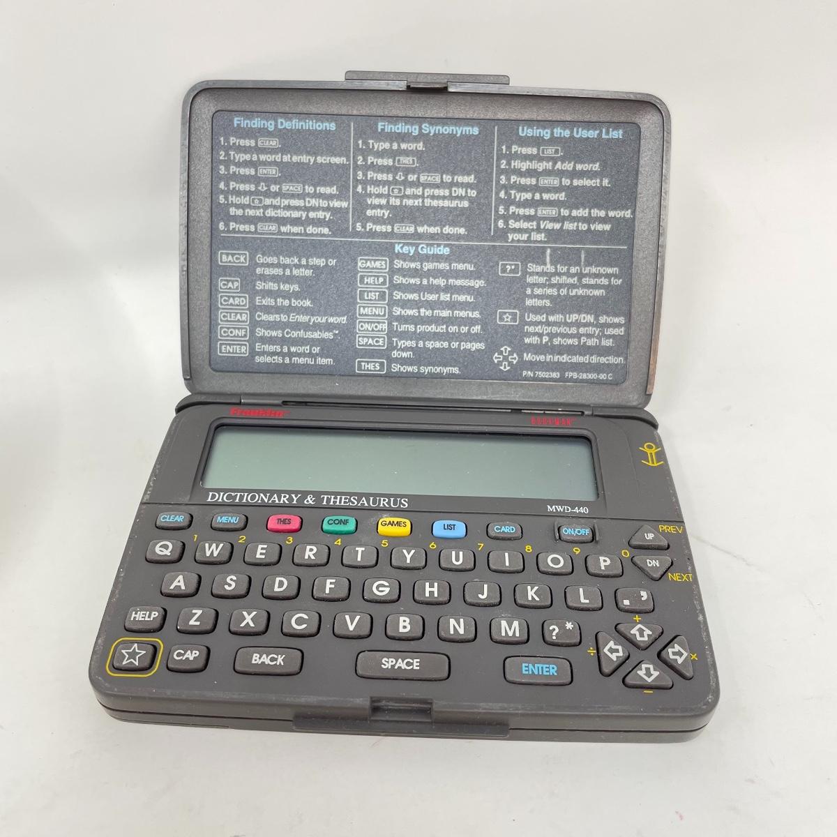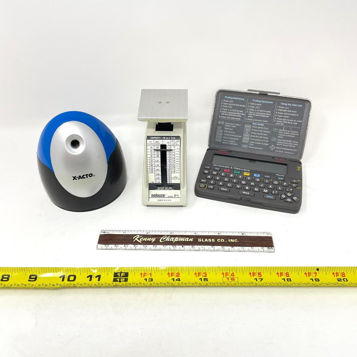 Lot includes a X-ACTO battery pencil sharpener, shipping scale, electronic dictionary and thesaurus, and plastic ruler. All in good physical condition, but not tested.