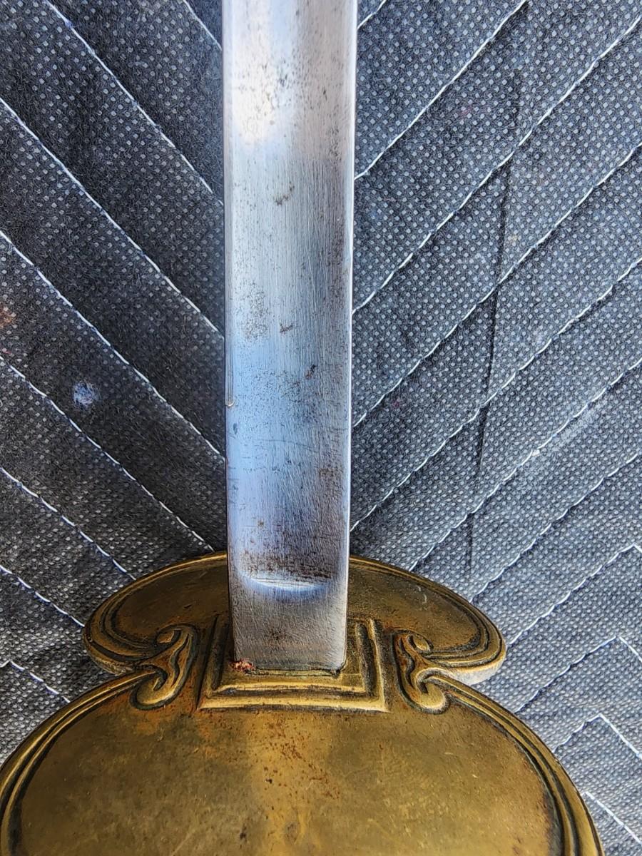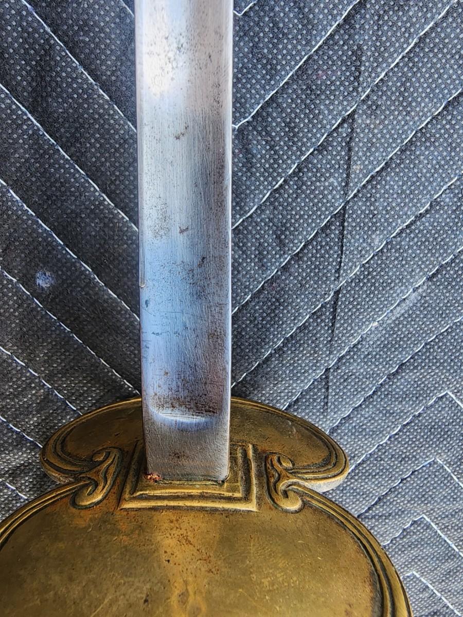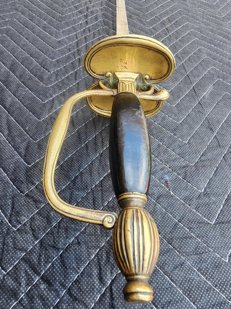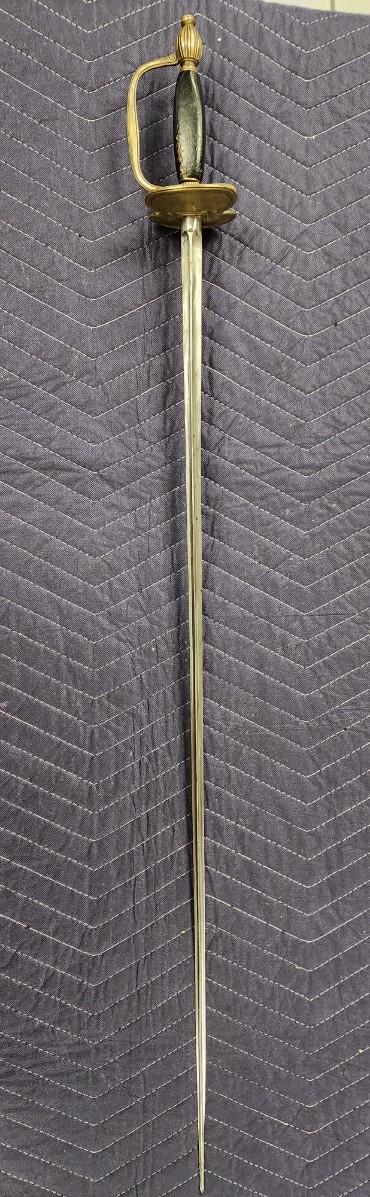 1787 French FA Epee' D' Officer Smallsword. Fencing blade (possibly has been replaced) with a length of 34" and width of 11/16". The handle is black leather and brass (pasden, guard, and hilt appear authentic). No scabbard. Good condition. Original, except blade.