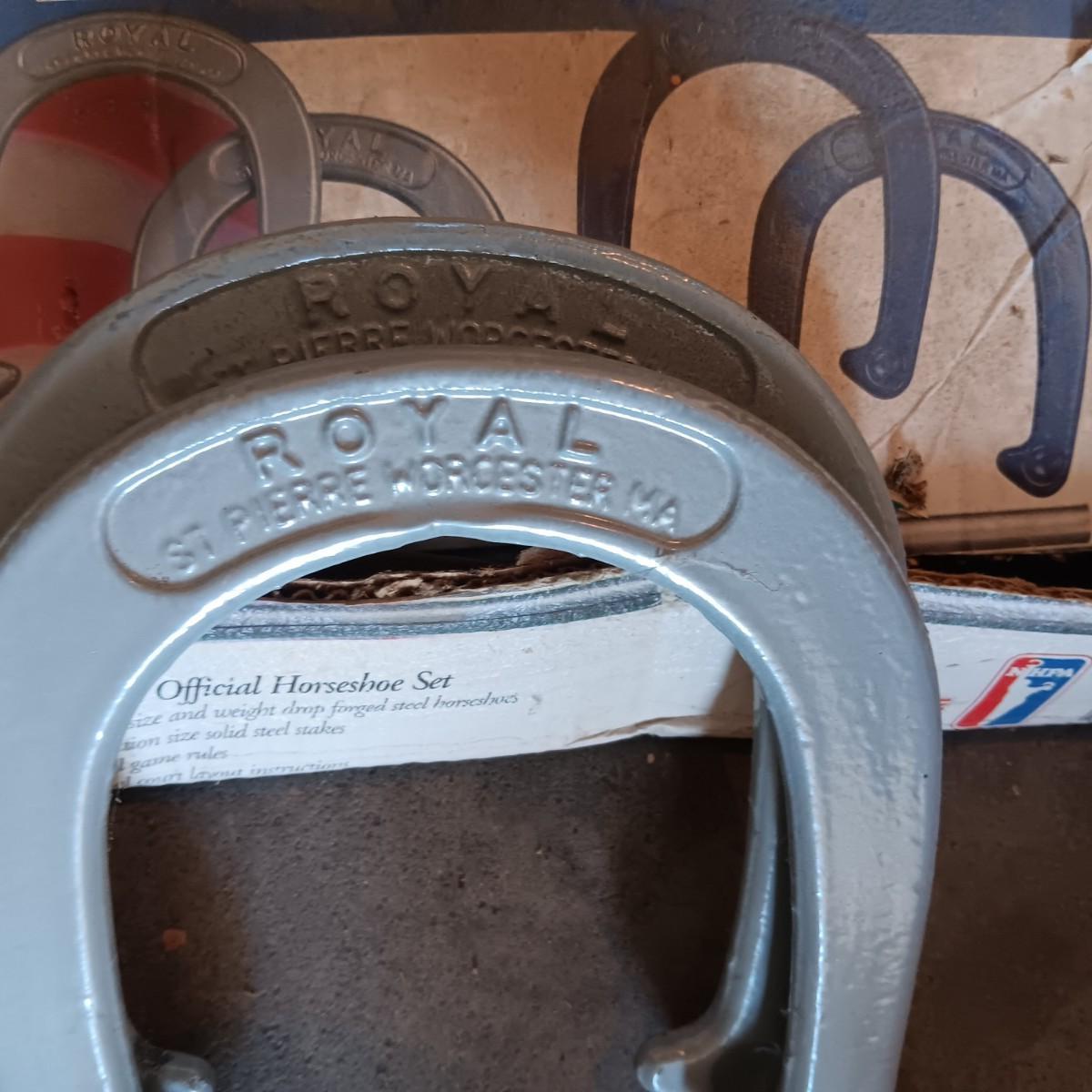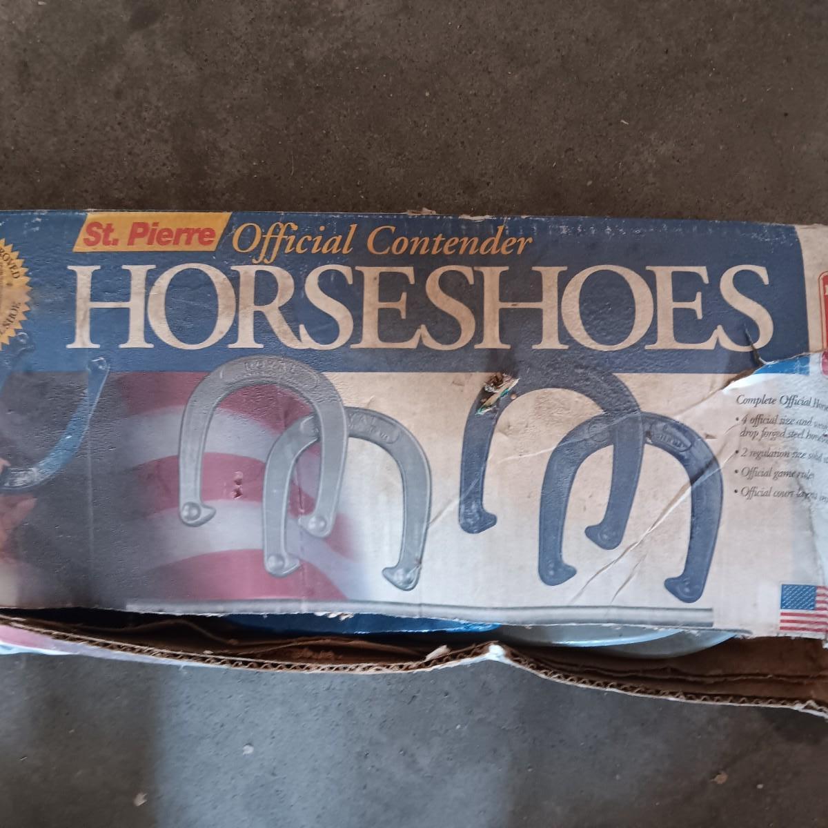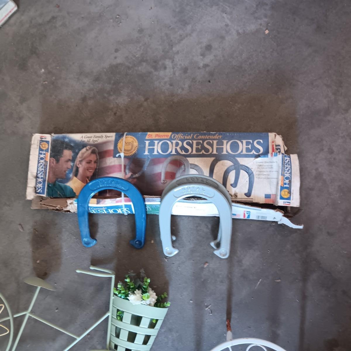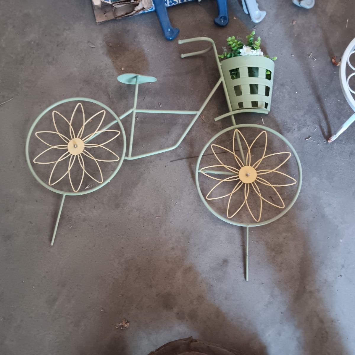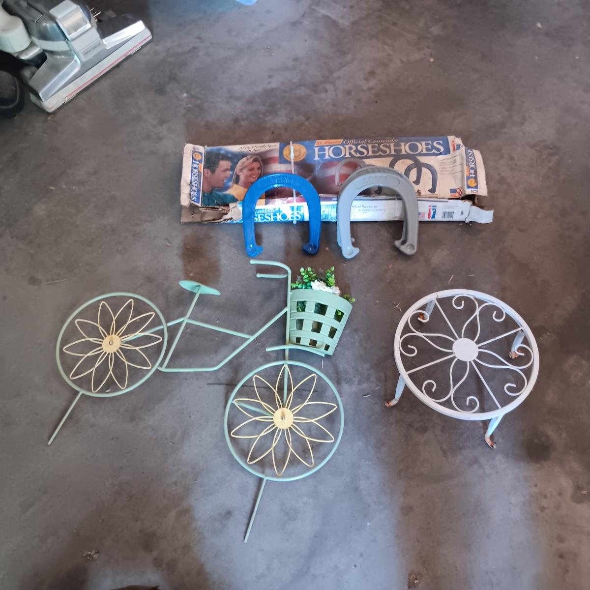 OFFICIAL CONTENDER HORSESHOES, STAKED BICYCLE YARD ART AND SHORT PLANT STAND