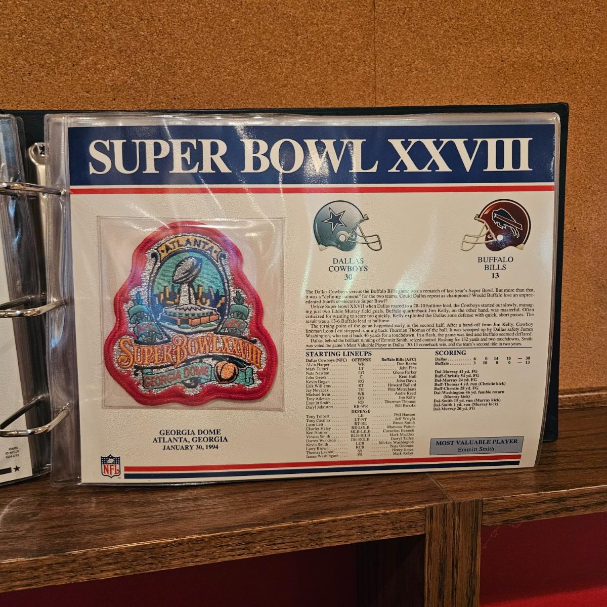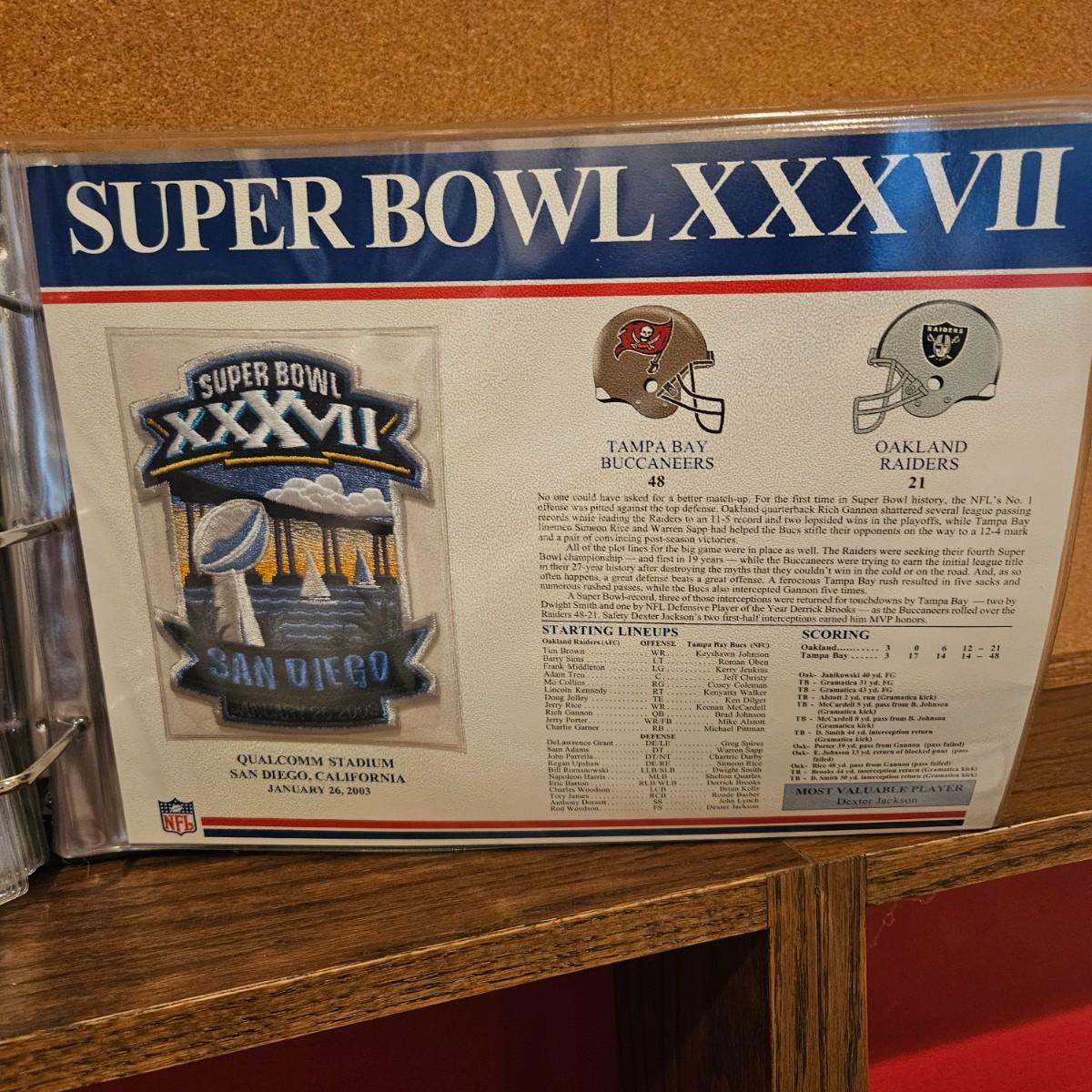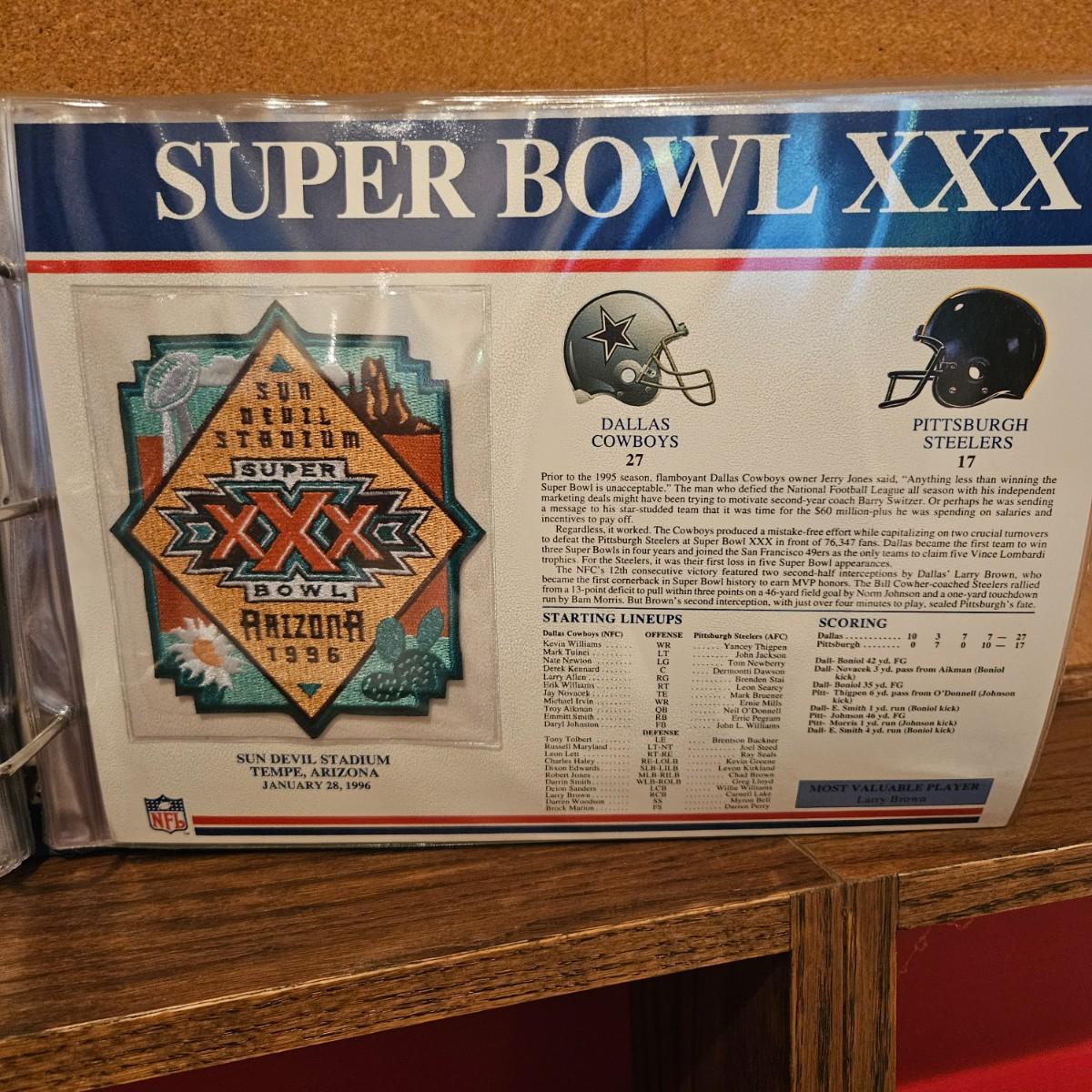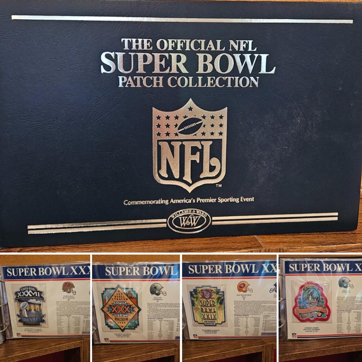 A flip folder that contains an assortment of official Super Bowl patches. It includes patches from seven Super Bowls with stat sheets and a dozen empty sheet. It measures approximately 15.5" x 4" x 10"H. Shipping available