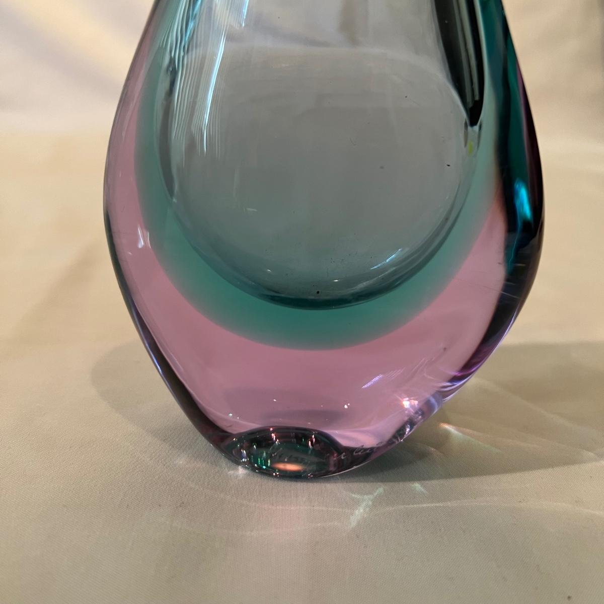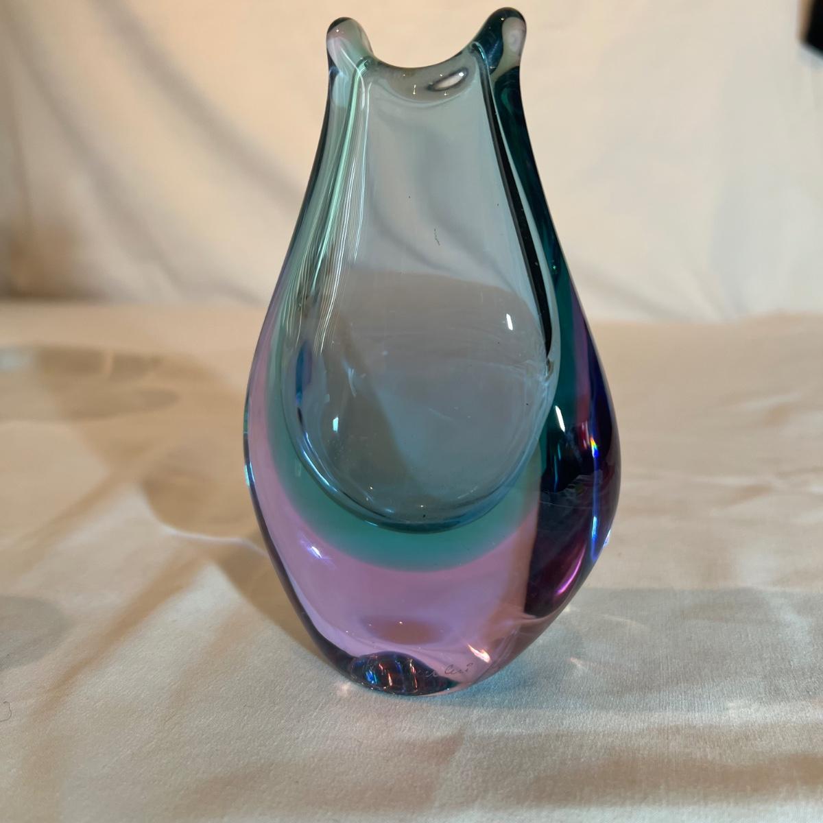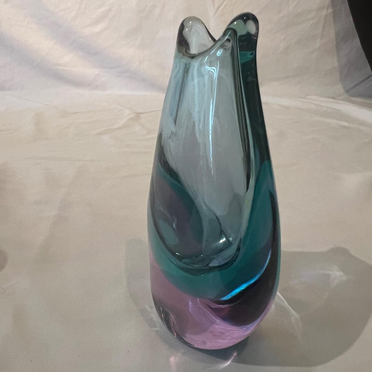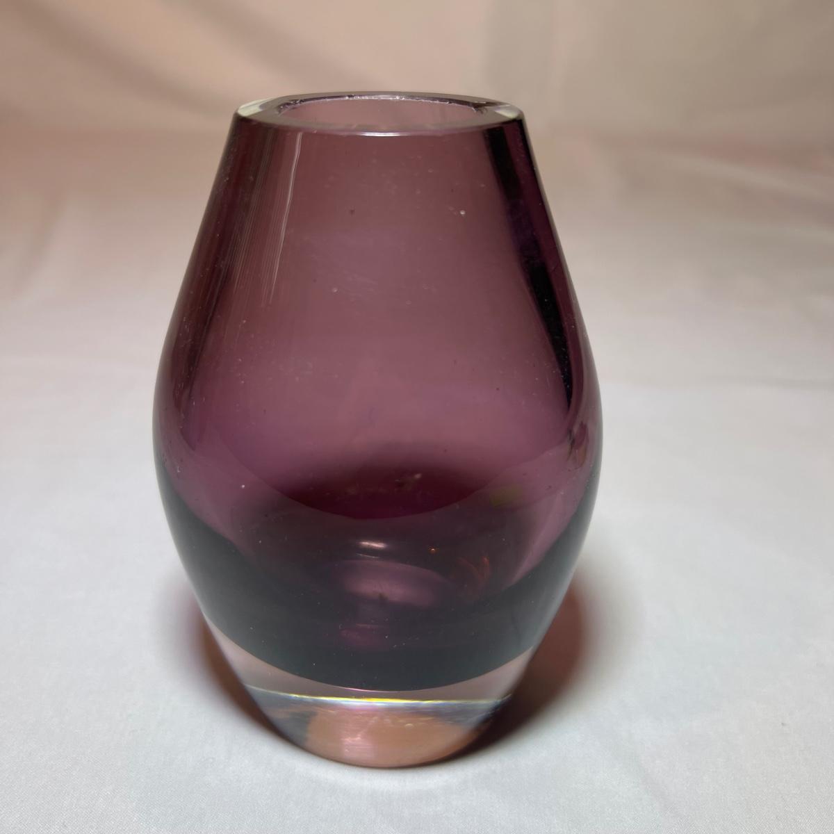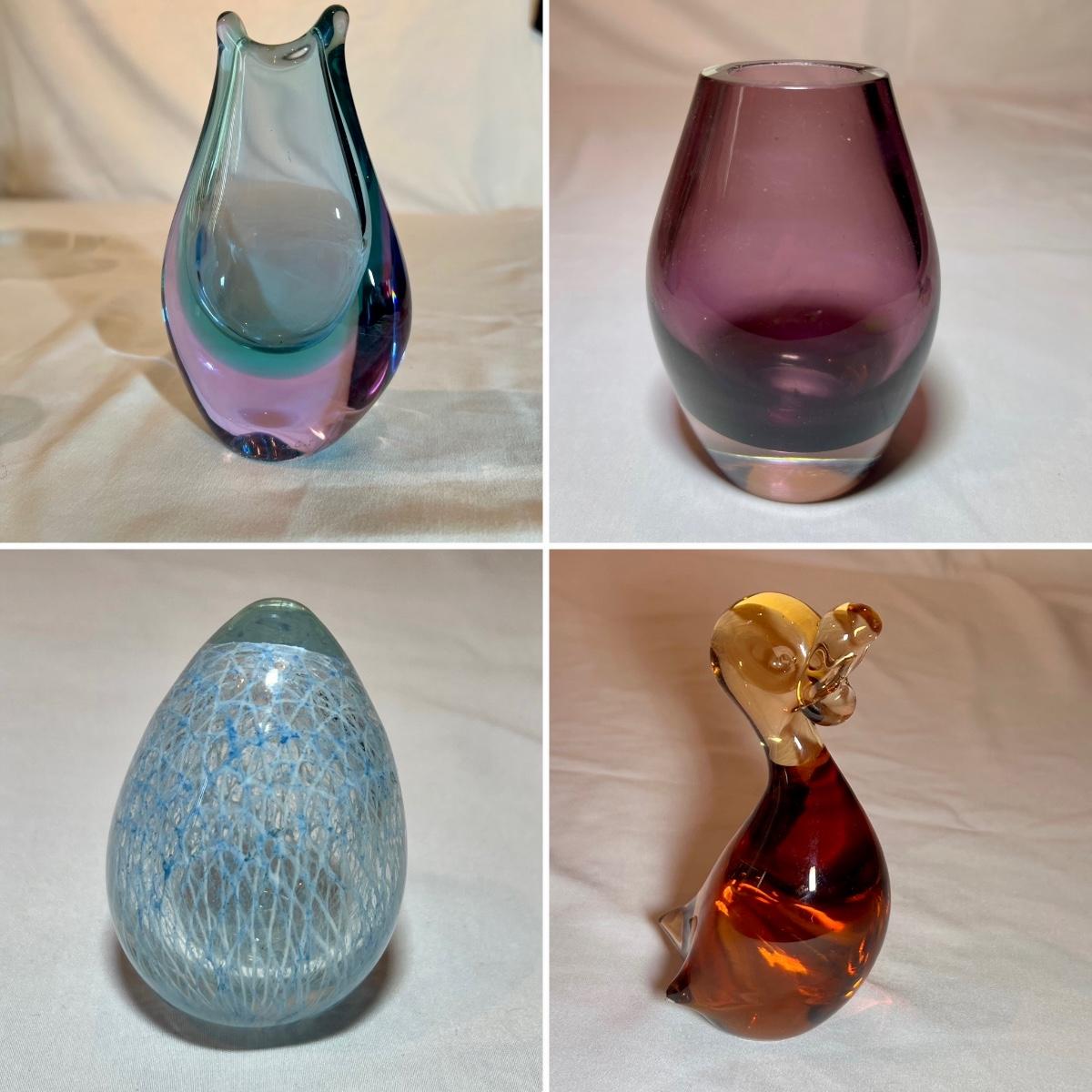 Four hand blown glass items includes a stunning pale blue and mauve Oggetti vase which measures 3” x 1.5” x 5.5”H. No marking were found on the other three items which includes a unique hand blown decorative egg, an amber duck and a purple vase; vase has a smooth, small chip in the rim and the duck has the very tip of one of the three feathers chipped off.