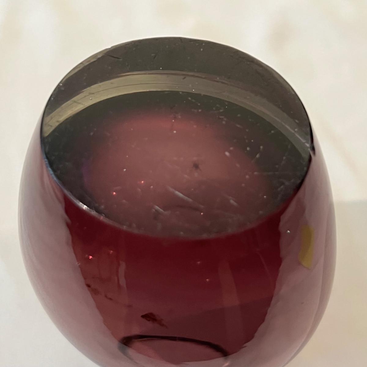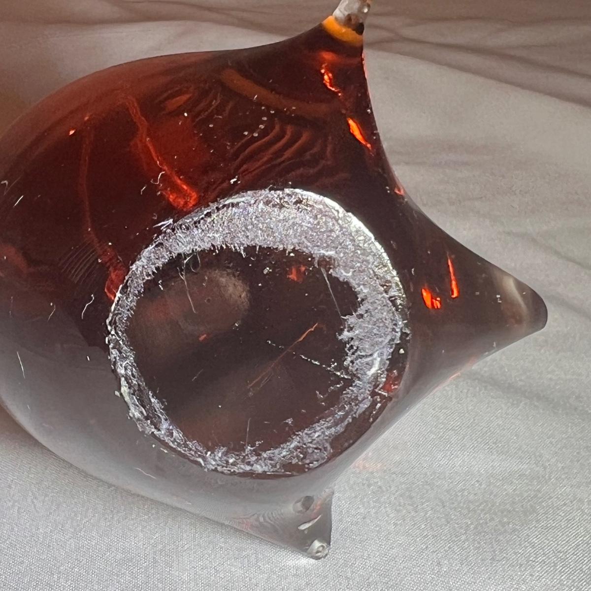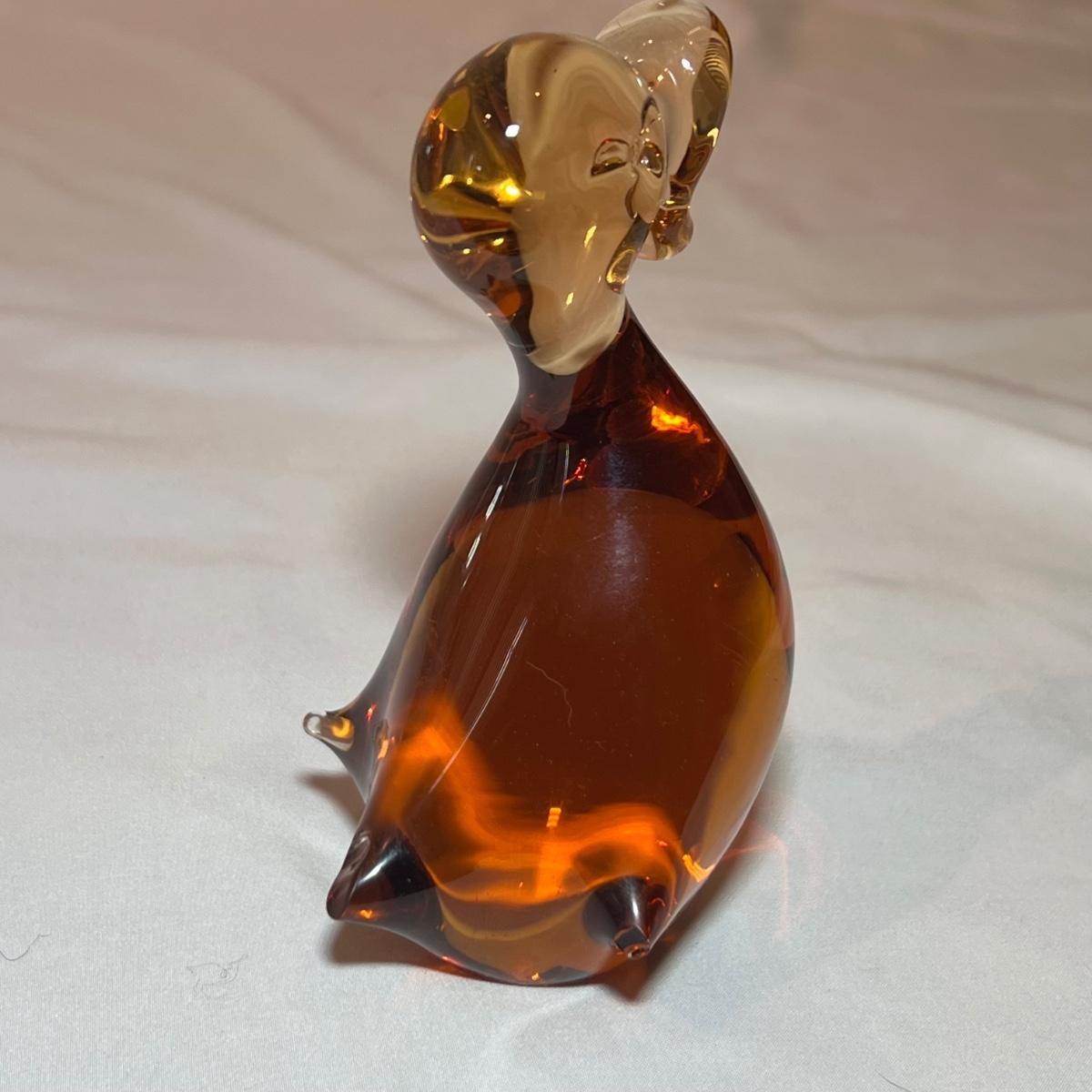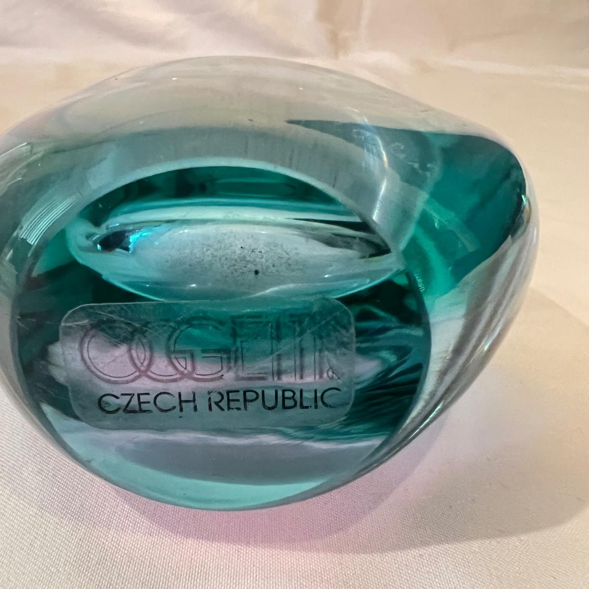 Four hand blown glass items includes a stunning pale blue and mauve Oggetti vase which measures 3” x 1.5” x 5.5”H. No marking were found on the other three items which includes a unique hand blown decorative egg, an amber duck and a purple vase; vase has a smooth, small chip in the rim and the duck has the very tip of one of the three feathers chipped off.