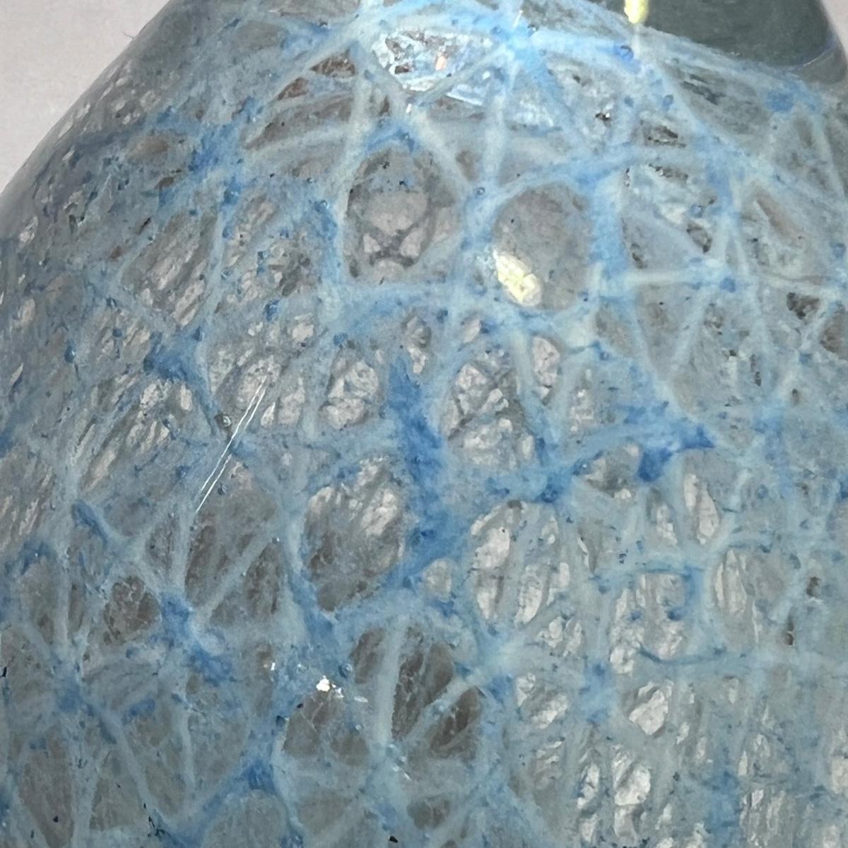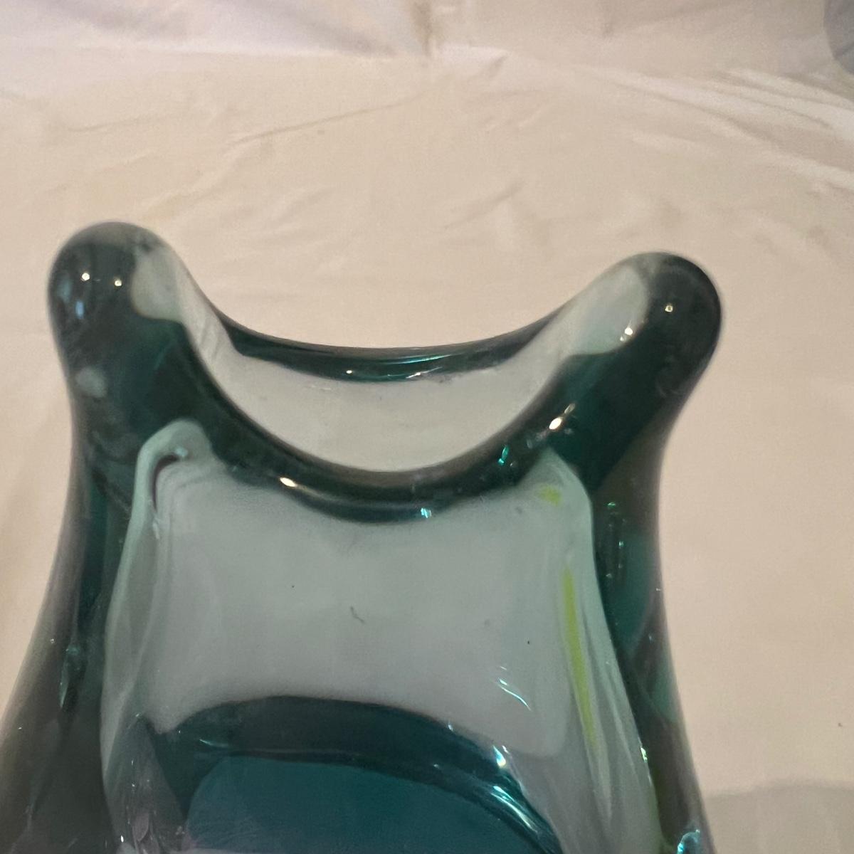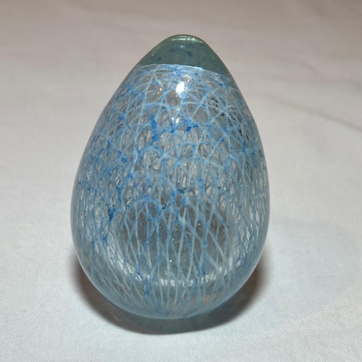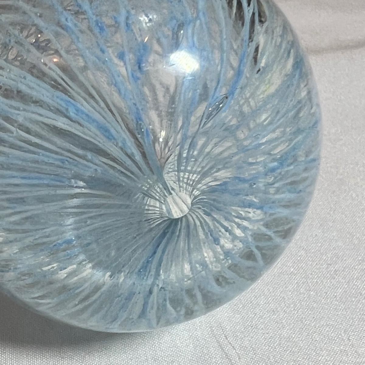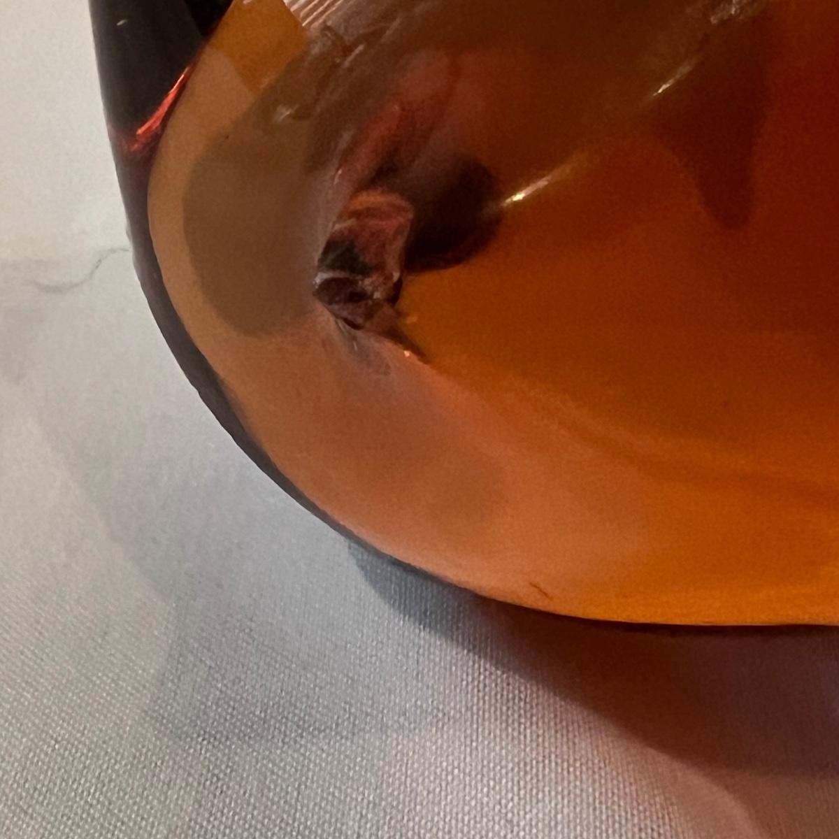 Four hand blown glass items includes a stunning pale blue and mauve Oggetti vase which measures 3” x 1.5” x 5.5”H. No marking were found on the other three items which includes a unique hand blown decorative egg, an amber duck and a purple vase; vase has a smooth, small chip in the rim and the duck has the very tip of one of the three feathers chipped off.