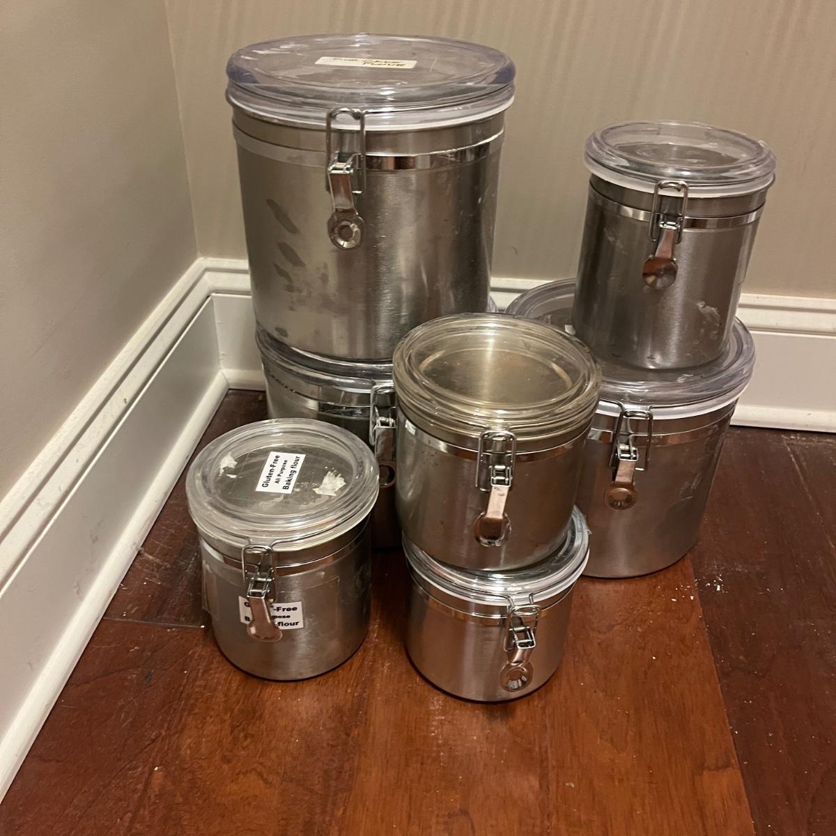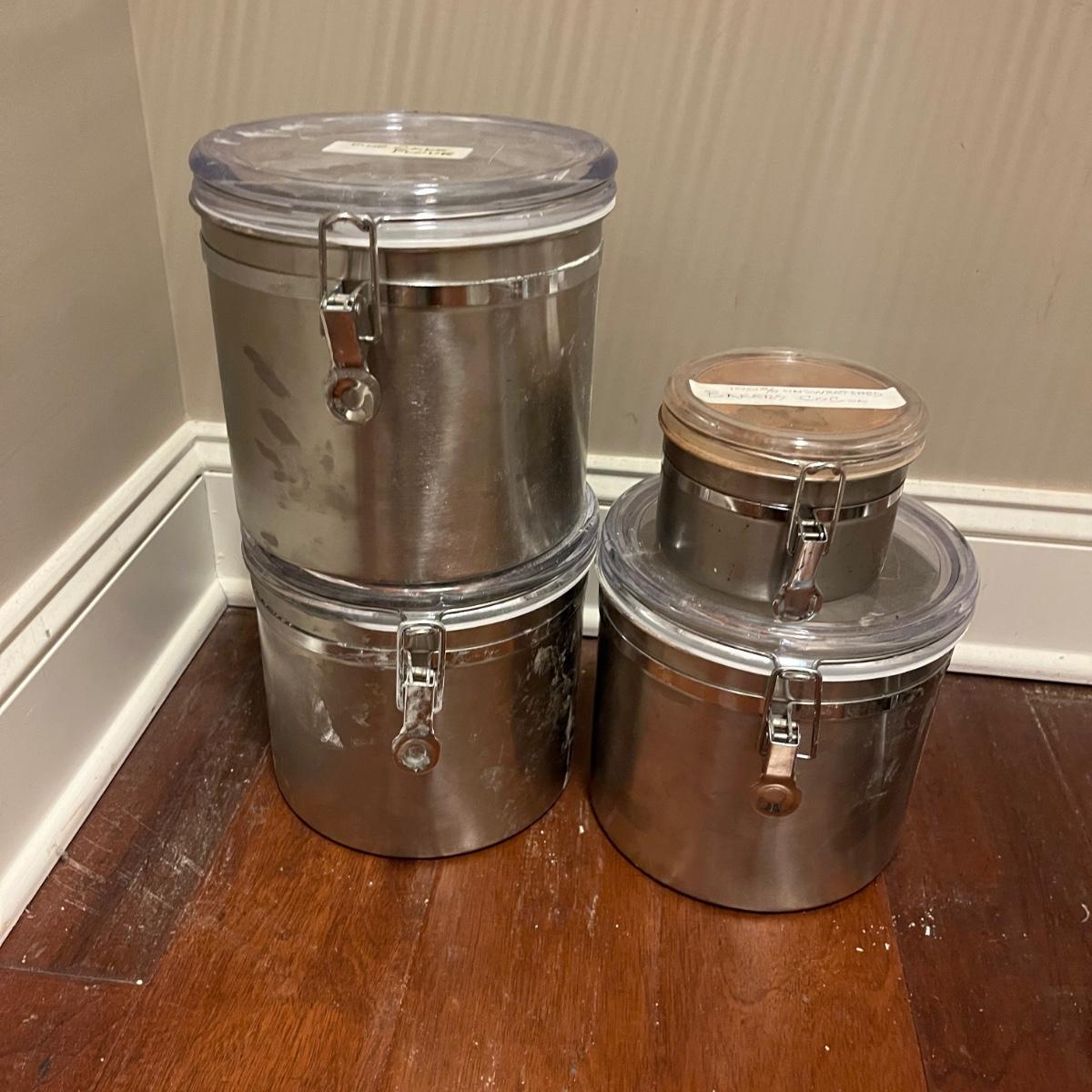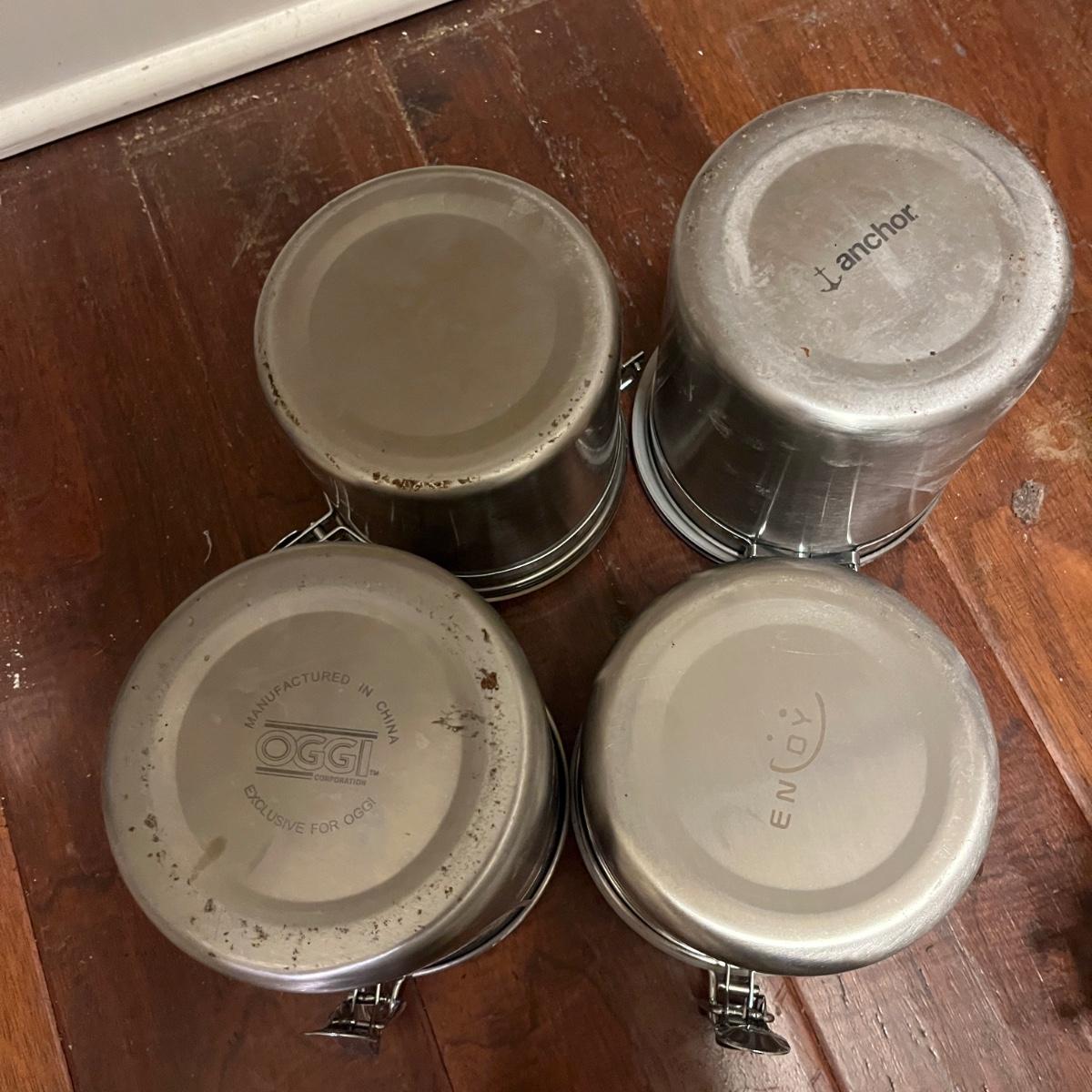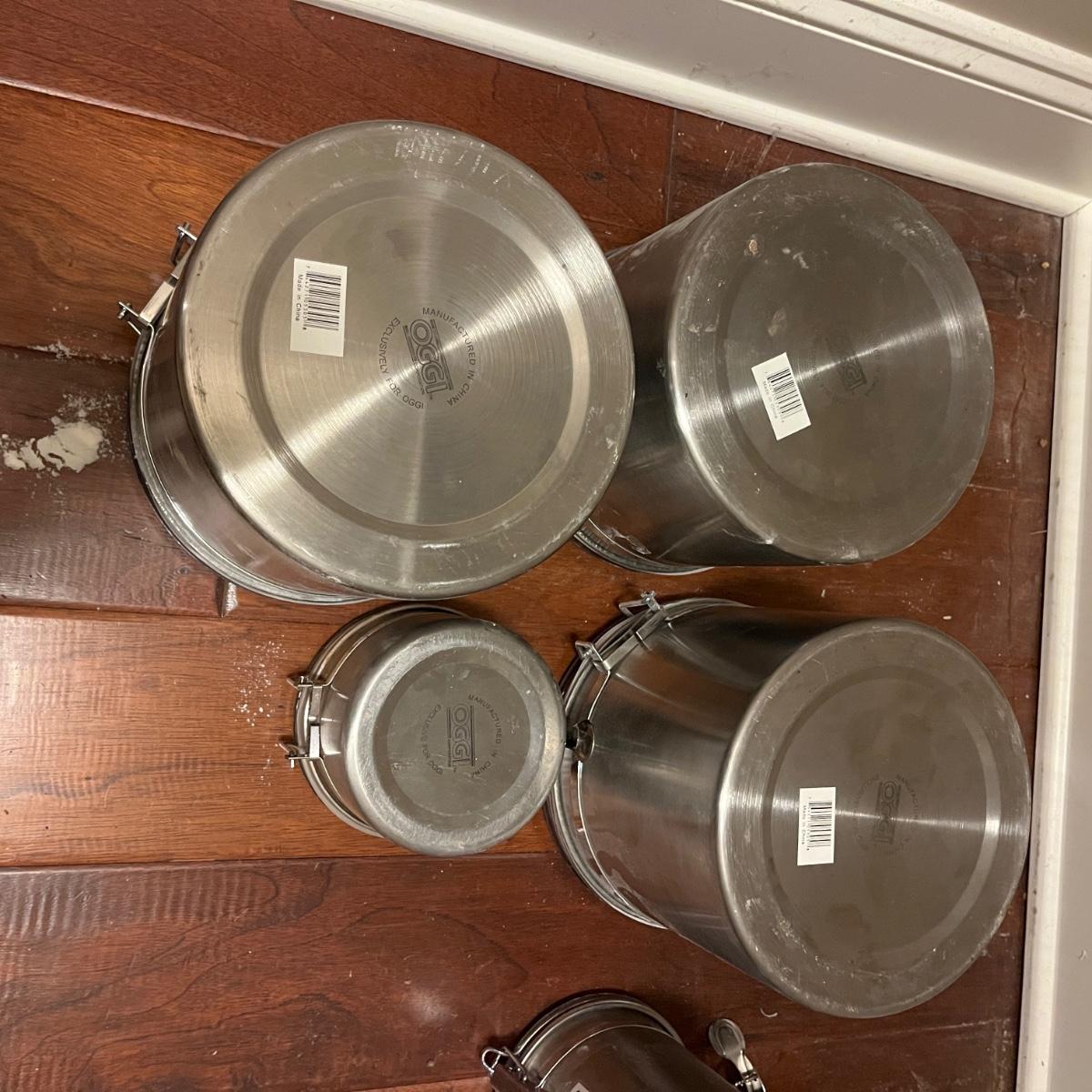 Lot includes five Oggi stainless steel canisters, Anchor, Enloy and unmarked stainless steel canisters, two glass canisters and two plastic Oggi canisters. Largest canister measures 7.5”D x 7.5”H.