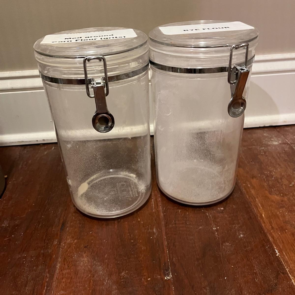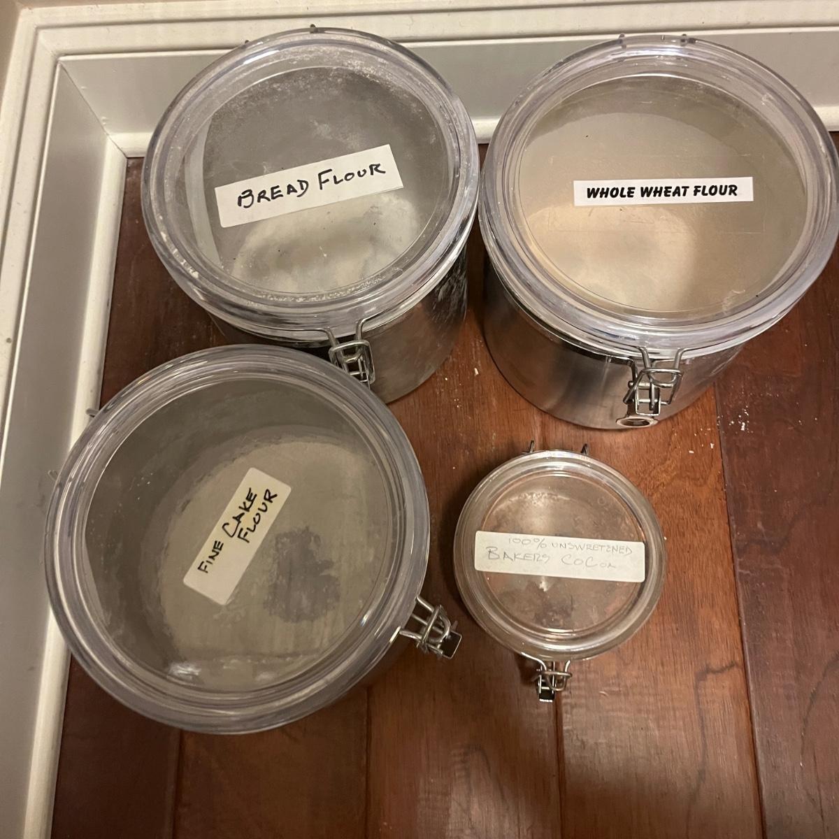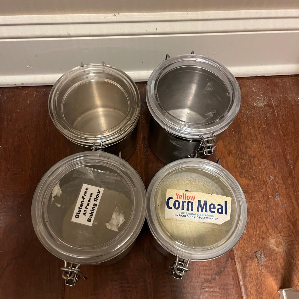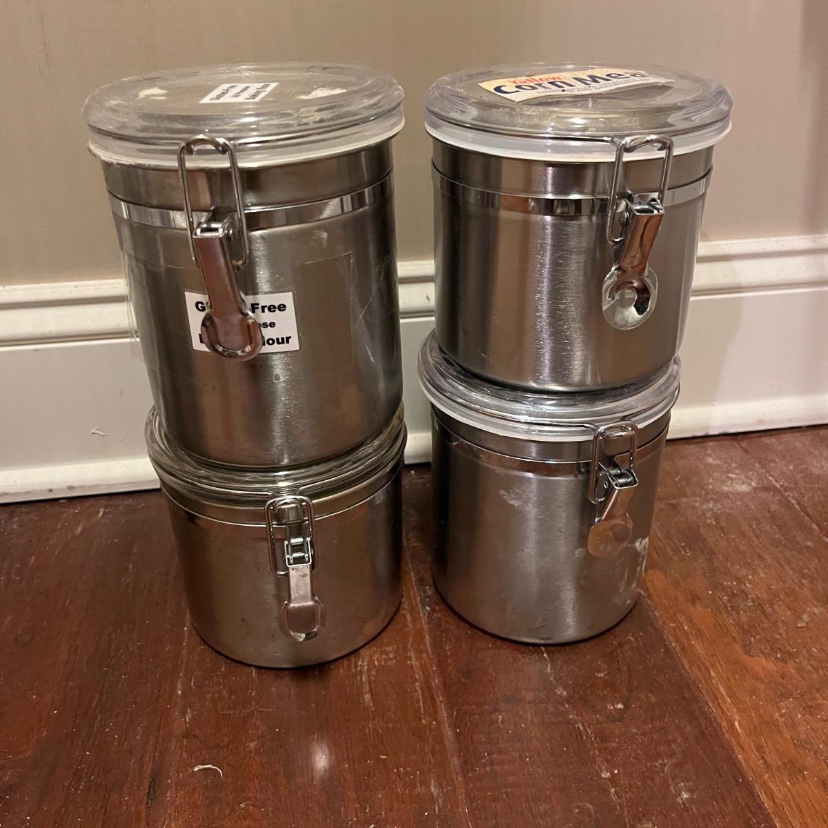 Lot includes five Oggi stainless steel canisters, Anchor, Enloy and unmarked stainless steel canisters, two glass canisters and two plastic Oggi canisters. Largest canister measures 7.5”D x 7.5”H.