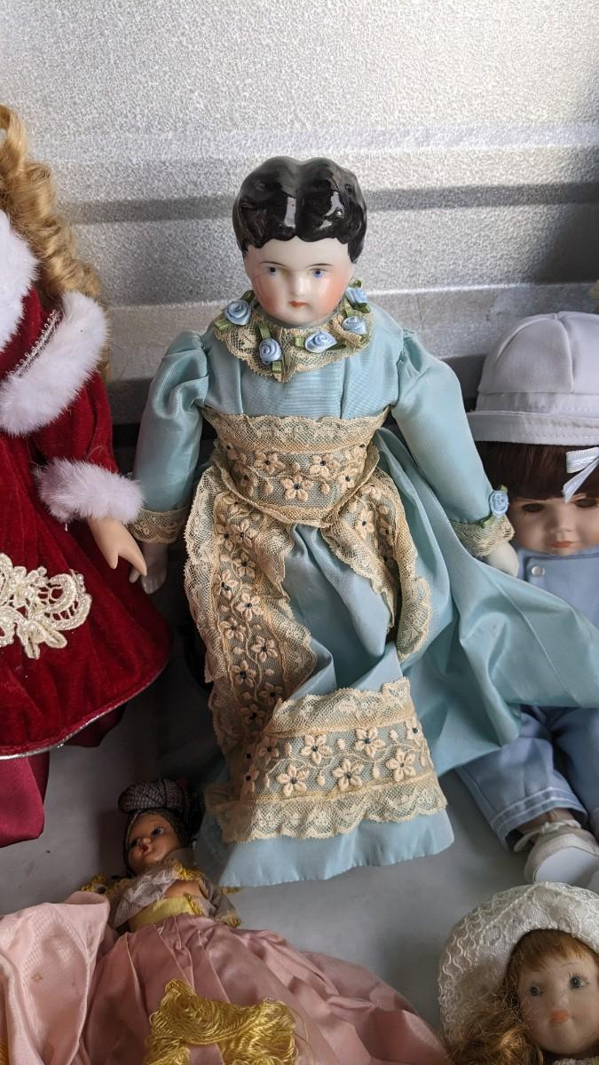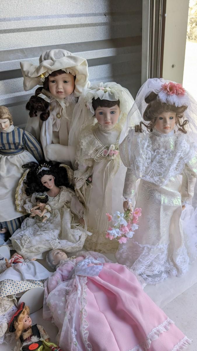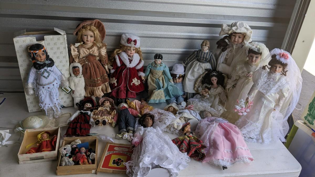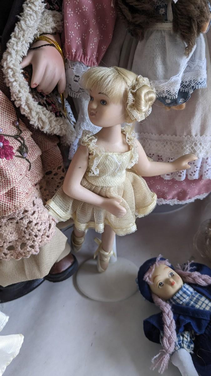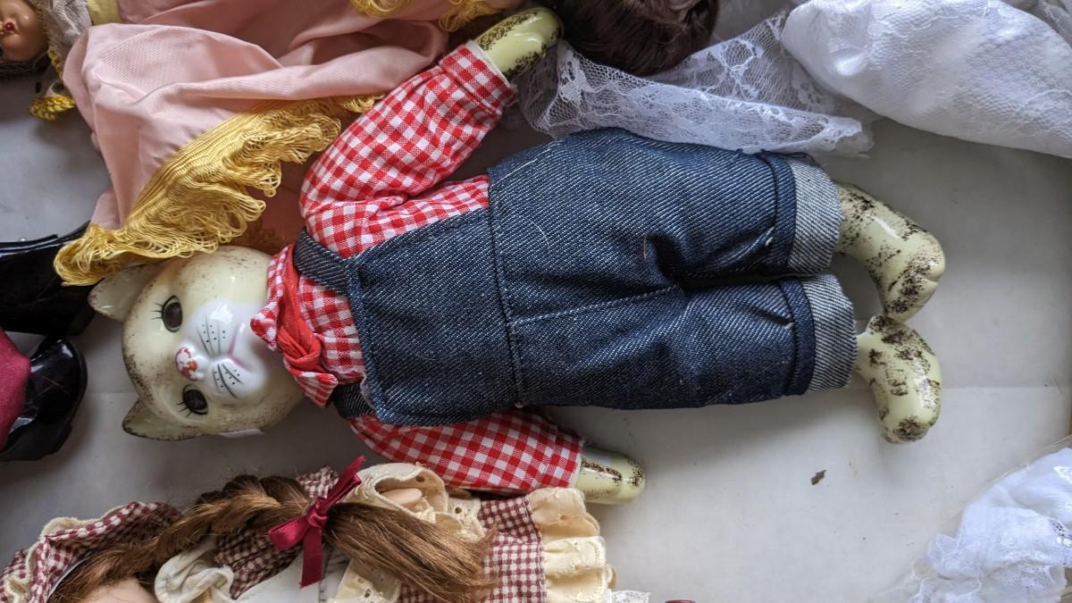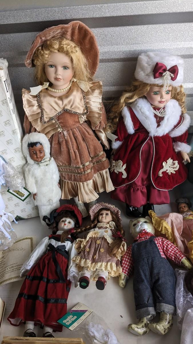 A great array of porcelain and plastic dolls. Some with tags and others without. Some ladies and the cat have wear, please note in photos. no shipping 2616