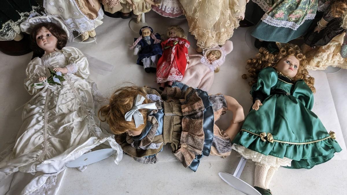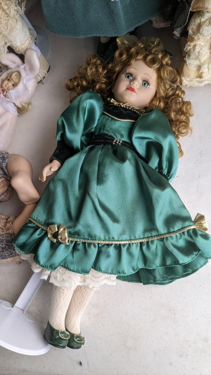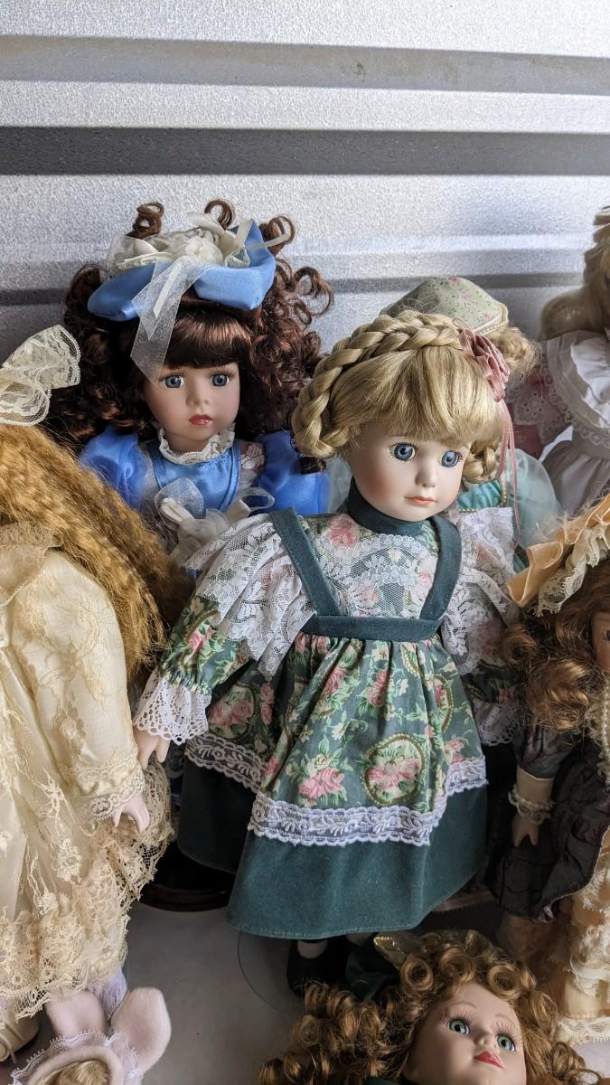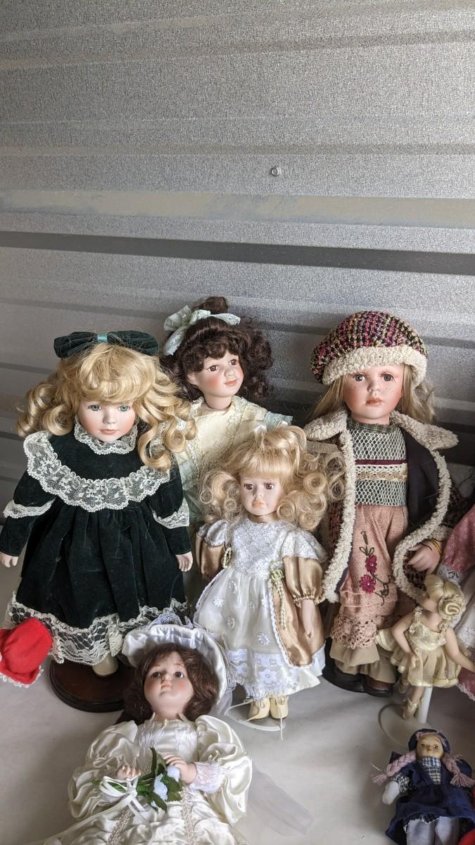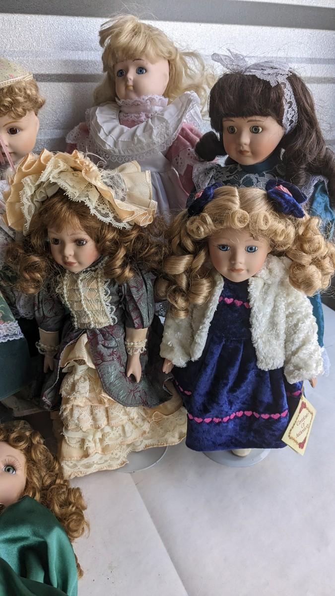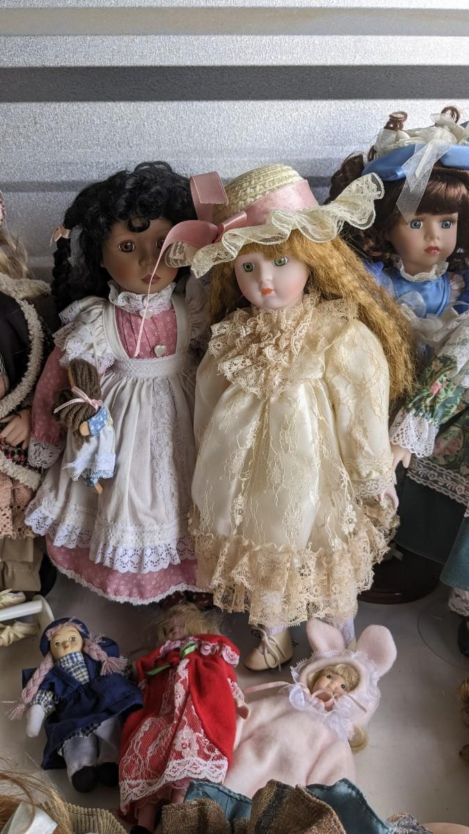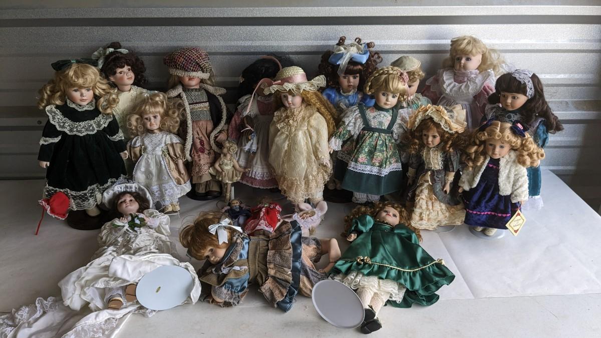 A great array of porcelain and plastic dolls. Some with tags and others without. Some ladies and the cat have wear, please note in photos. no shipping 2616