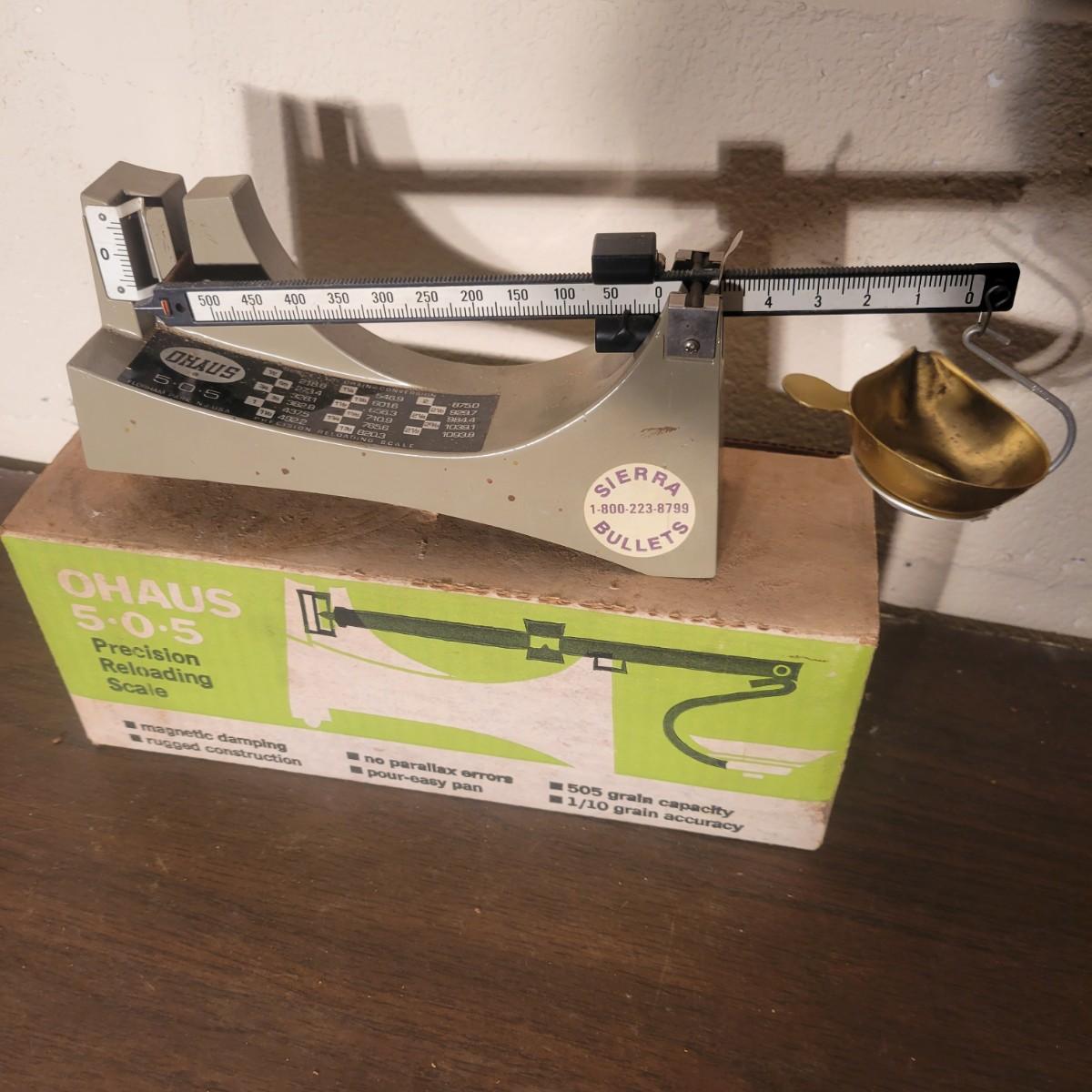 An Ohaus reloading scale in its original box. All parts appear to be present. Scale has a 1/10 grain accuracy and a 505 grain capacity. Shipping available.