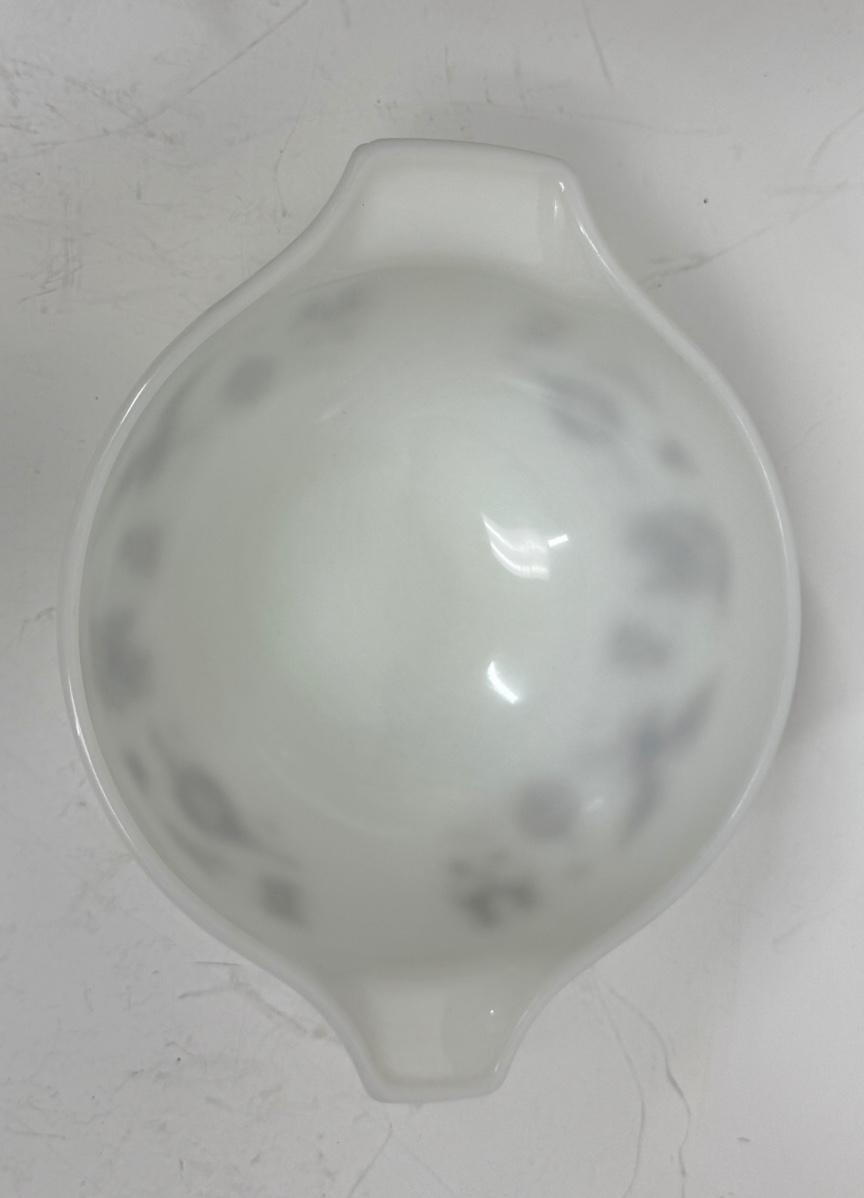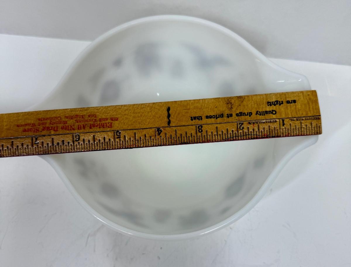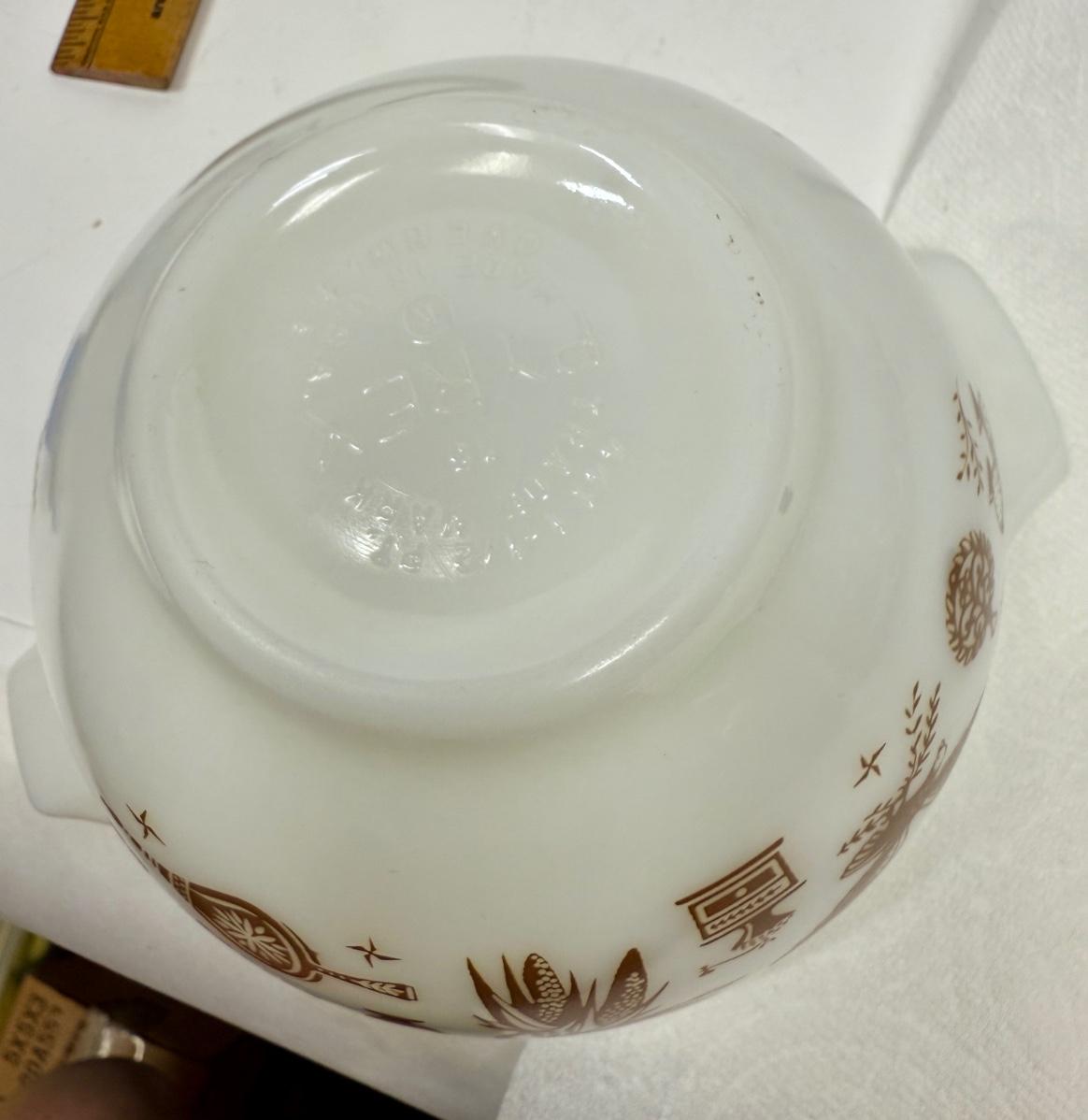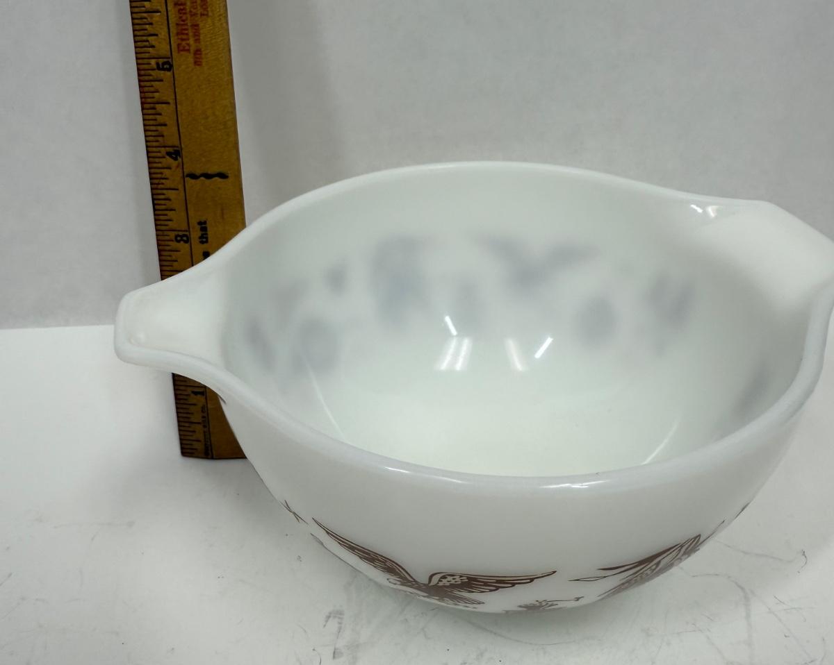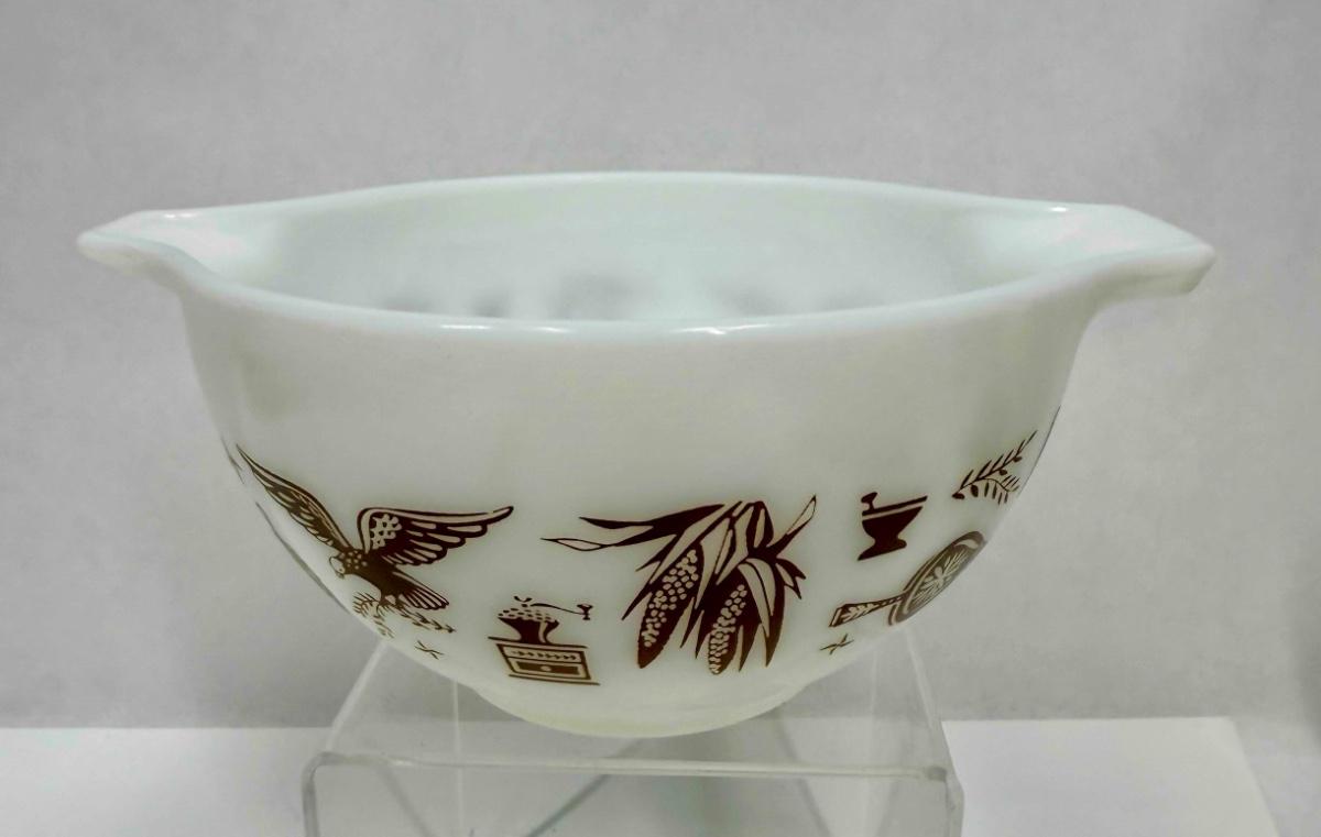 White pyrex mixing bowl with brown Early American images. Great condition.