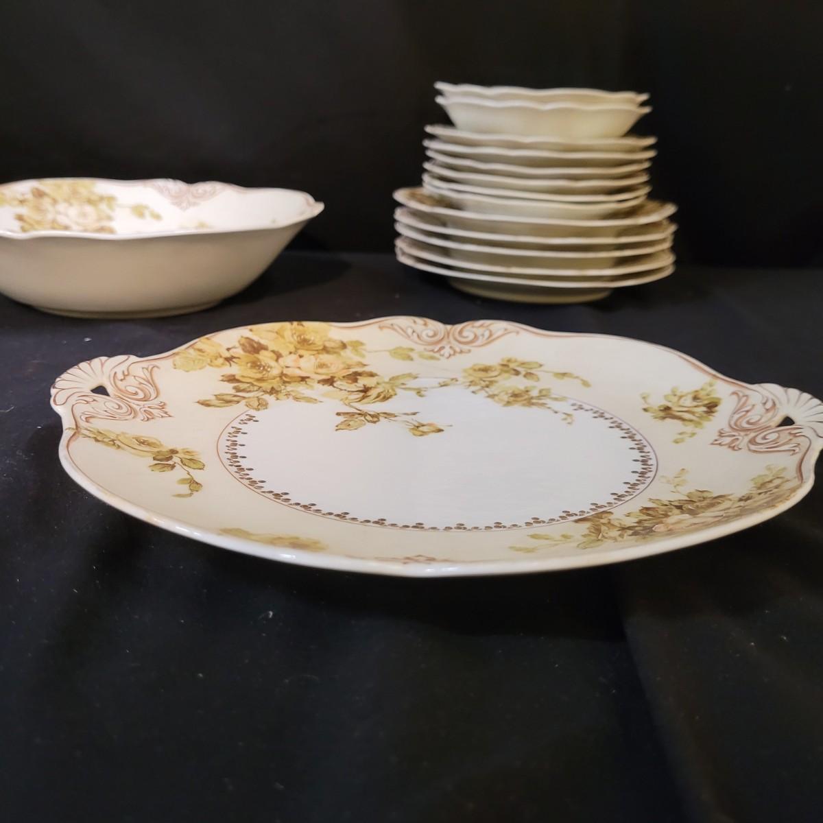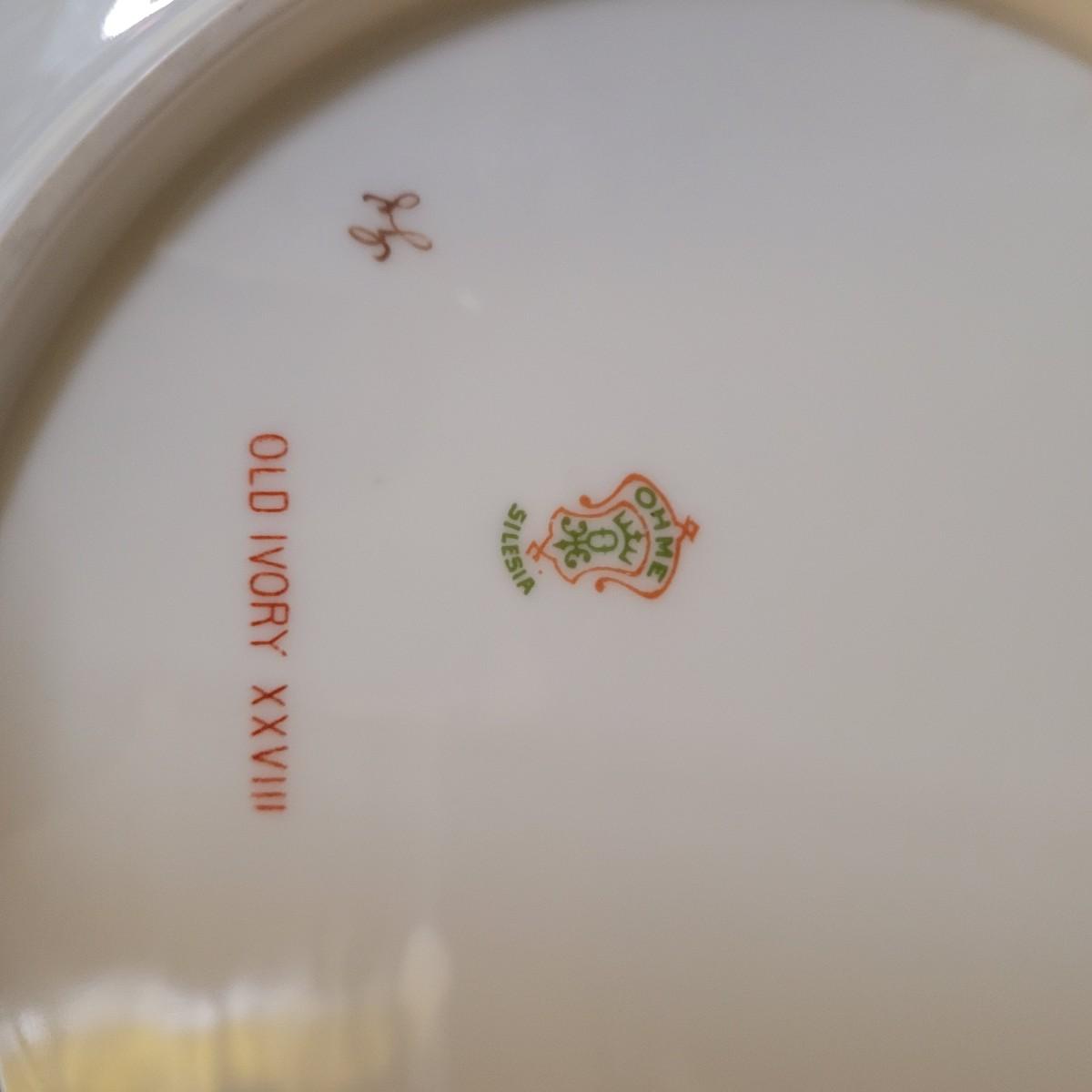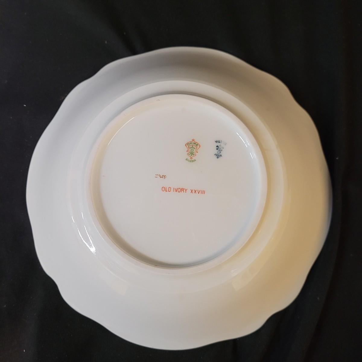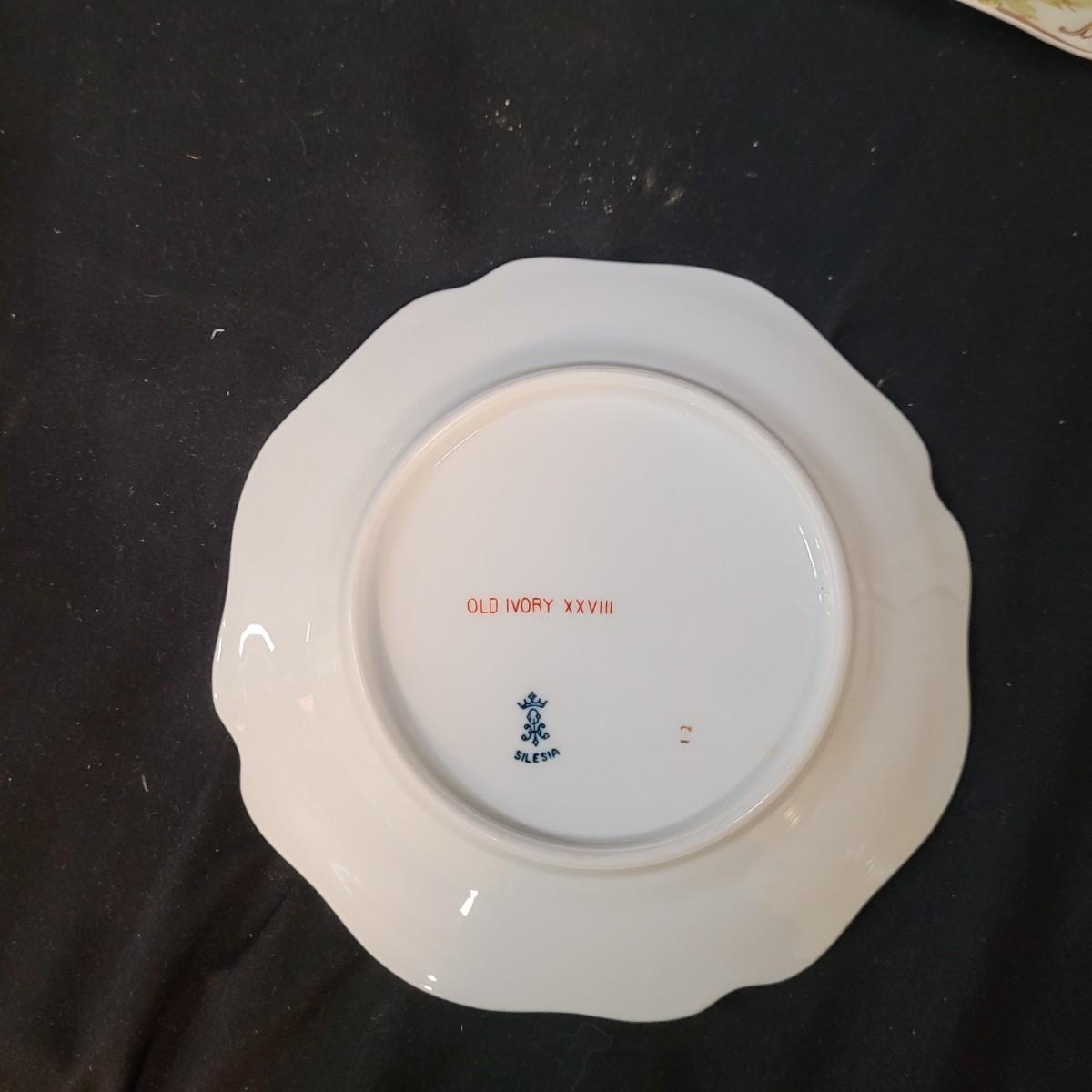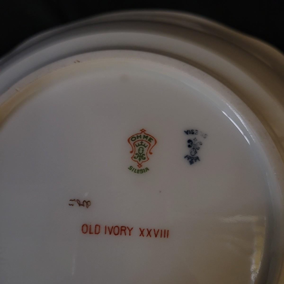 Fifteen piece Ohme Silesia porcelain dinner ware set includes large serving bowl, serving plate, five medium plates, six small plates and two small bowls. Floral print has fine paint strokes overlaid, and textured relief work at edges. Items in excellent condition. Large bowl measures approximately 9.5"DIA, medium plate 8"DIA. Shipping available.