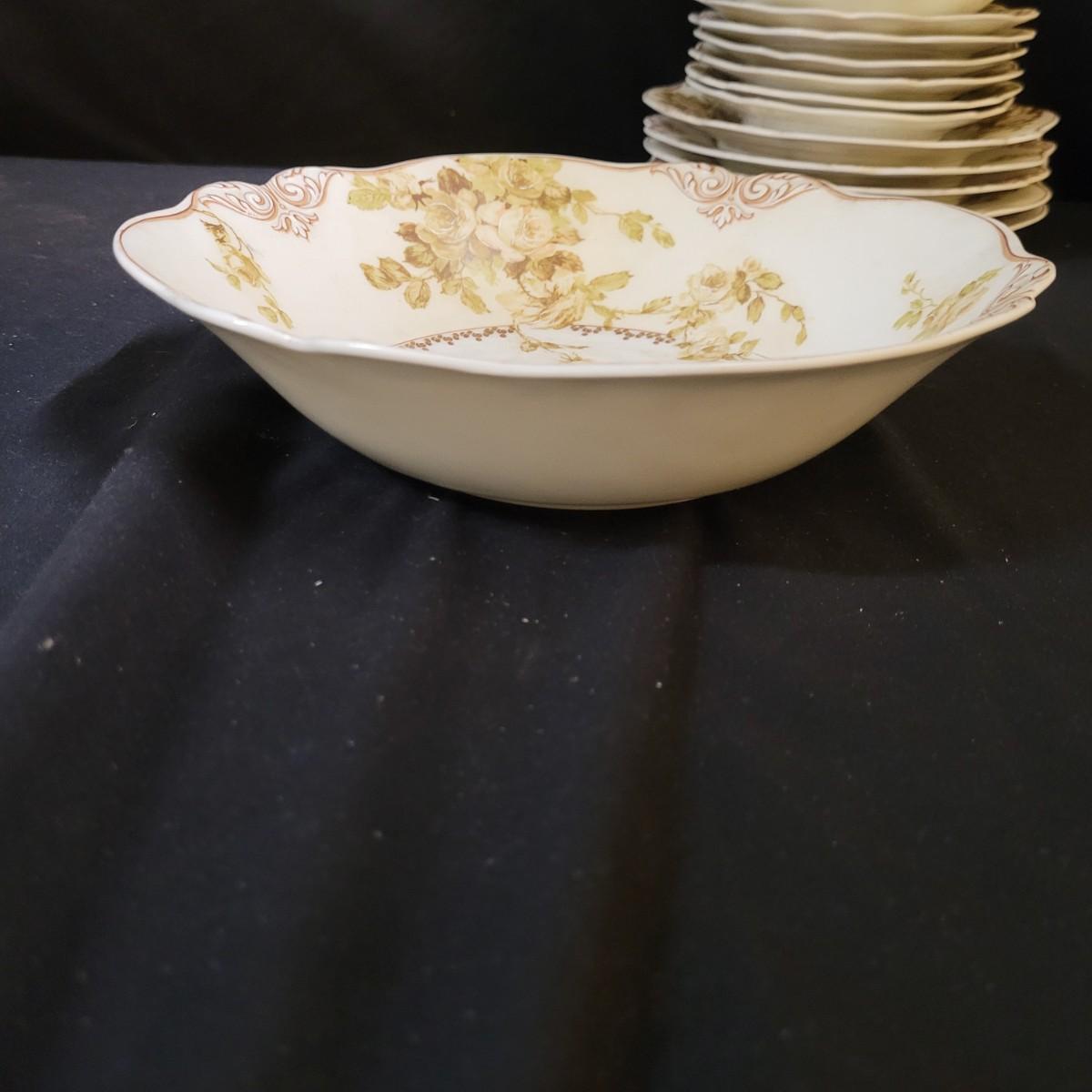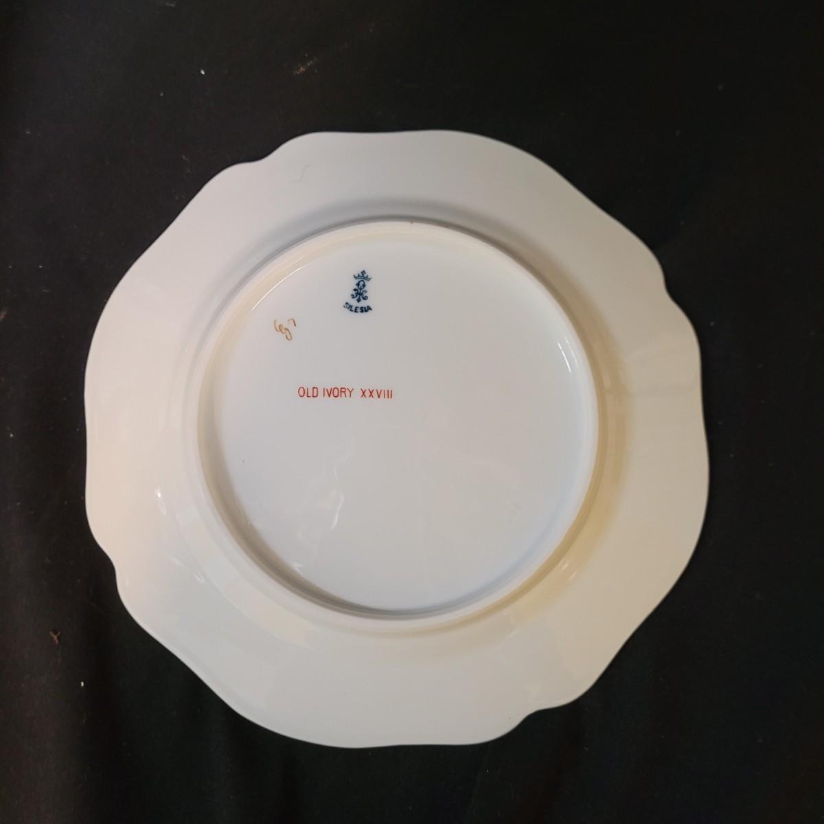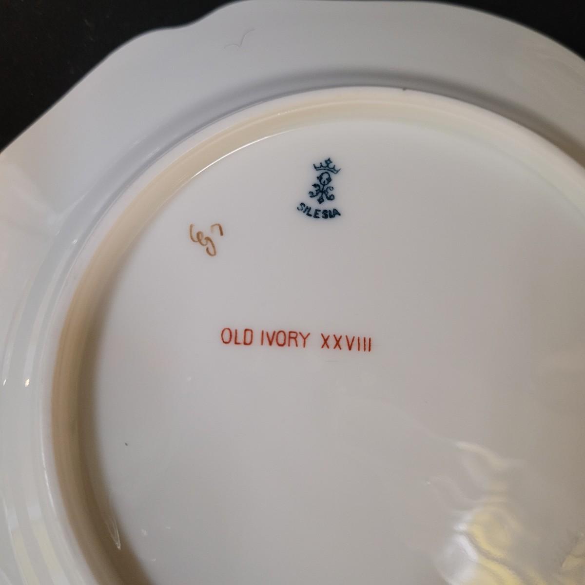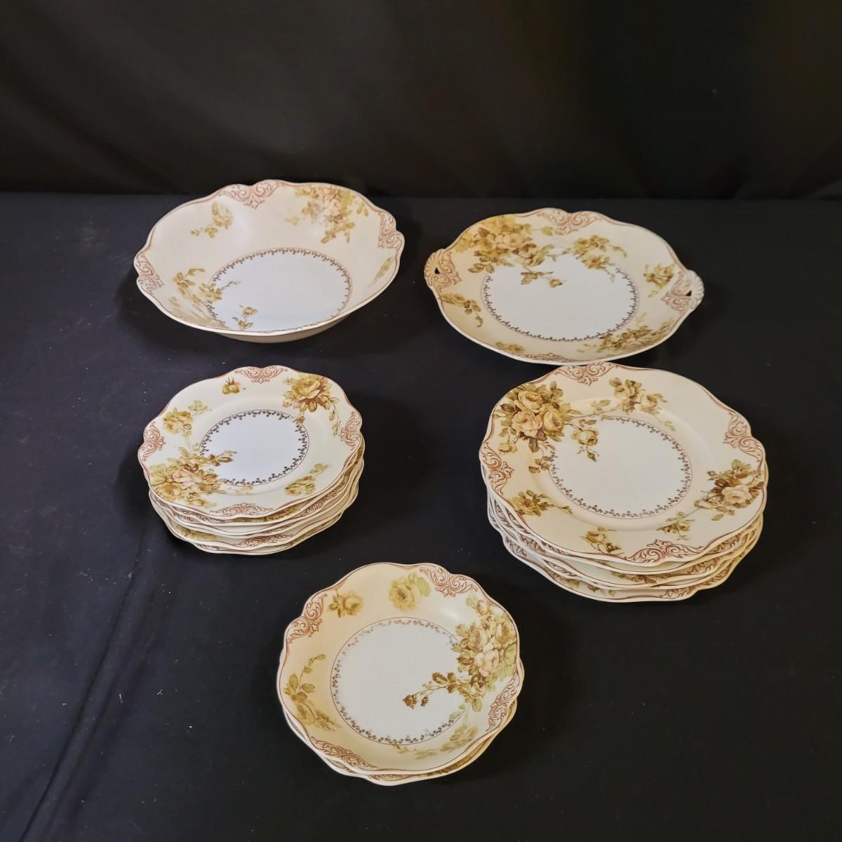 Fifteen piece Ohme Silesia porcelain dinner ware set includes large serving bowl, serving plate, five medium plates, six small plates and two small bowls. Floral print has fine paint strokes overlaid, and textured relief work at edges. Items in excellent condition. Large bowl measures approximately 9.5"DIA, medium plate 8"DIA. Shipping available.