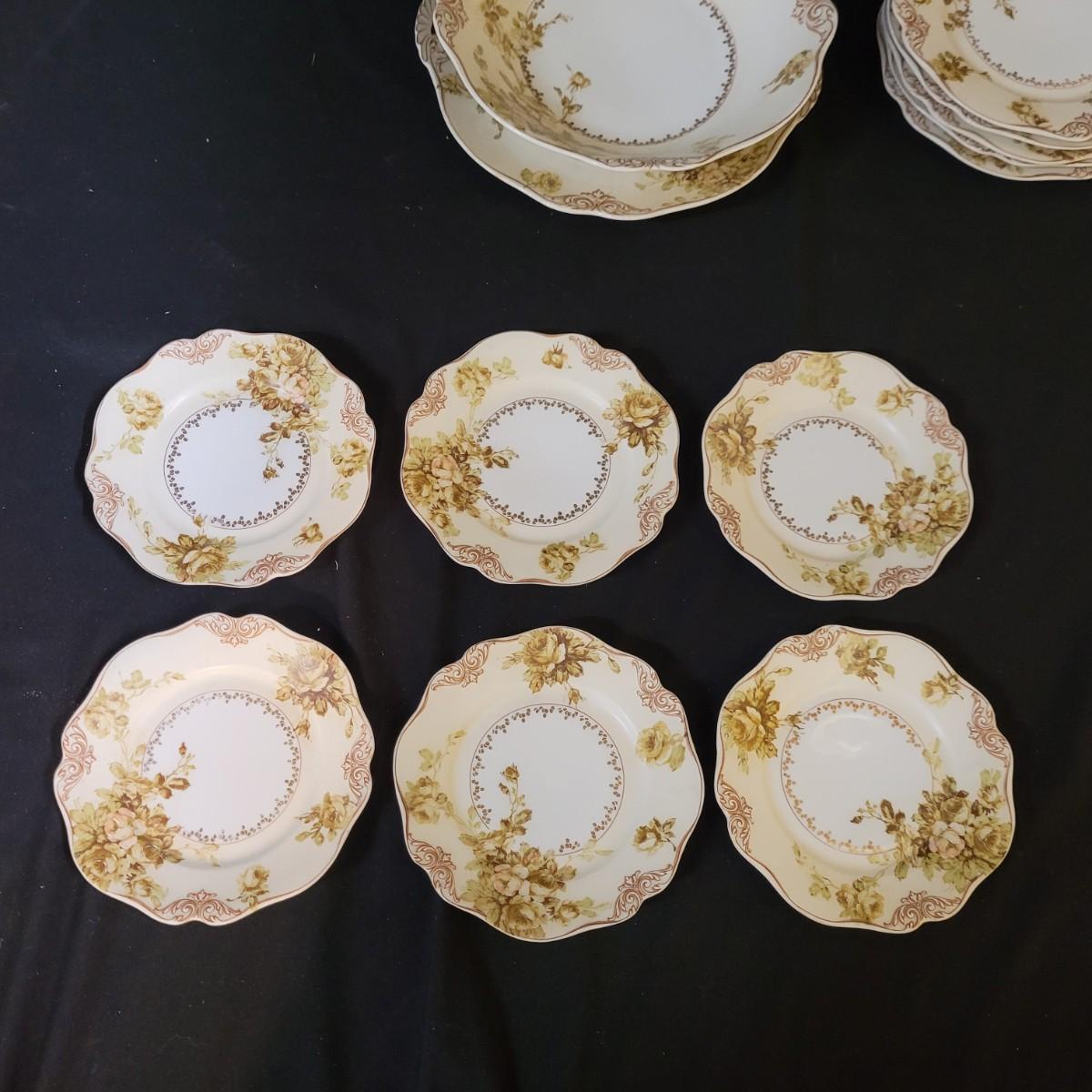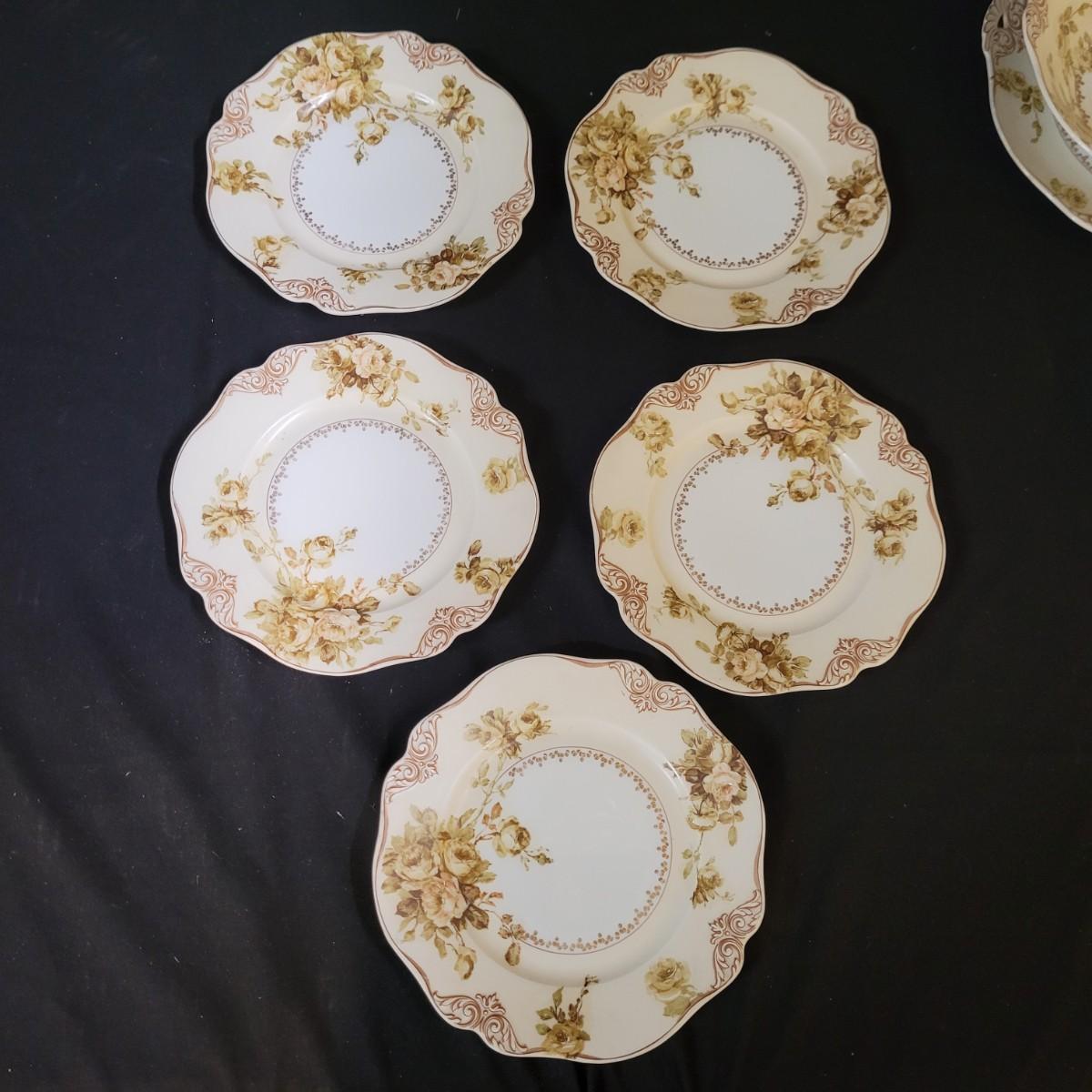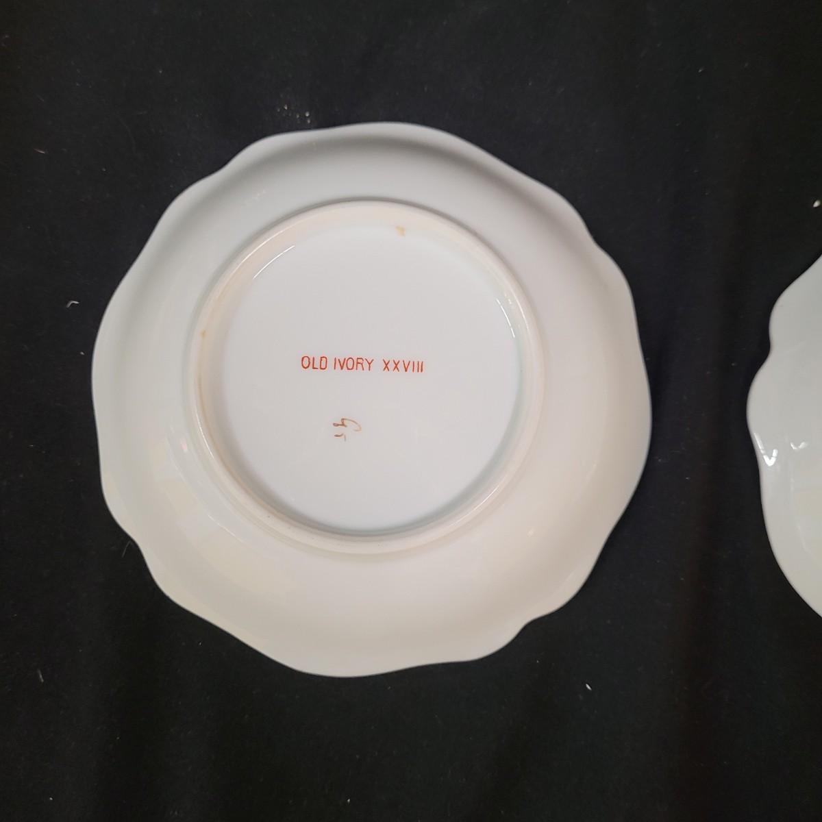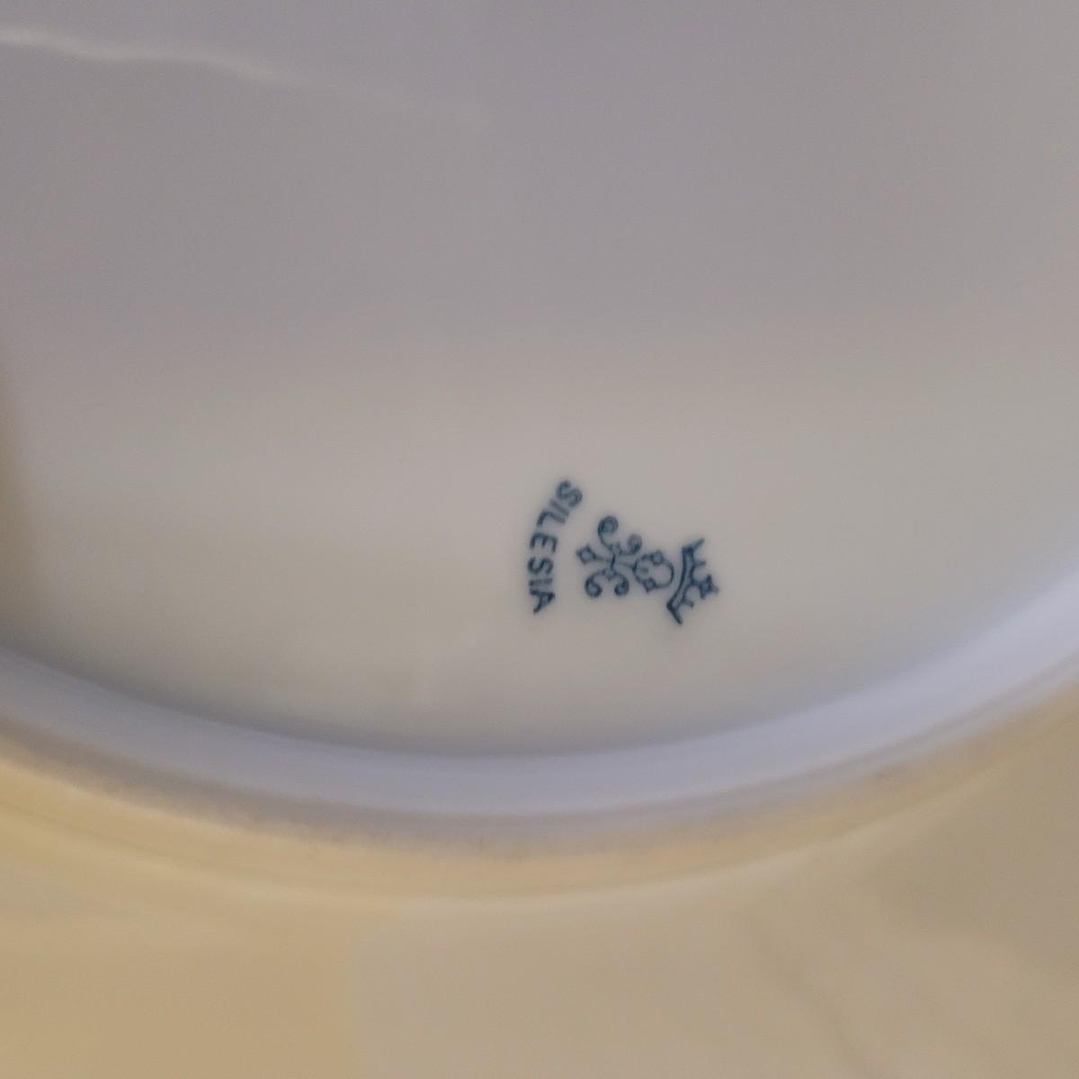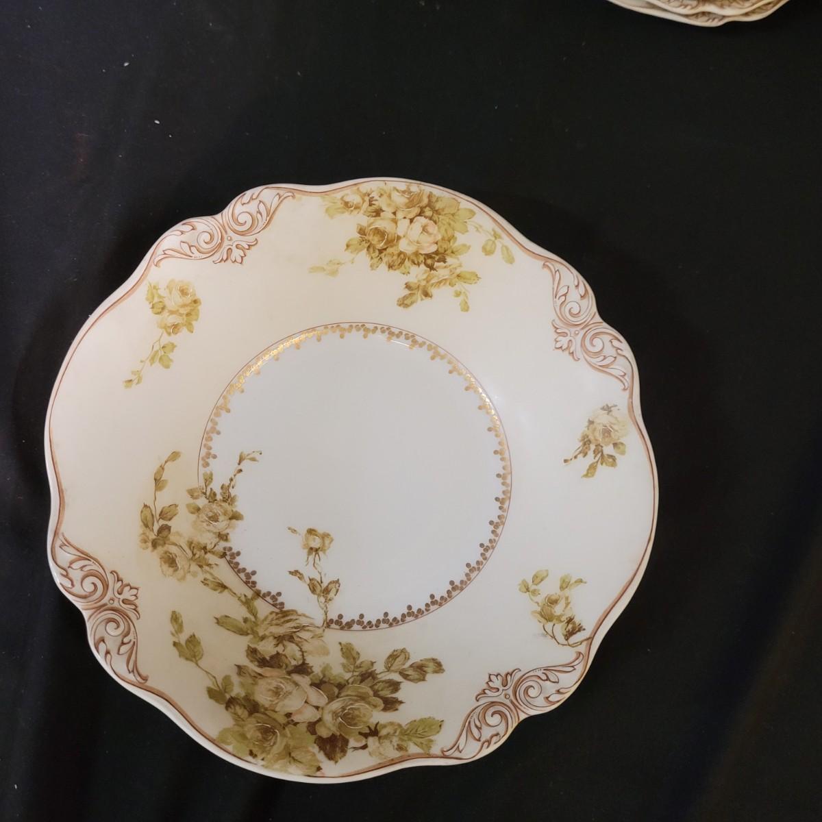 Fifteen piece Ohme Silesia porcelain dinner ware set includes large serving bowl, serving plate, five medium plates, six small plates and two small bowls. Floral print has fine paint strokes overlaid, and textured relief work at edges. Items in excellent condition. Large bowl measures approximately 9.5"DIA, medium plate 8"DIA. Shipping available.