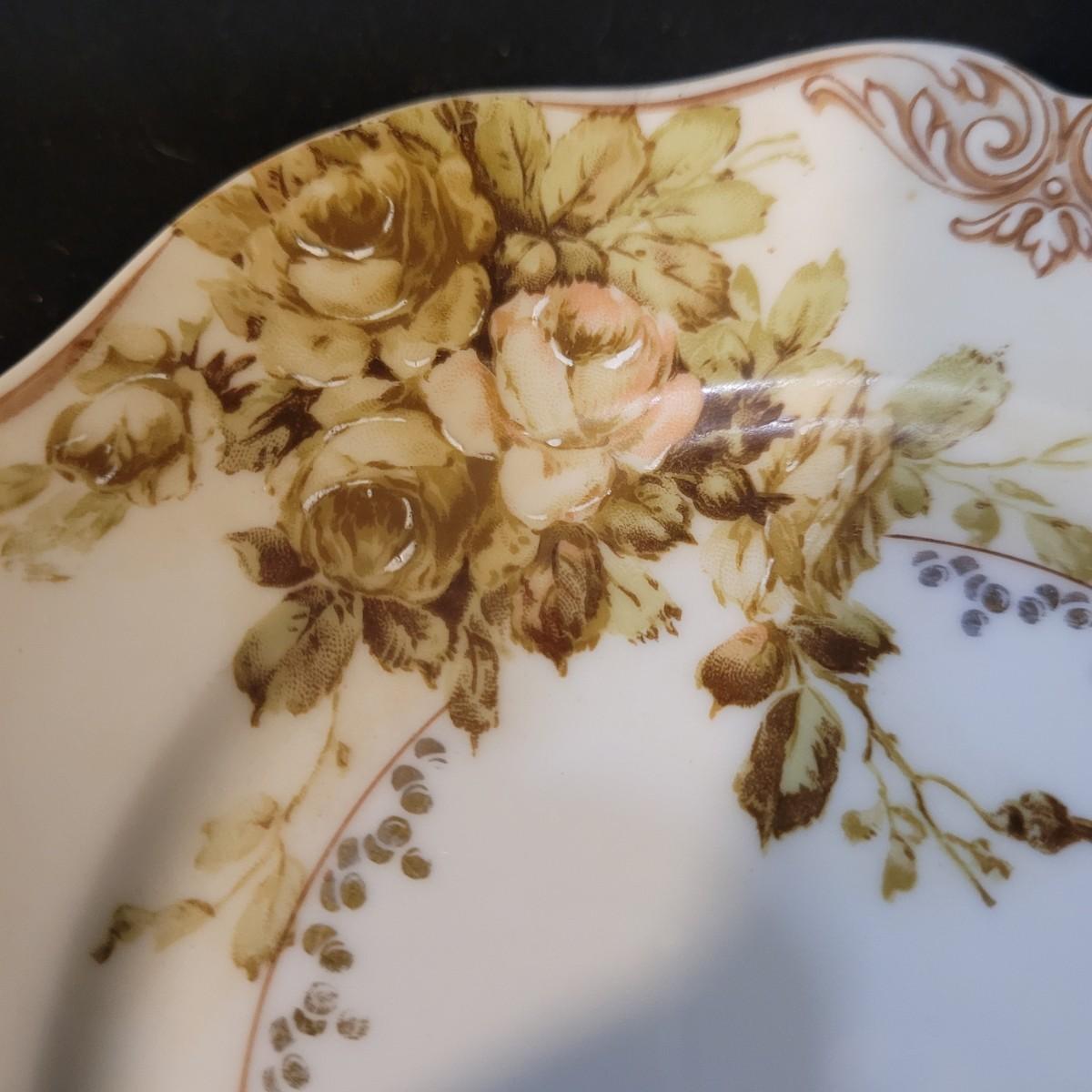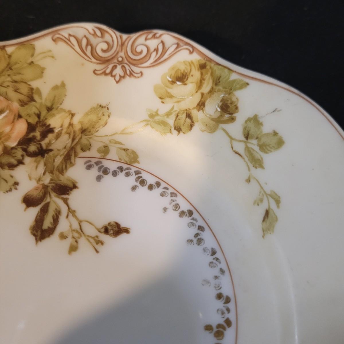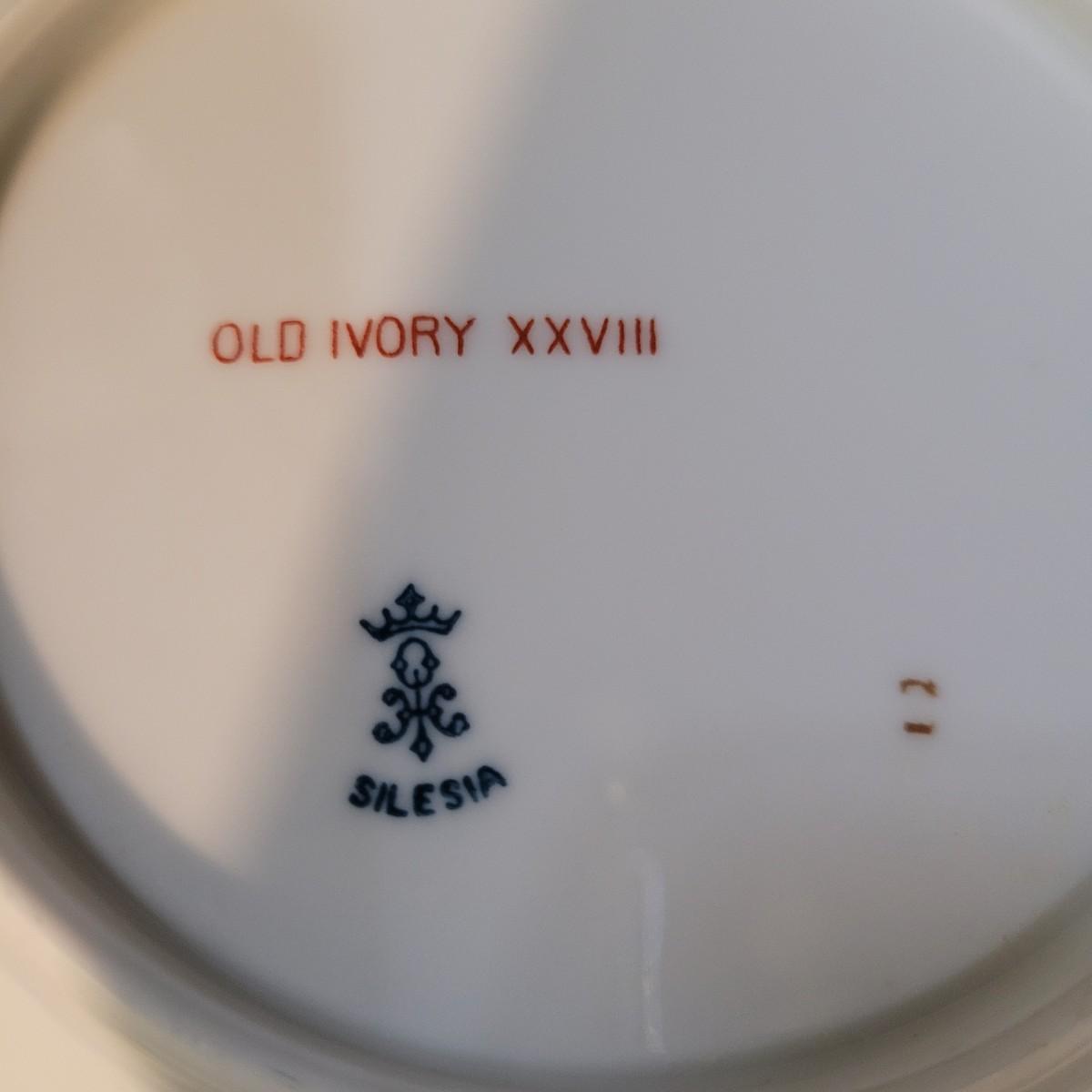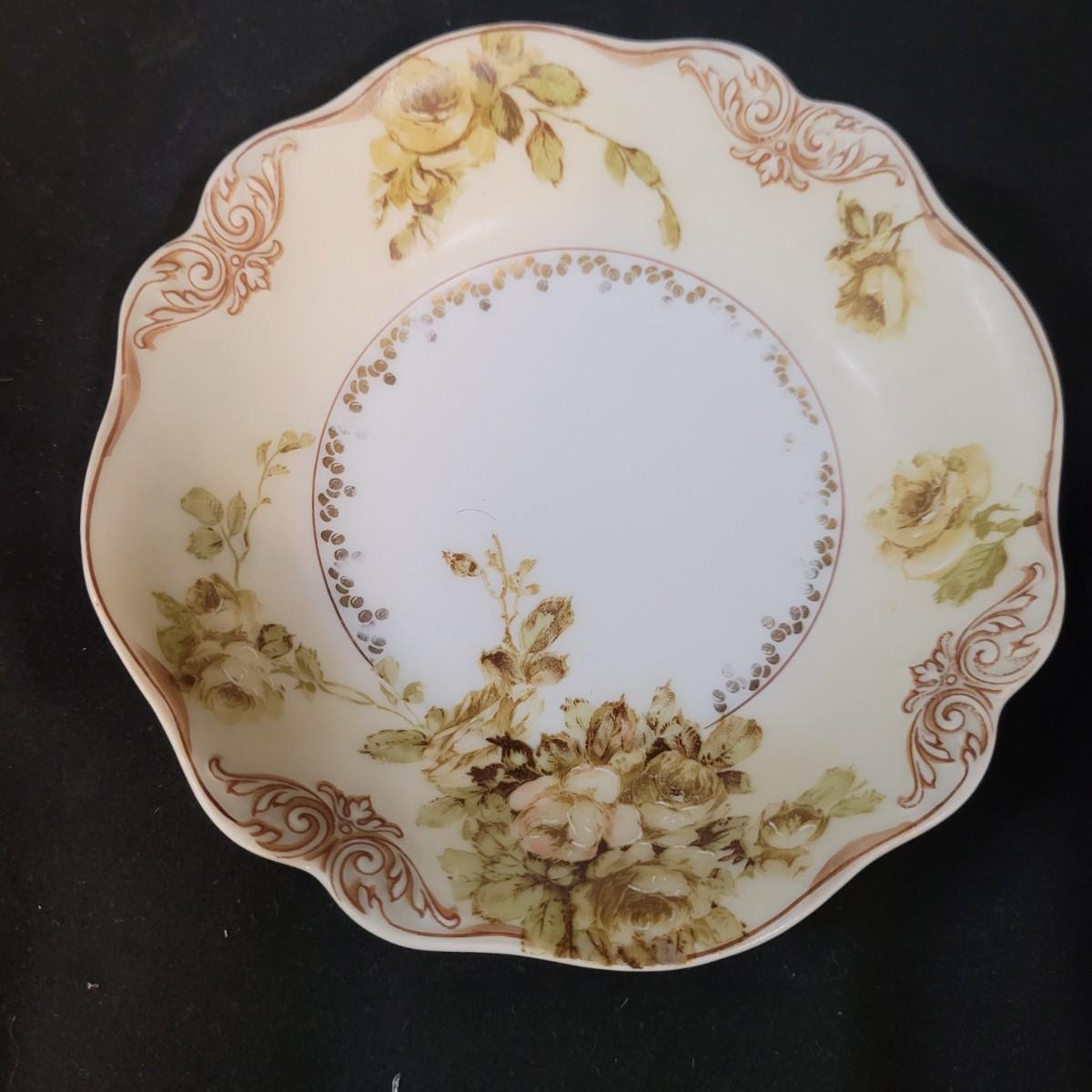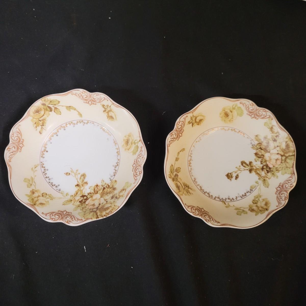 Fifteen piece Ohme Silesia porcelain dinner ware set includes large serving bowl, serving plate, five medium plates, six small plates and two small bowls. Floral print has fine paint strokes overlaid, and textured relief work at edges. Items in excellent condition. Large bowl measures approximately 9.5"DIA, medium plate 8"DIA. Shipping available.