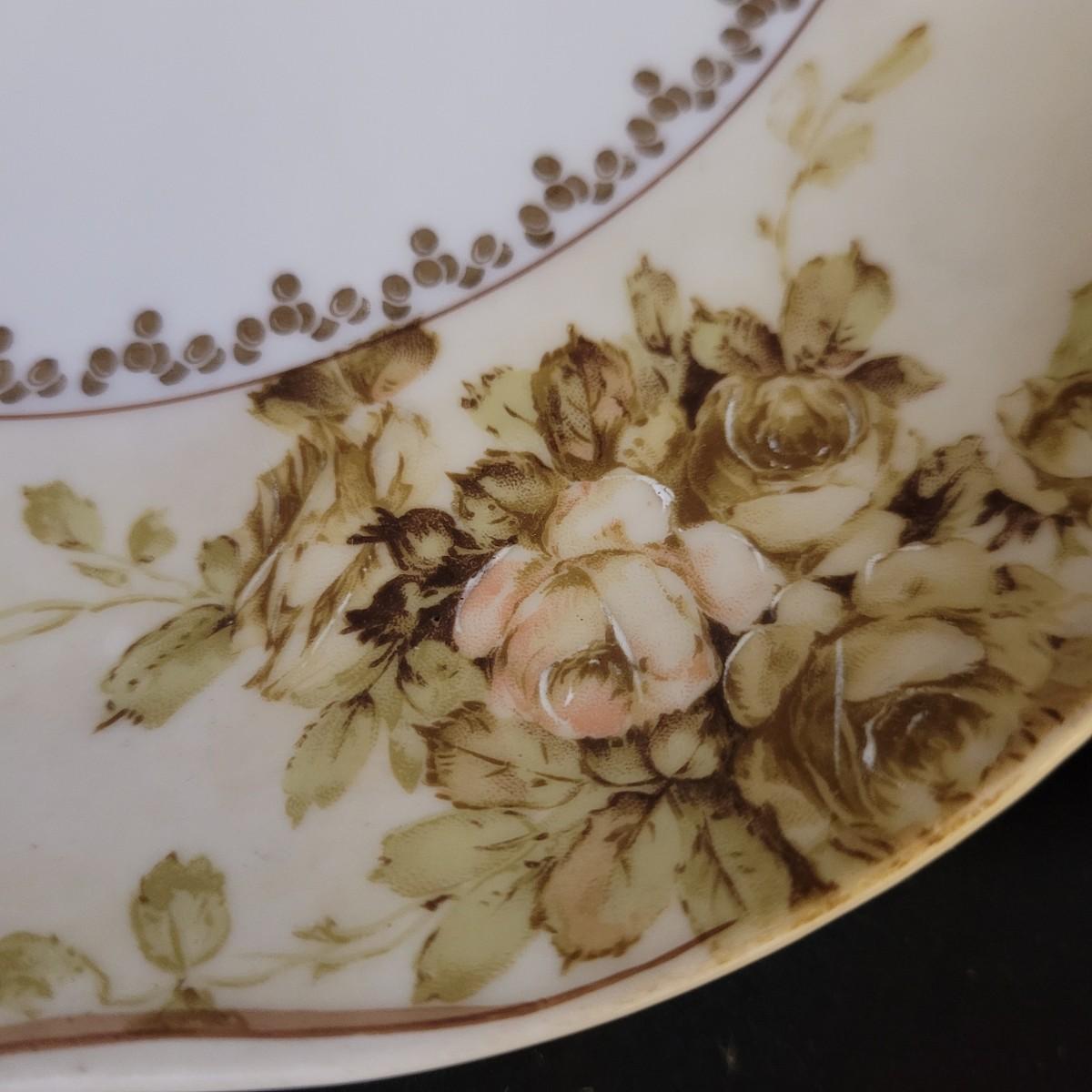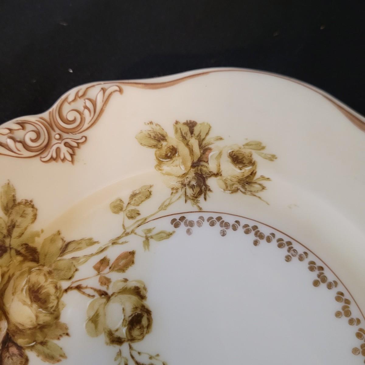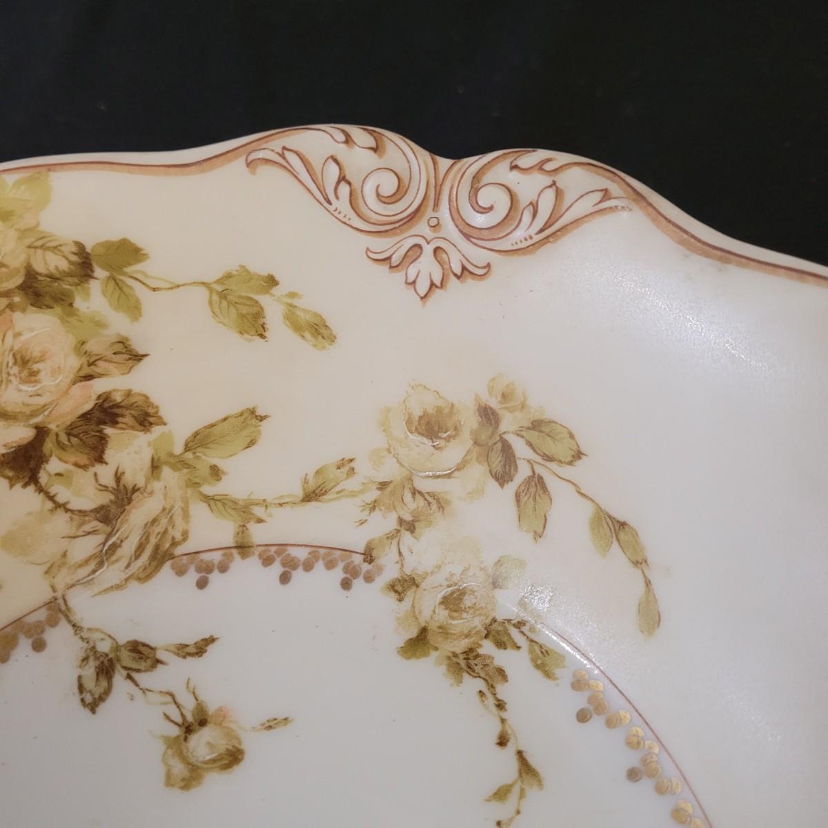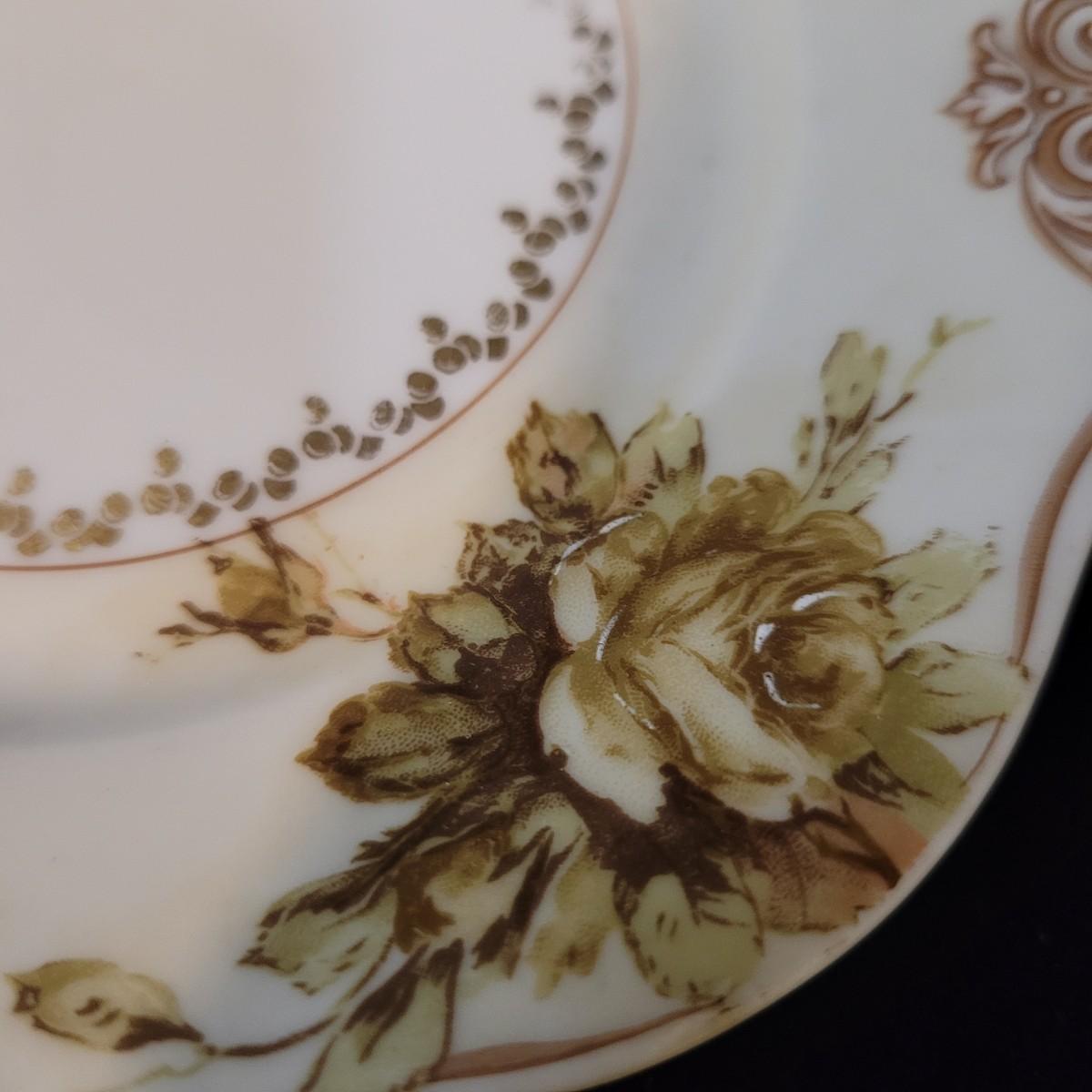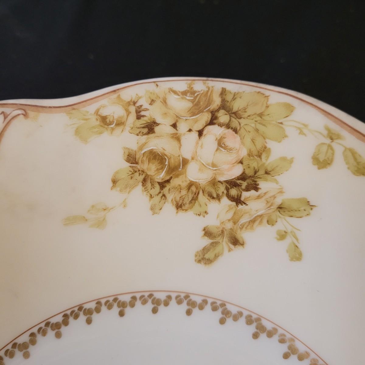 Fifteen piece Ohme Silesia porcelain dinner ware set includes large serving bowl, serving plate, five medium plates, six small plates and two small bowls. Floral print has fine paint strokes overlaid, and textured relief work at edges. Items in excellent condition. Large bowl measures approximately 9.5"DIA, medium plate 8"DIA. Shipping available.