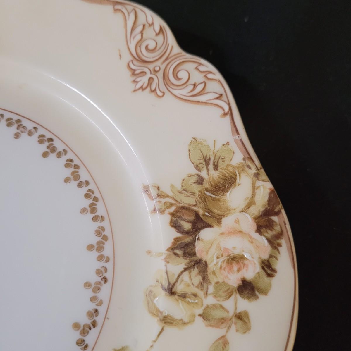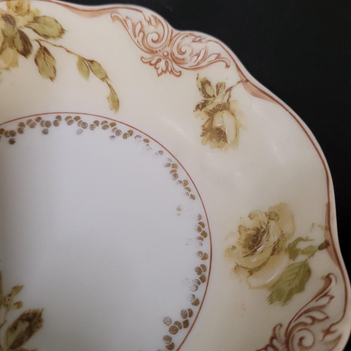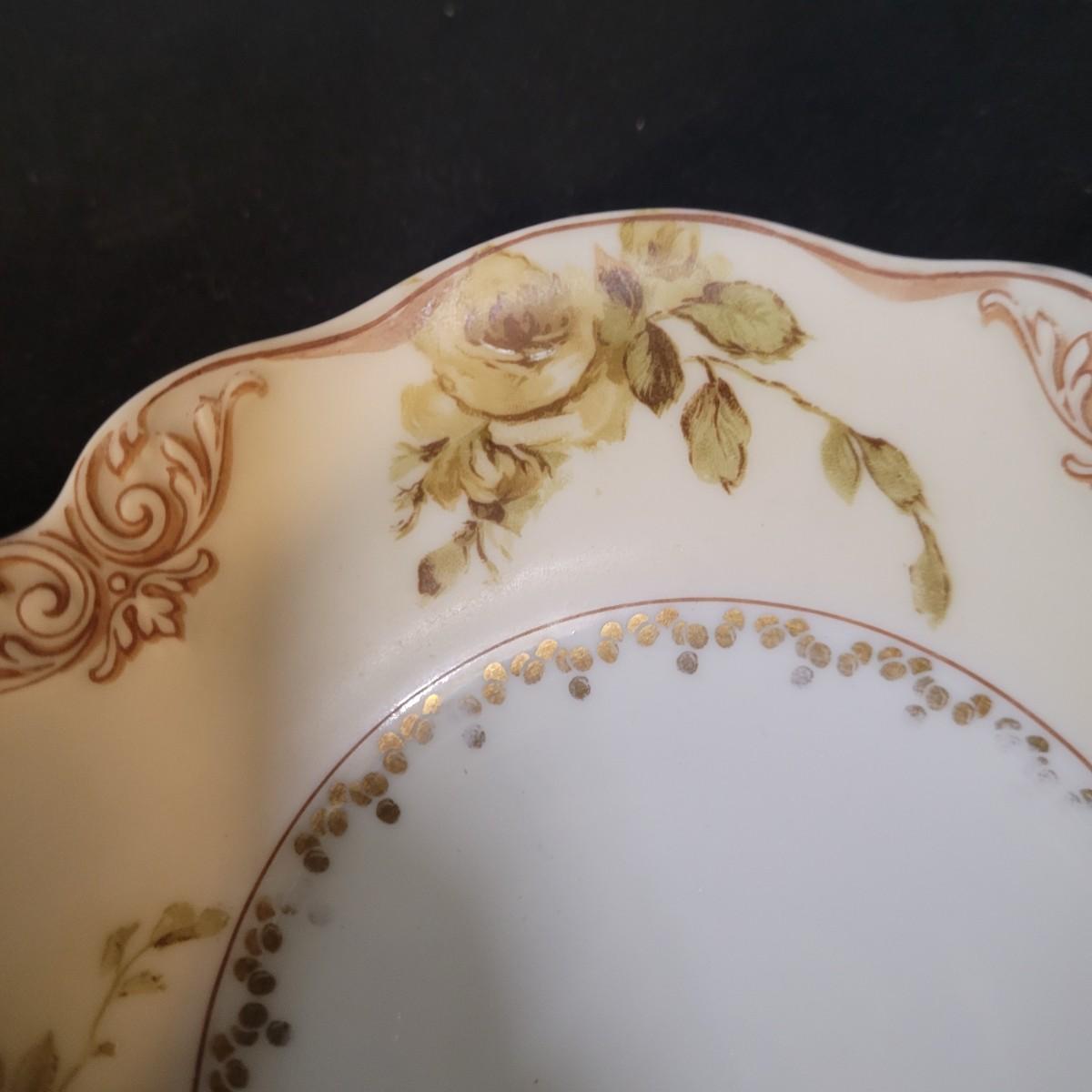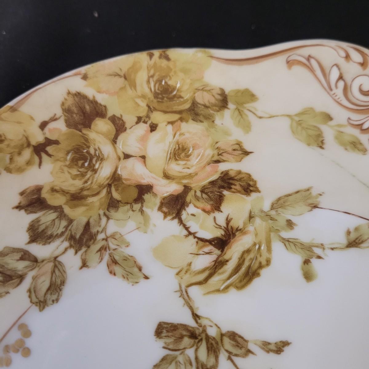Fifteen piece Ohme Silesia porcelain dinner ware set includes large serving bowl, serving plate, five medium plates, six small plates and two small bowls. Floral print has fine paint strokes overlaid, and textured relief work at edges. Items in excellent condition. Large bowl measures approximately 9.5"DIA, medium plate 8"DIA. Shipping available.