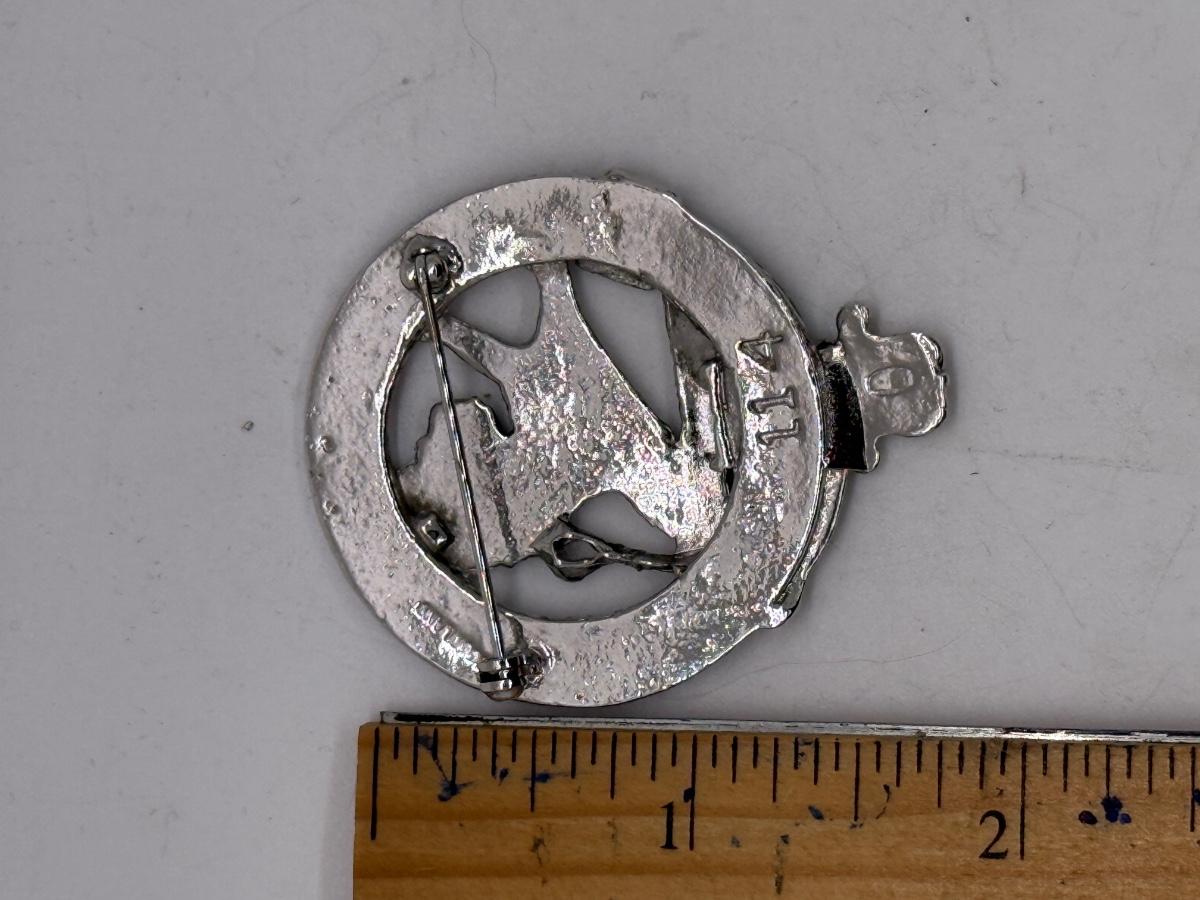 Silvertone round metal cap Badge Pin. Approx. 1 5/8" across. Good condition.