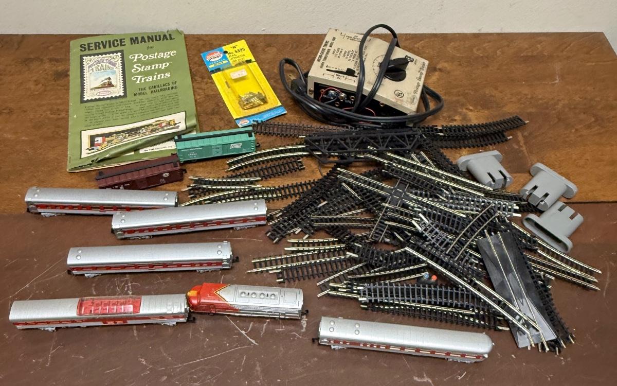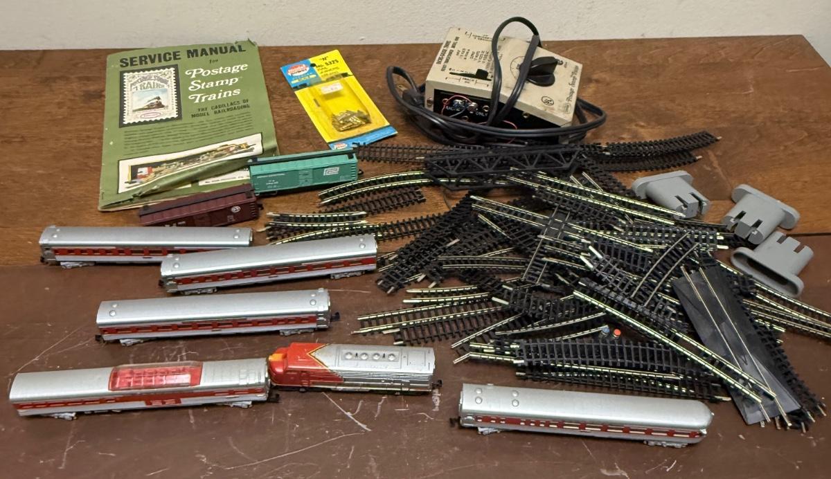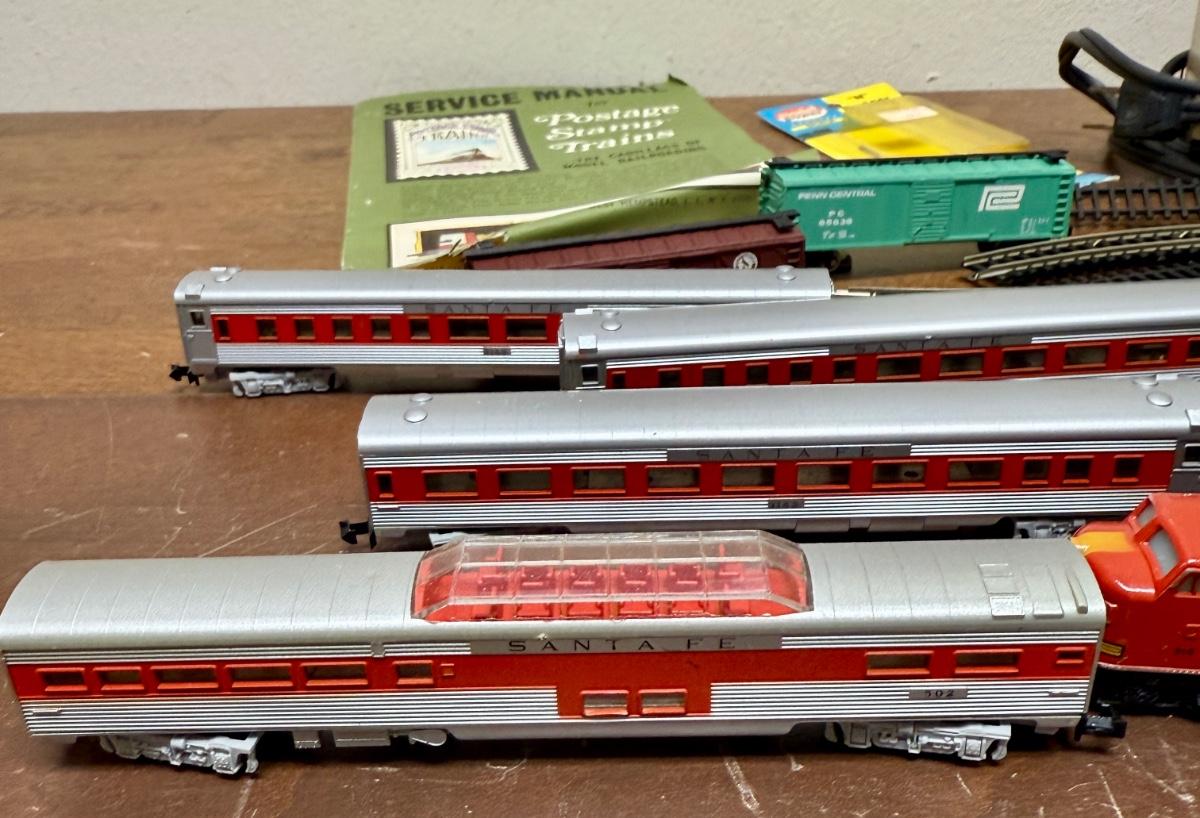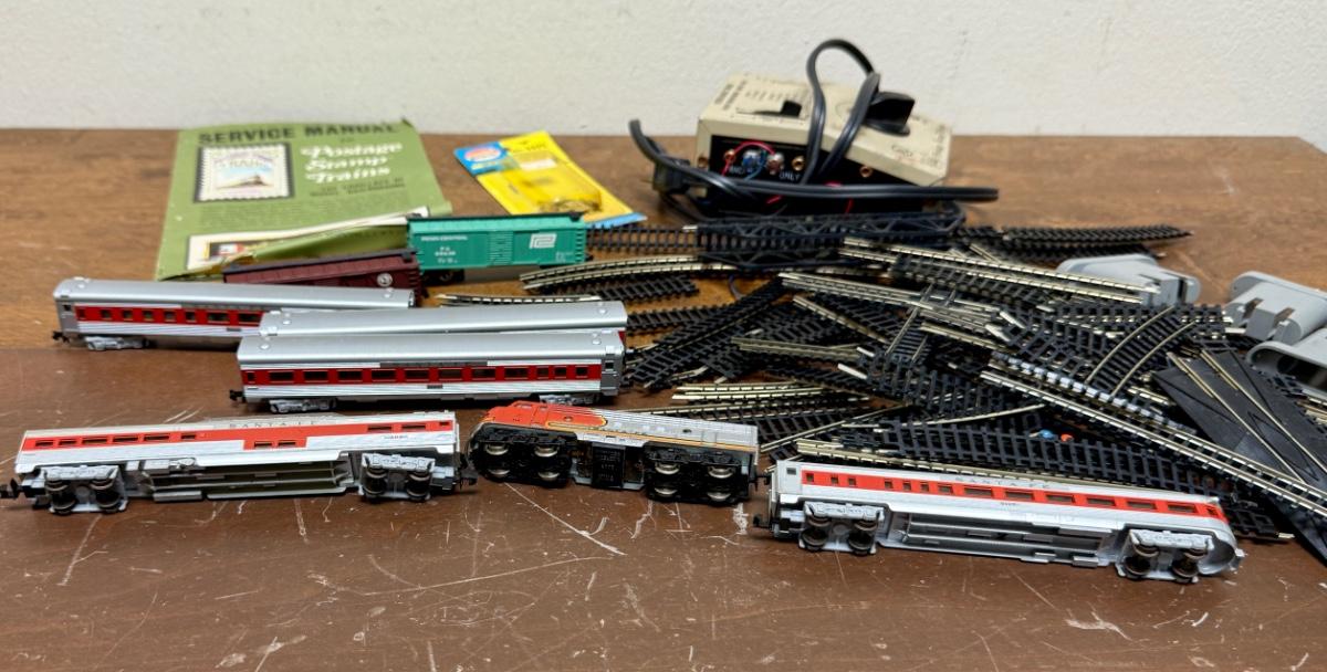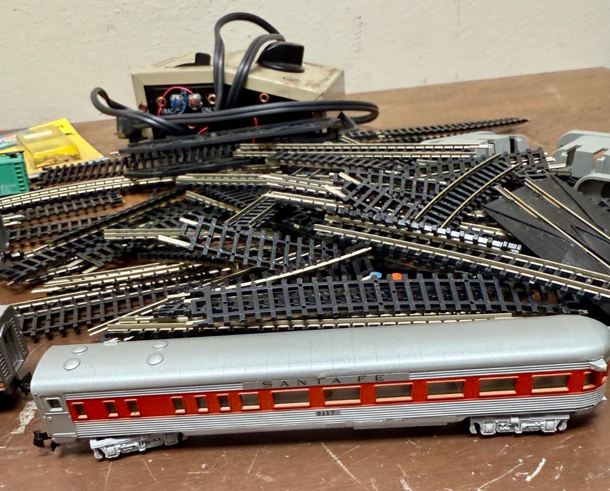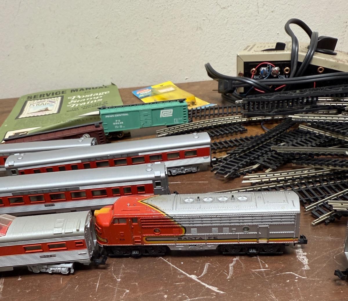 Looks to all be from 1968. Includes Aurora Transformer 4949, Sante Fe Passenger Train: 4" Engine 510, View-Liner Bubble-top car 502, (3) long passenger cars 3152, and a round-end passenger car 3117 (each passenger car is 5.5"), all look to be in good condition. All Santa Fe items marked "Western Germany". Transformer and Engine are untested. Also includes (2) boxcars: green Penn Central and brown Great Northern (slightly damaged, a wheel assembly is unfastened but can likely be re-attached). Service Manual, packet of rail joiners, and a total of 67 assorted pieces of track: 15 straight, 47 curved, 2 switches, and more. Transformer made in USA, track is a mix of Western Germany, Italy and USA.