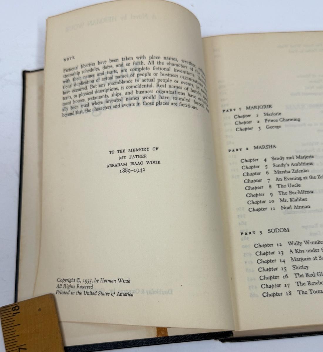 Hardcover, some spine damage and page yellowing. Herman Wouk also wrote The Caine Mutiny in 1951, winning a Pulitzer Prize and spawned the 1954 movie starring Humphrey Bogart. Marjorie Morningstar is a love story. It presents one of the greatest characters in modern fiction: Marjorie, the pretty seventeen-year-old who left the respectability of New York's Central Park West to join the theater, live in the teeming streets of Greenwich Village, and seek love in the arms of a brilliant, enigmatic writer.