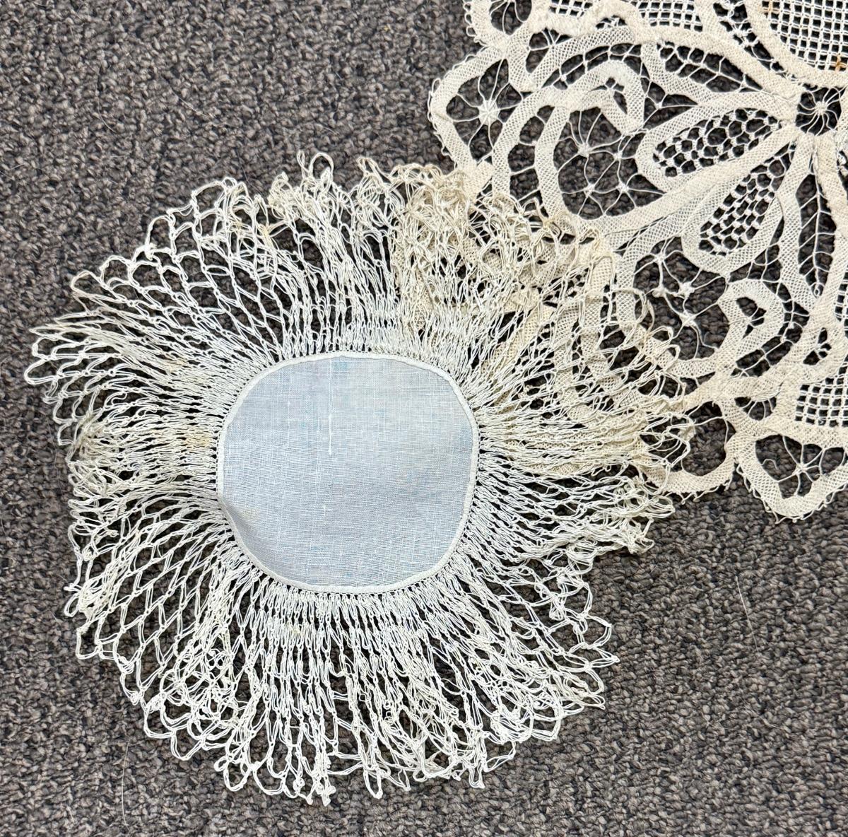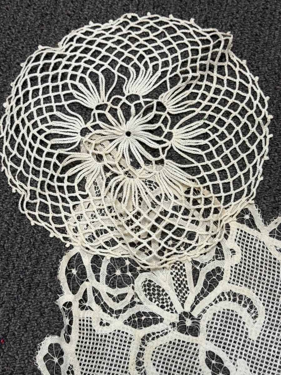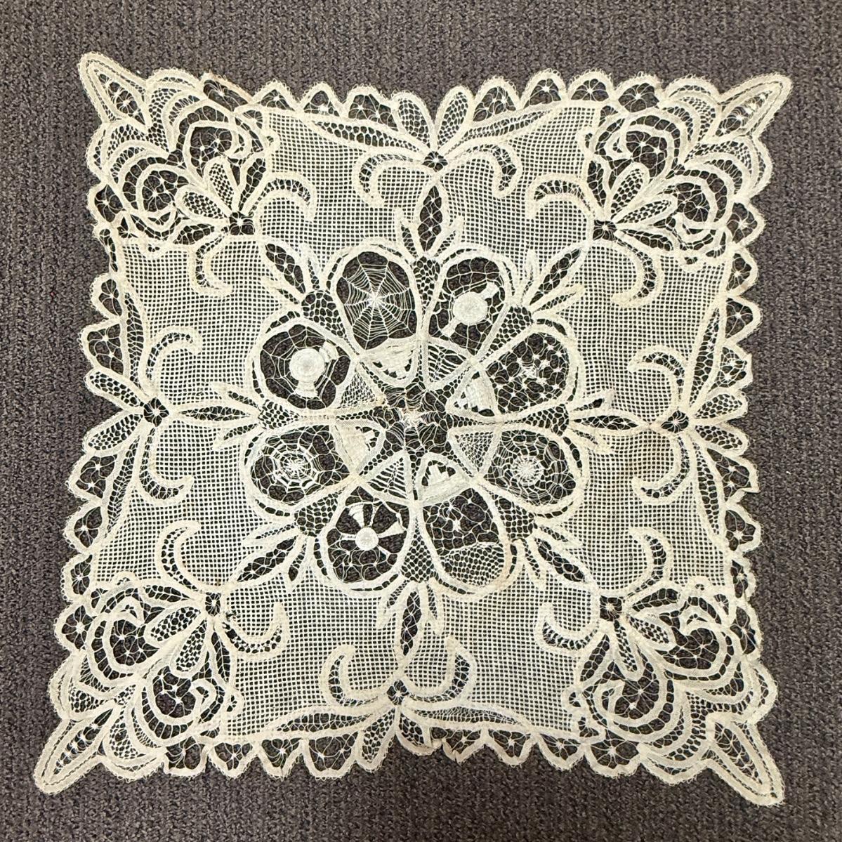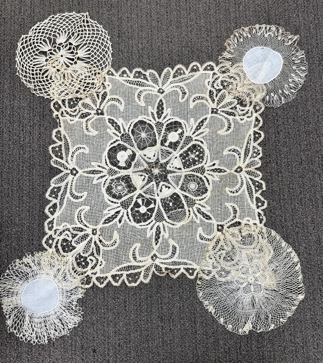 Antique Line Lot. - 5 pieces - large square table cover and 4 round doilies
