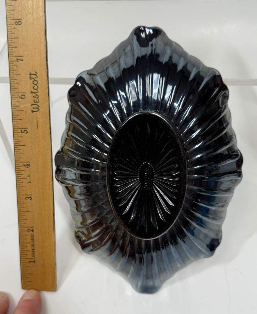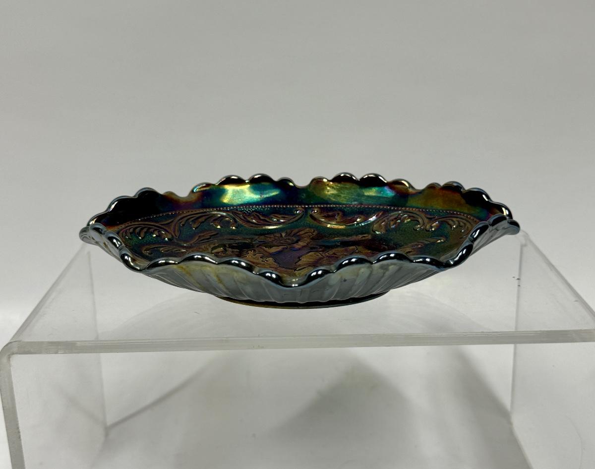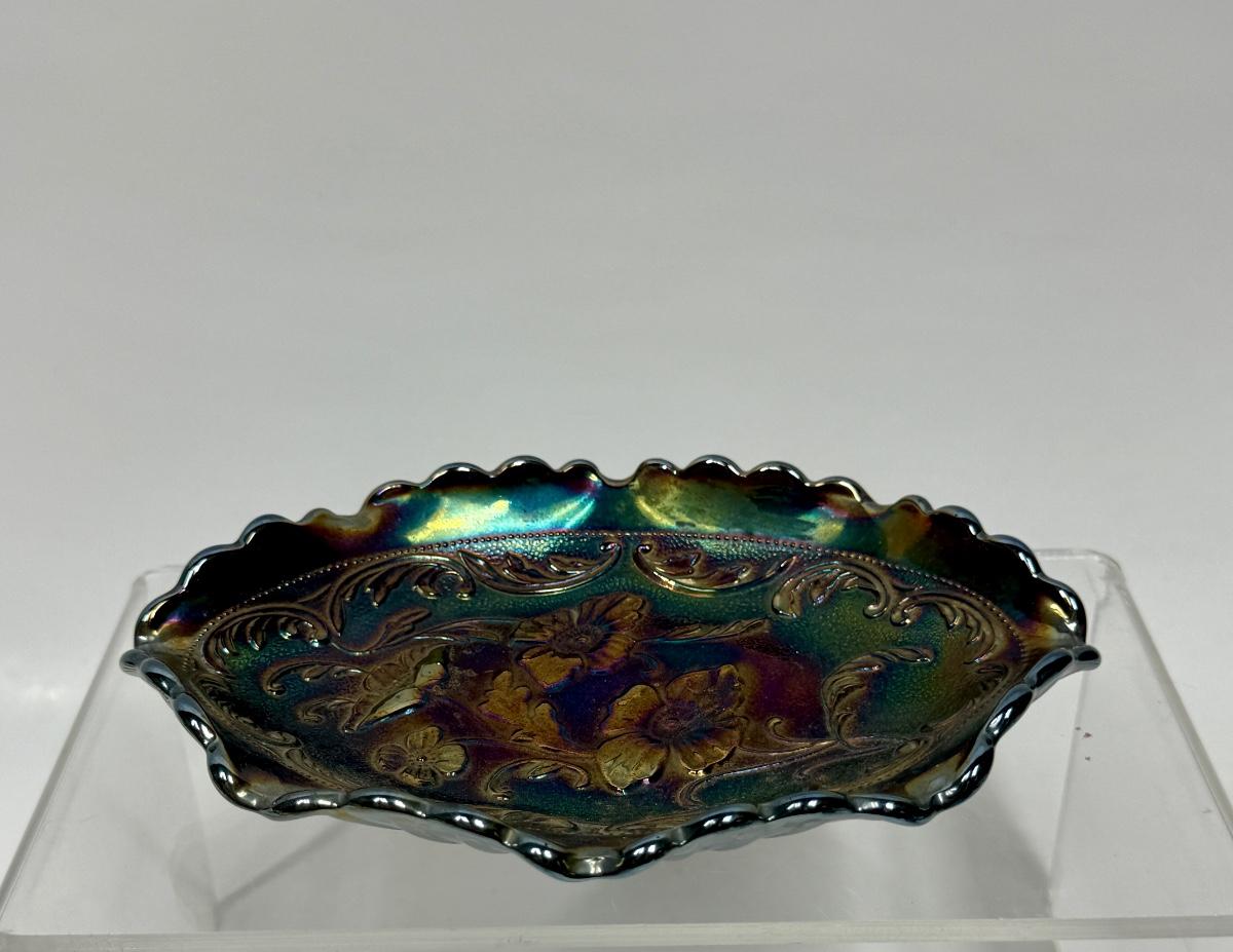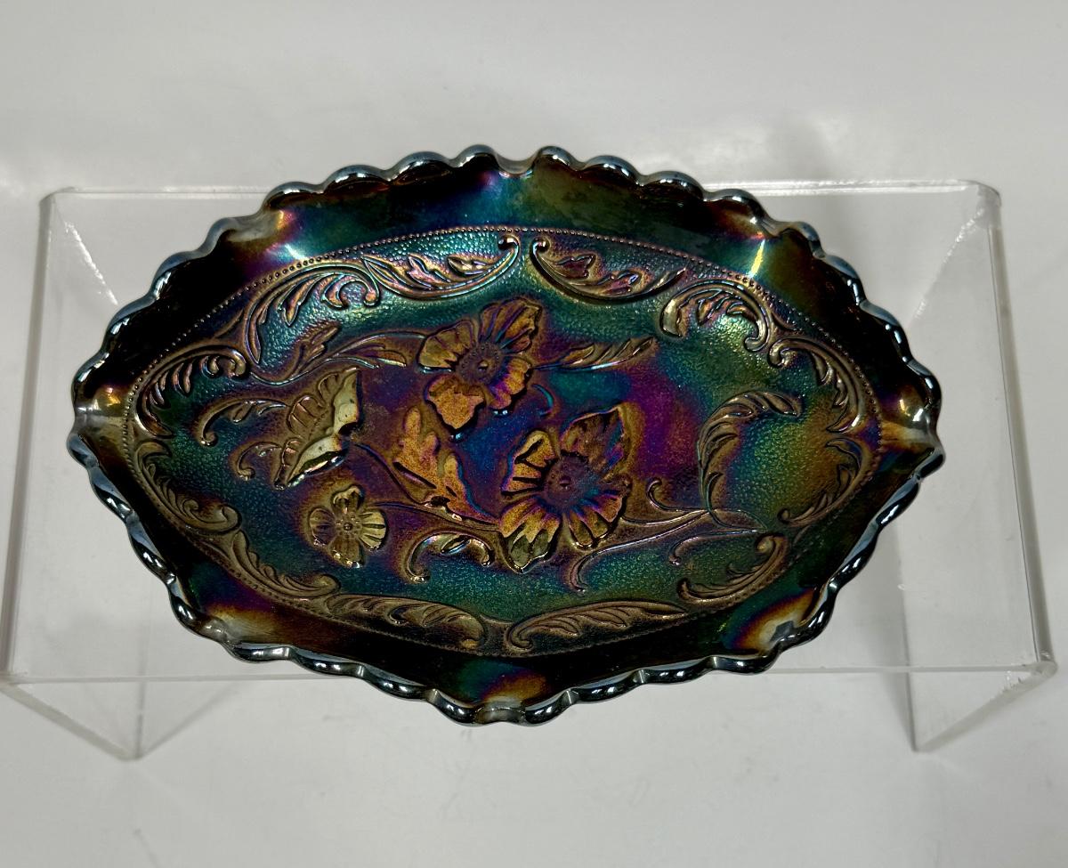 Fenton Opalescent Oval Dish with Scalloped Rim Amethyst Carnival Glass Poppy Flower Design Greens Purples, Blues