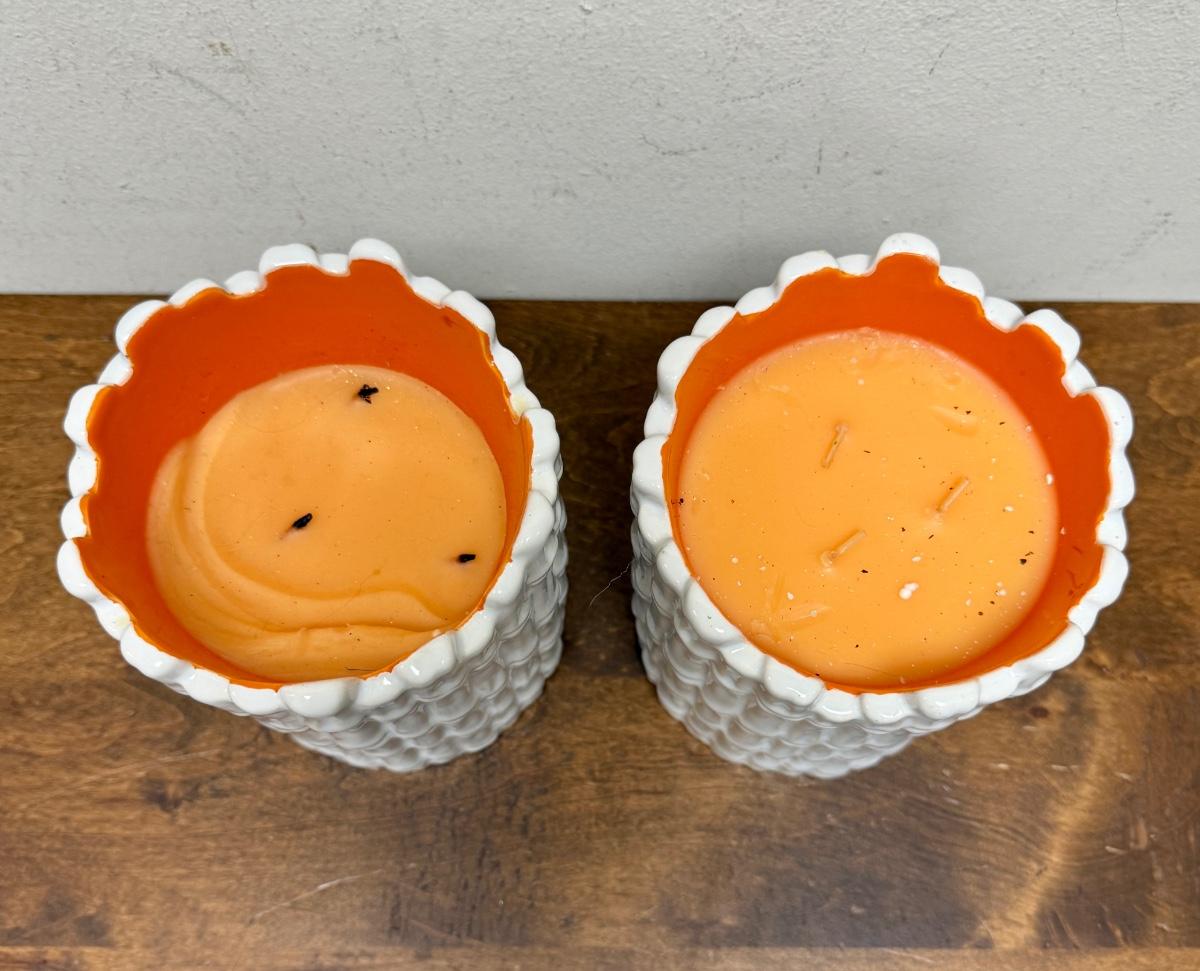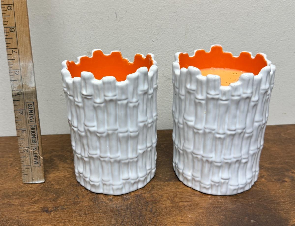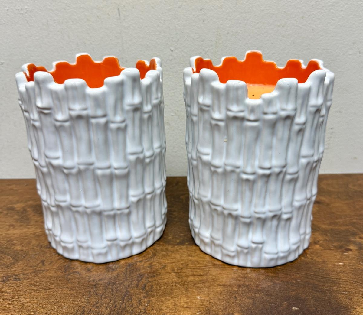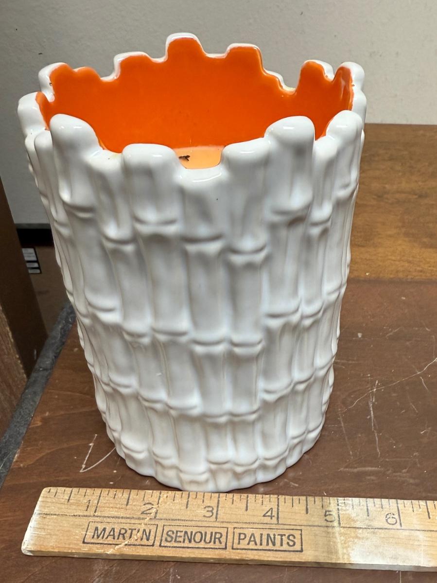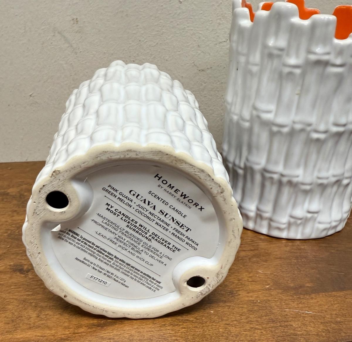 Real orange color wax candles inside white ceramic bamboo-themed holders. Approx. 6.5" tall x 4.5" across. Scented candles with a Guava fragrance.