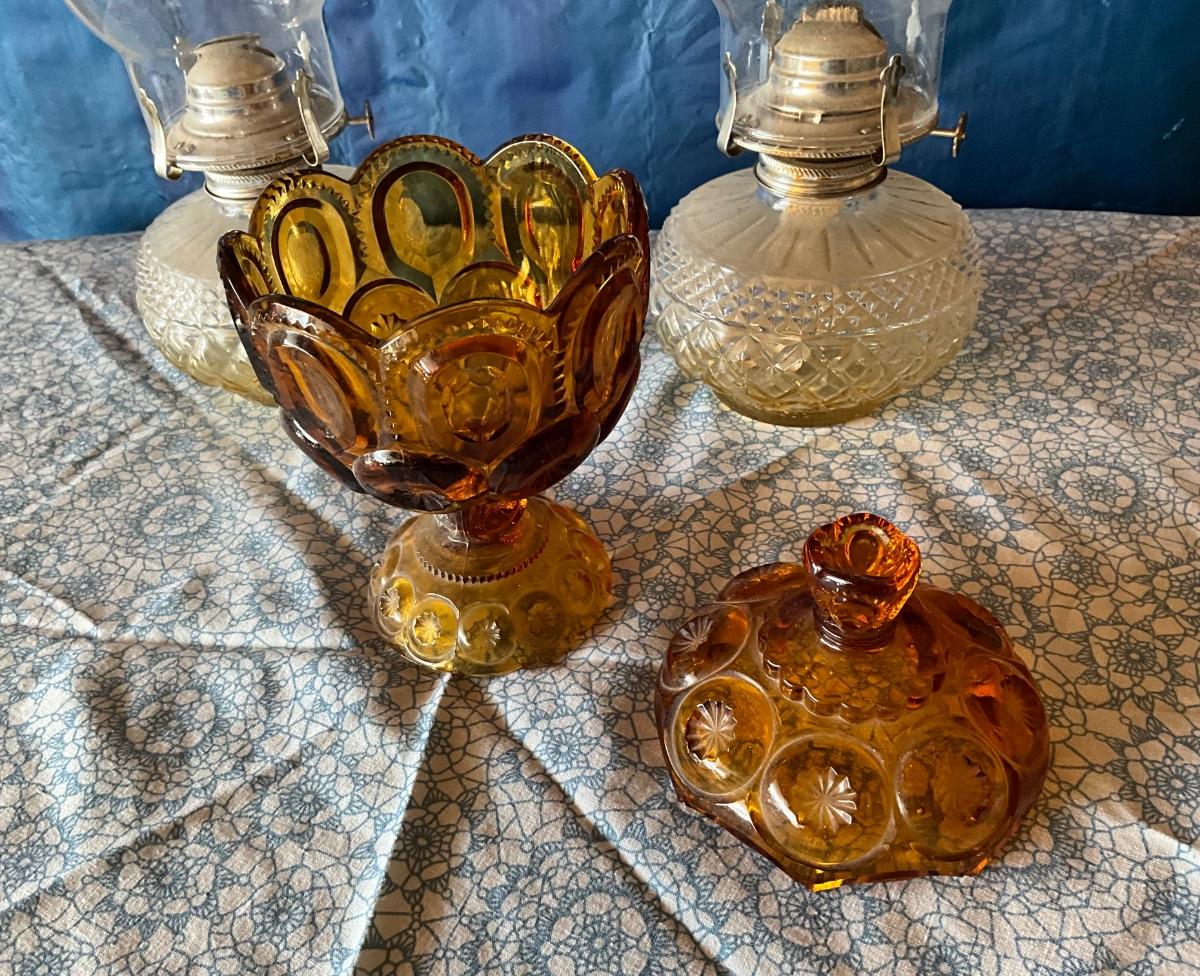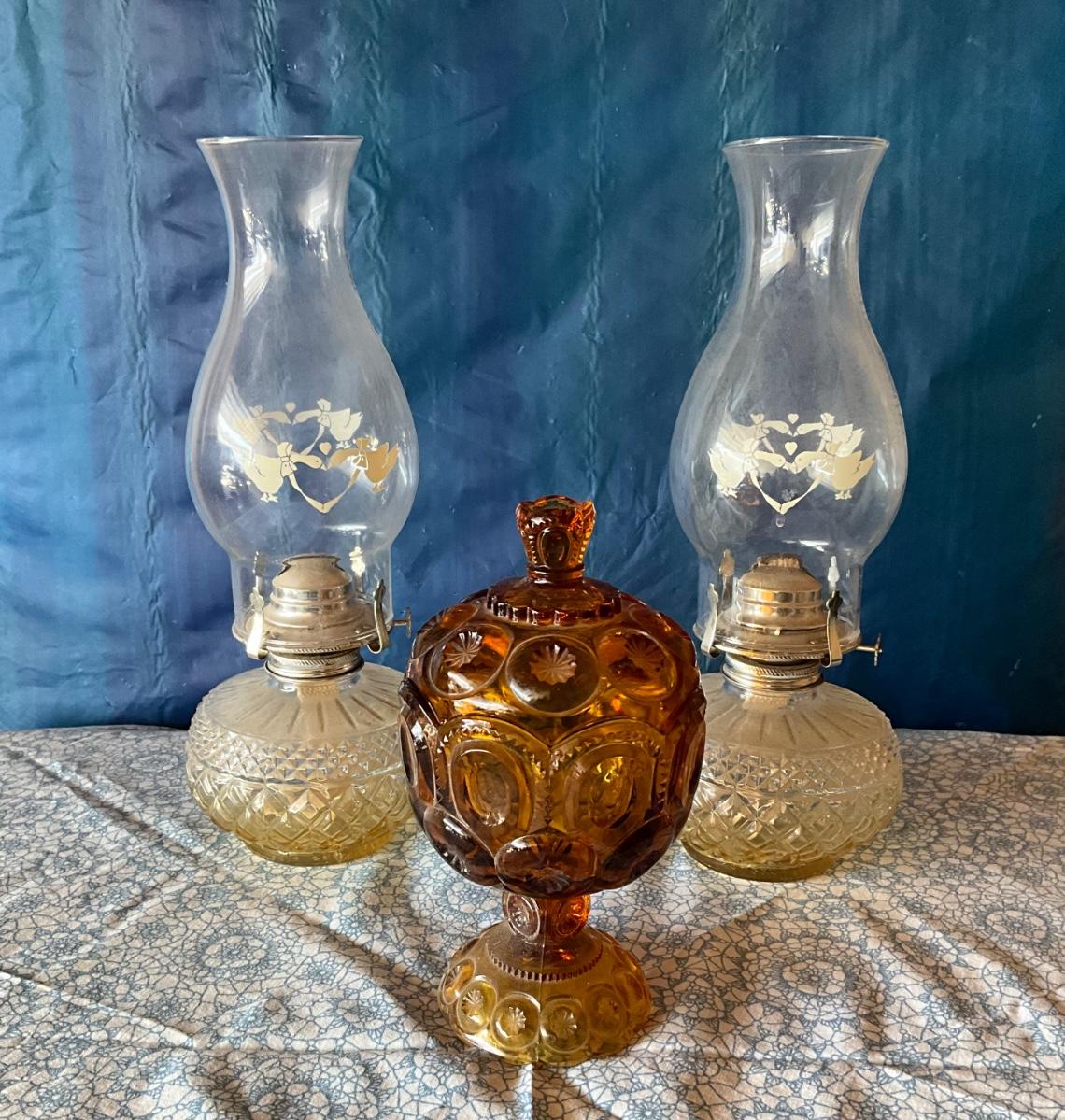 Vintage Kanawha Amber Glass Candy Dish, 2 Vintage Oil Burning Lamps