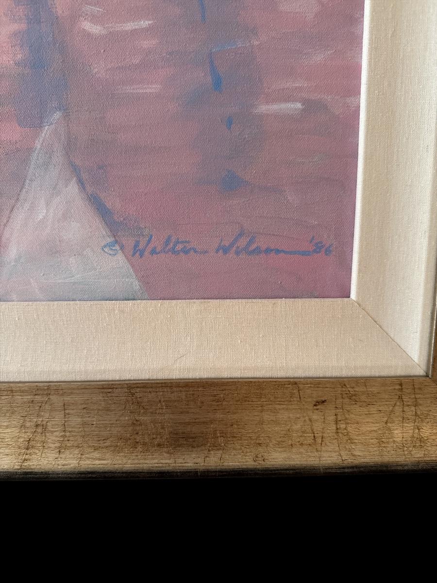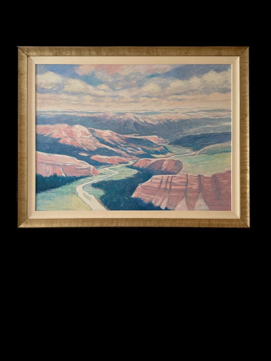 Striking landscape oil painting by G. Walton Nelson, dated 1996. This expansive scene features a winding river cutting through a vibrant canyon with distant mountains under a soft, cloud-filled sky. The artist’s palette includes rich pinks, greens, and blues, capturing the drama and tranquility of the Western landscape. Elegantly presented in a neutral linen liner with a gold-toned wood frame.